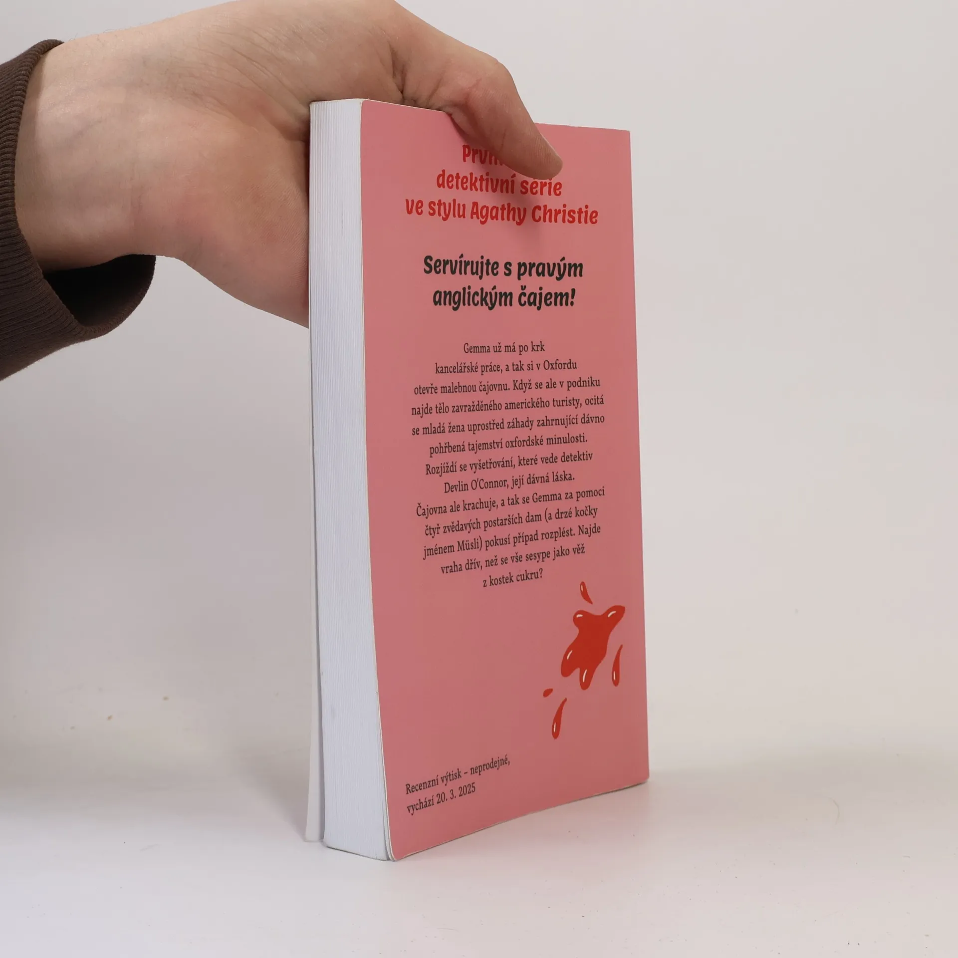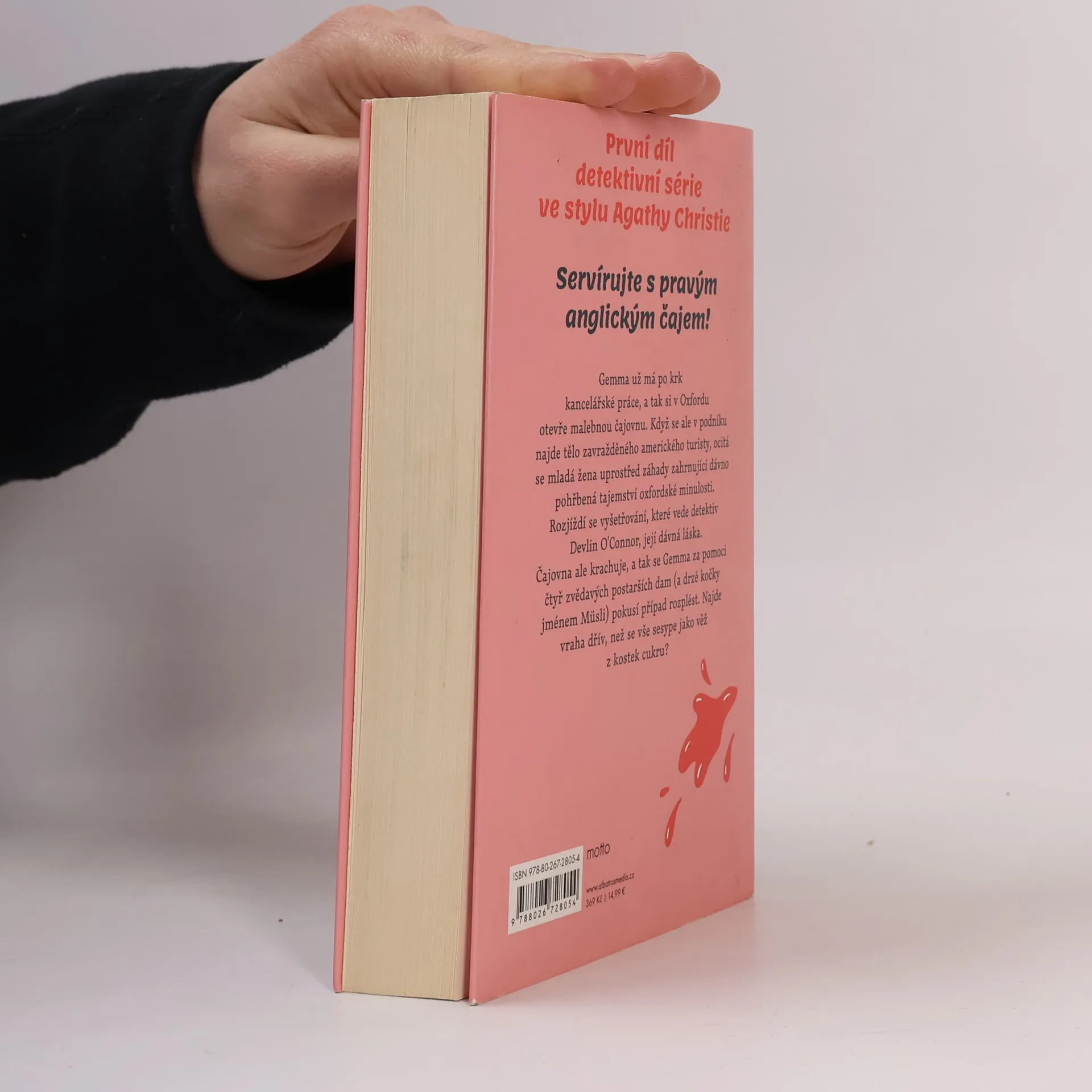 Záhady oxfordské čajovny. První díl detektivní série ve stylu Agathy Christie. Servírujte s pravým anglickým čajem! Gemma už má po krk kancelářské práce, a tak si v Oxfordu otevře malebnou čajovnu. Když se ale v podniku najde tělo zavražděného amerického turisty, ocitá se mladá žena uprostřed záhady zahrnující dávno pohřbená tajemství oxfordské minulosti. Rozjíždí se vyšetřování, které vede detektiv Devlin O’Connor, její dávná láska. Čajovna ale krachuje, a tak se Gemma za pomoci čtyř zvědavých postarších dam (a drzé kočky jménem Musli) pokusí případ rozplést. Najde vraha dřív, než se vše sesype jako věž z kostek cukru?