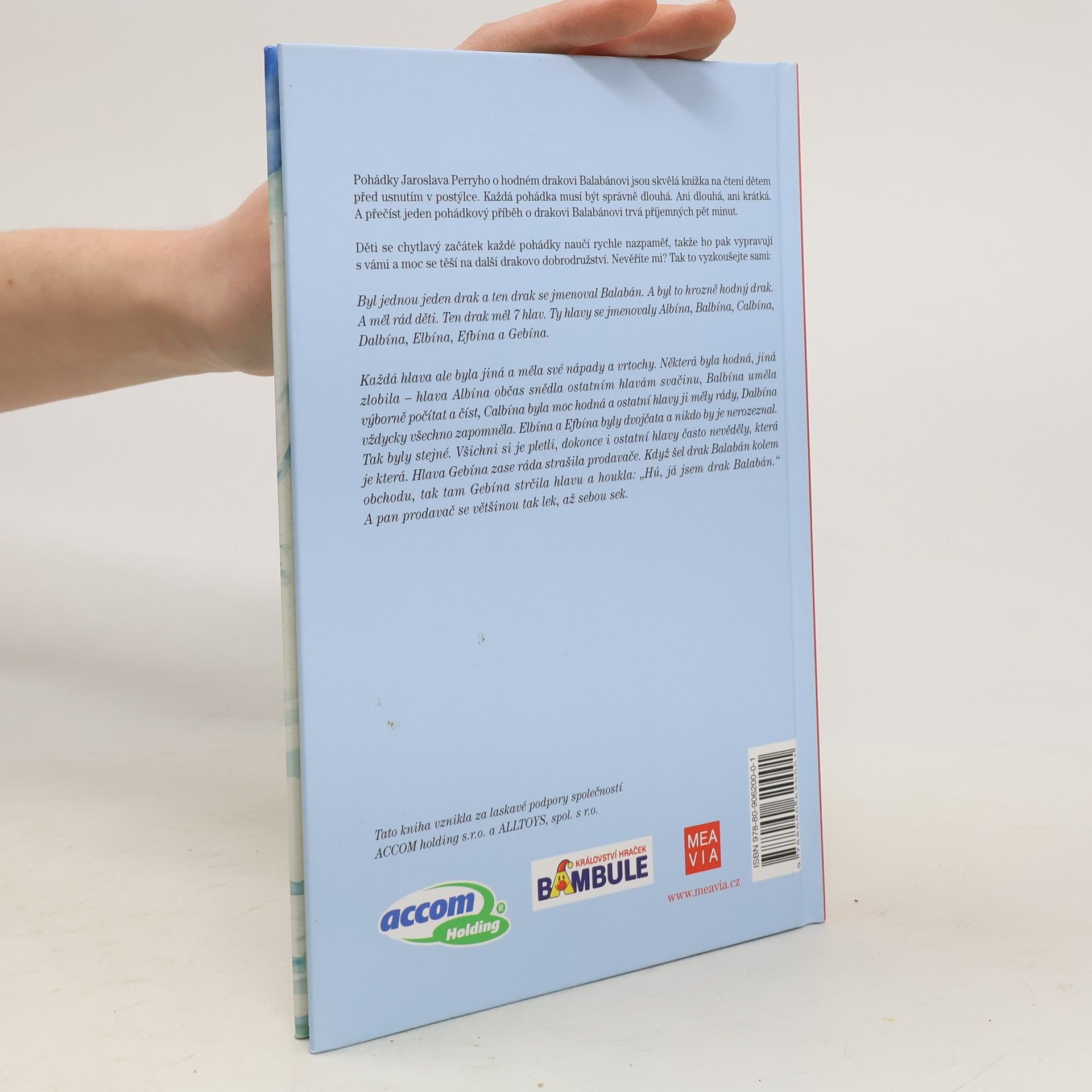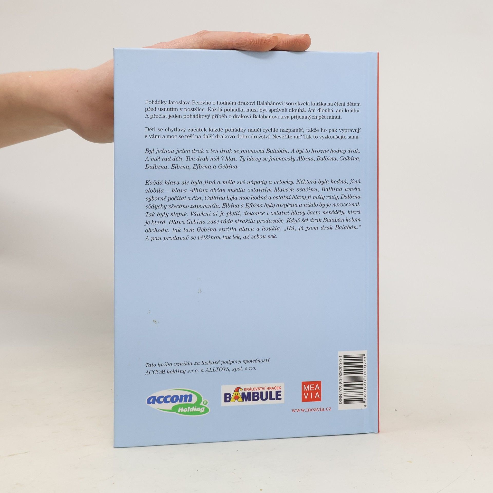 Pohádky Jaroslava Perryho o hodném drakovi Balabánovi jsou skvělá knížka na čtení dětem před usnutím v postýlce. Každá pohádka musí být správně dlouhá. Ani dlouhá, ani krátká. A přečíst jeden pohádkový příběh o drakovi Balabánovi trvá příjemných pět minut. Děti se chytlavý začátek každé pohádky naučí rychle nazpaměť, takže ho pak vypravují s vámi a moc se těší na další drakovo dobrodružství. Nevěříte mi? Tak to vyzkoušejte sami: Byl jednou jeden drak a ten drak se jmenoval Balabán. A byl to hrozně hodný drak. A měl rád děti. Ten drak měl 7 hlav. Ty hlavy se jmenovaly Albína, Balbína, Calbína, Dalbína, Elbína, Efbína a Gebína.Každá hlava ale byla jiná a měla své nápady a vrtochy. Některá byla hodná, jiná zlobila – hlava Albína občas snědla ostatním hlavám svačinu, Balbína uměla výborně počítat a číst, Calbína byla moc hodná a ostatní hlavy ji měly rády, Dalbína vždycky všechno zapomněla. Elbína a Efbína byly dvojčata a nikdo by je nerozeznal. Tak byly stejné. Všichni si je pletli, dokonce i ostatní hlavy často nevěděly, která je která. Hlava Gebína zase ráda strašila prodavače. Když šel drak Balabán kolem obchodu, tak tam Gebína strčila hlavu a houkla: „Hú, já jsem drak Balabán.“ A pan prodavač se většinou tak lek, až sebou sek.