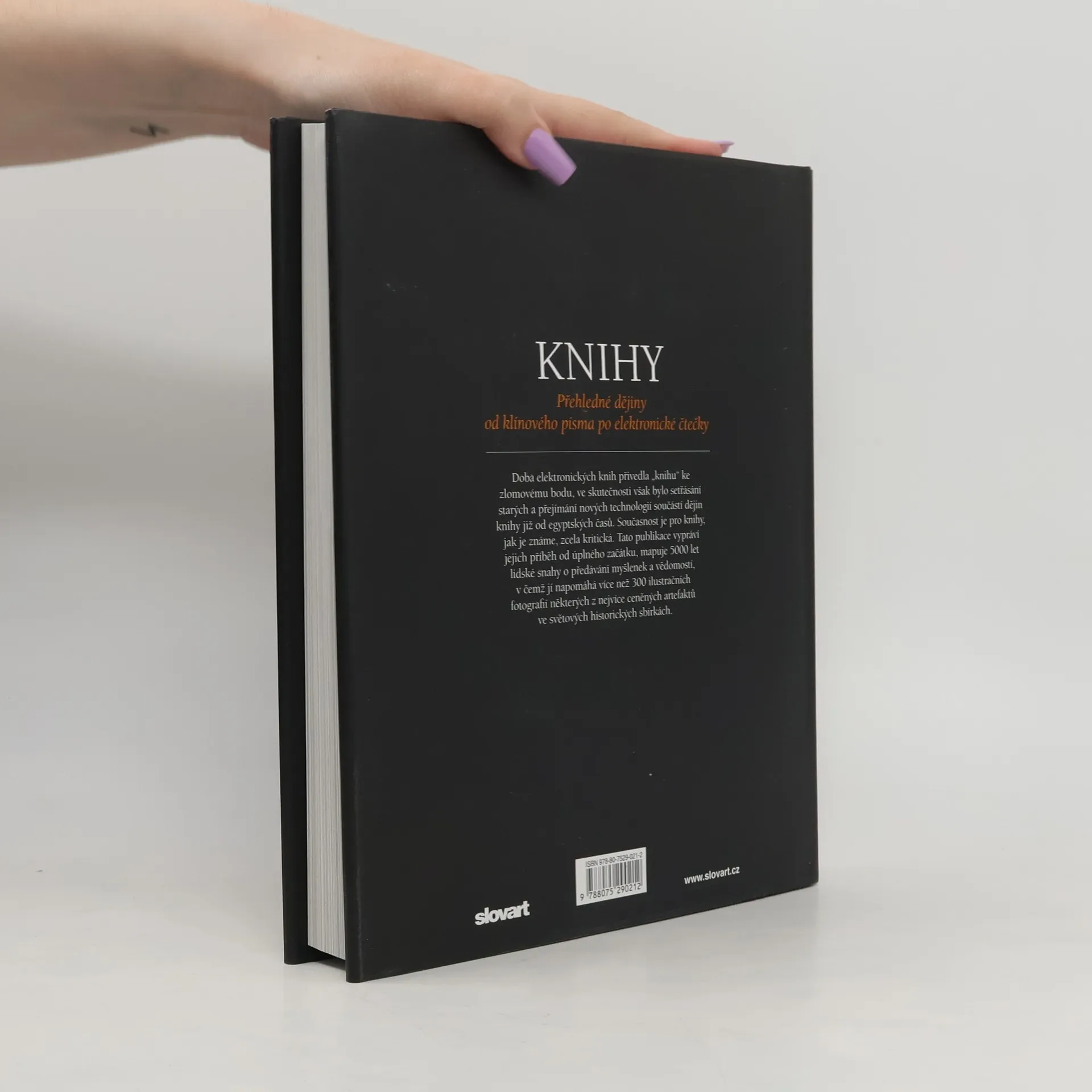 Doba elektronických knih přivedla „knihu" ke zlomovému bodu, ve skutečnosti však bylo setřásání starých a přejímání nových technologií součástí dějin knihy již od egyptských časů. Současnost je pro knihy, jak je známe, zcela kritická a tato publikace vypráví jejich příběh od úplného začátku. Knihy mapují 5000 let lidské snahy o předávání myšlenek a vědomostí, v čemž jí napomáhá více než 300 ilustračních fotografií některých z nejvíce ceněných artefaktů ve světových historických sbírkách.