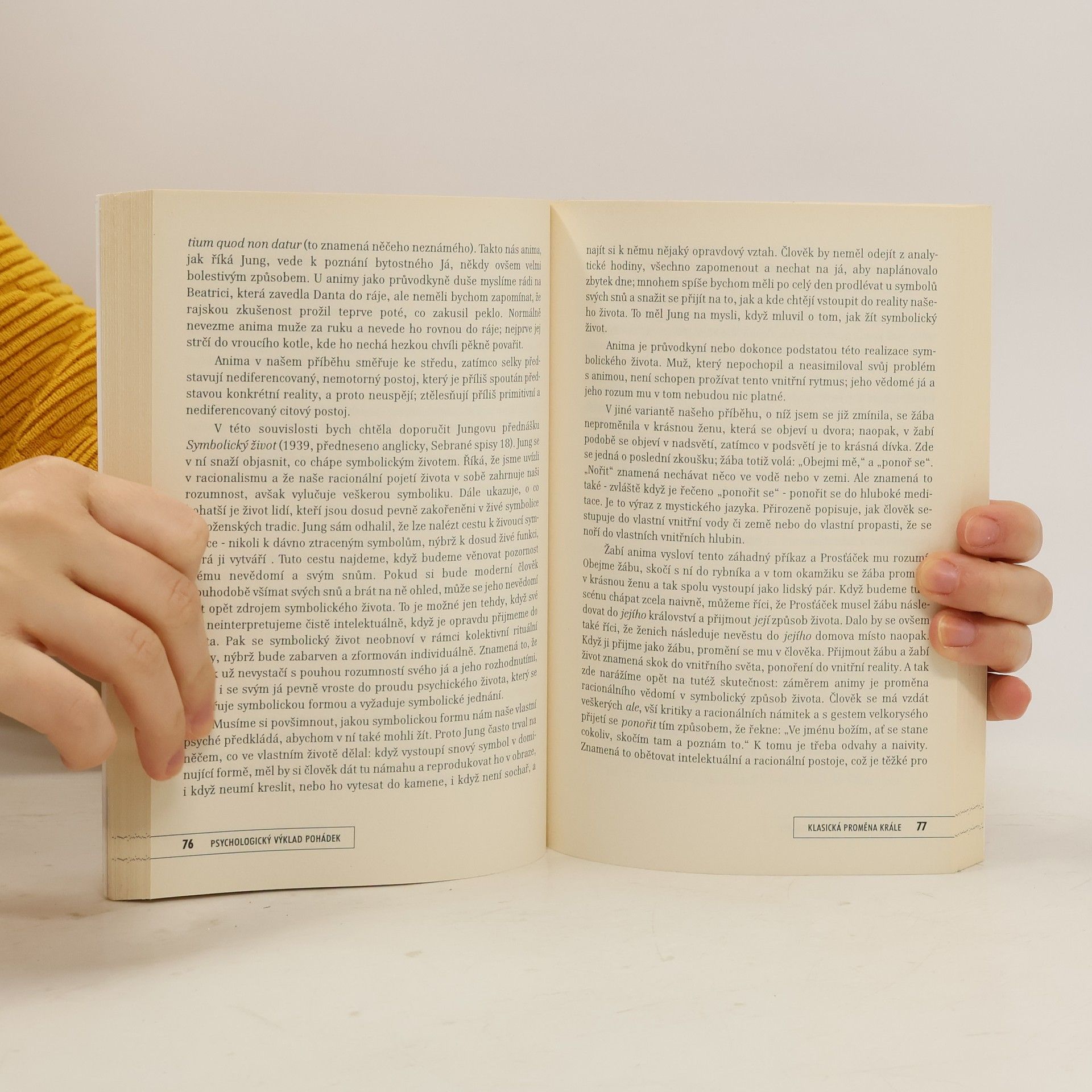Podtitul: Smysl pohádkových vyprávění podle jungovské archetypové psychologie V pohádkových příbězích a v osudech jejich hrdinů je člověk po staletí v symbolické podobě konfrontován s obtížemi a nebezpečími, kterým je sám v životě vystaven. M. L. von Franz ve svém, dnes již klasickém díle, interpretuje pohádková vyprávění na základě jednotlivých archetypů hlubinné psychologie a odkrývá tak v příbězích jejich uzdravující a stabilizační roli pro životní cestu člověka. Jednotlivé pojmy psychologie C. G. Junga, jež jsou pro pochopení pohádek důležité, jsou názorně vysvětleny na řadě pohádkových příběhů. Kniha vznikla z přednášek, které měla autorka v sedmdesátých letech na Institutu C. G. Junga v Curychu. 4. vydání