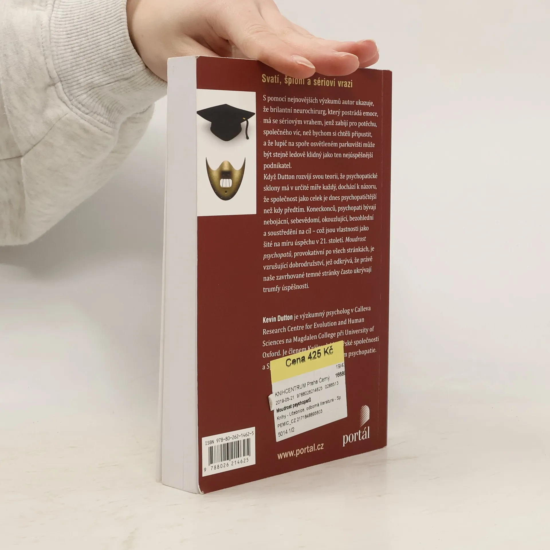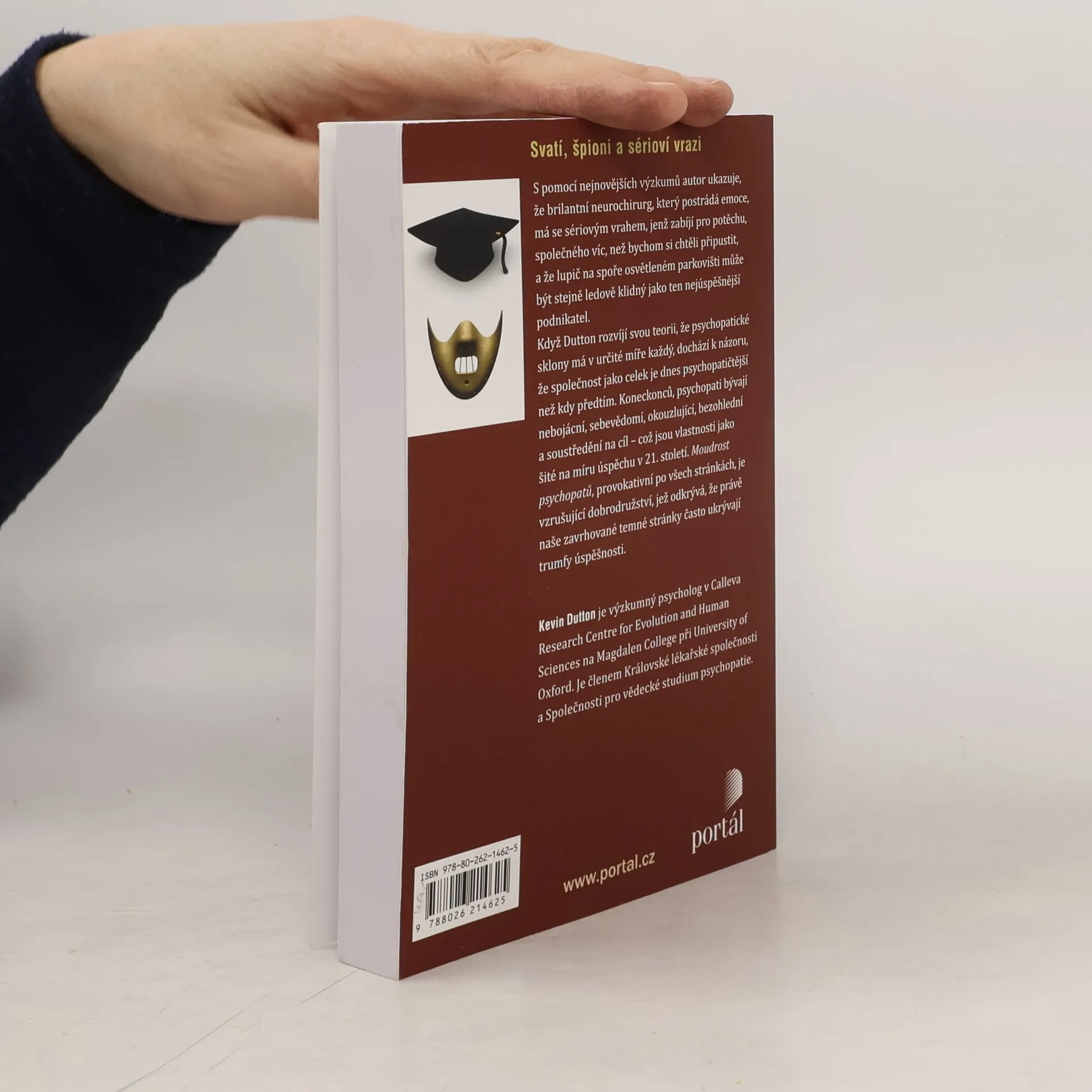 Na své strhující cestě do života psychopatů a jejich vychytralého chování známý oxfordský psycholog Kevin Dutton odhaluje existenci stupnice „šílenství“, na níž má své místo každý z nás. S pomocí nejnovějších metod zobrazování mozku a rozvíjejících se neurověd ukazuje, že brilantní neurochirurg, postrádající empatii, má se sériovým vrahem, jenž zabíjí pro potěchu, společného víc, než bychom si chtěli připustit, a že lupič na spoře osvětleném parkovišti může být stejně ledově klidný jako ten nejúspěšnější podnikatel. Když autor rozvíjí svou teorii, že psychopatické sklony má v určité míře každý, dochází k názoru, že společnost jako celek je dnes psychopatičtější než kdy předtím. Koneckonců, psychopati bývají nebojácní, sebevědomí, okouzlující, bezohlední a soustředění na cíl – což jsou vlastnosti jak šité na míru úspěchu v 21. století. Moudrost psychopatů, provokativní po všech stránkách, je vzrušující dobrodružství, jež odkrývá, že právě naše zavrhované temné stránky často ukrývají trumfy úspěšnosti. Prof. Kevin Dutton je výzkumný psycholog v Calleva Research Centre for Evolution and Human Sciences na Magdalen College při Oxfordské univerzitě. Je členem Královské lékařské společnosti a Společnosti pro vědecké studium psychopatie. Česky vyšla též jeho kniha Psychopatův průvodce na cestě k úspěchu.