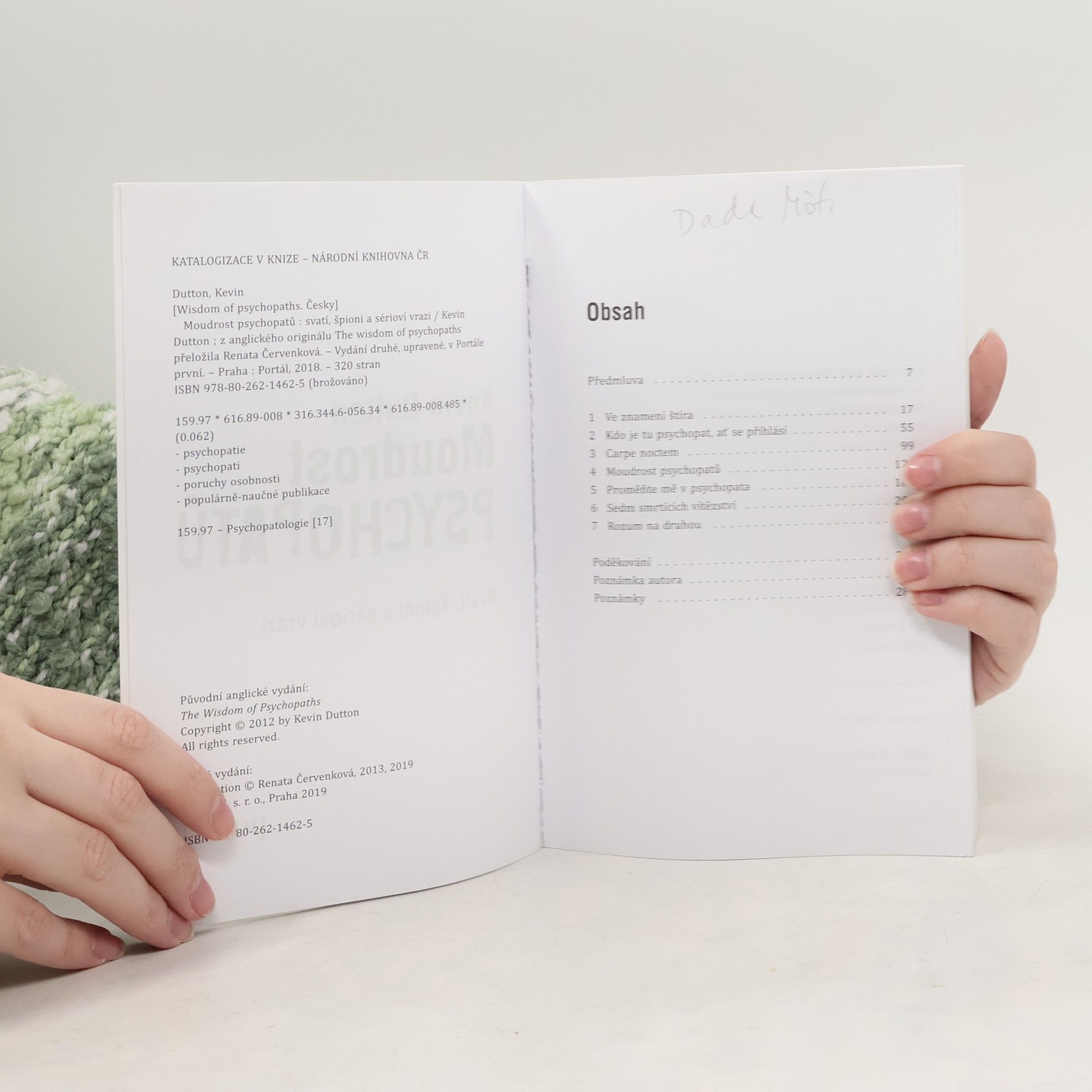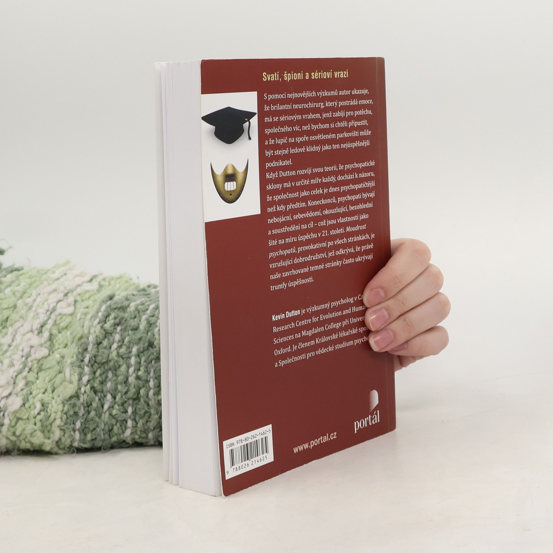 Na své strhující cestě do života psychopatů a jejich vychytralého chování známý oxfordský psycholog Kevin Dutton odhaluje existenci stupnice „šílenství“, na níž má své místo každý z nás. S pomocí nejnovějších metod zobrazování mozku a rozvíjejících se neurověd ukazuje, že brilantní neurochirurg, postrádající empatii, má se sériovým vrahem, jenž zabíjí pro potěchu, společného víc, než bychom si chtěli připustit, a že lupič na spoře osvětleném parkovišti může být stejně ledově klidný jako ten nejúspěšnější podnikatel. Když autor rozvíjí svou teorii, že psychopatické sklony má v určité míře každý, dochází k názoru, že společnost jako celek je dnes psychopatičtější než kdy předtím. Koneckonců, psychopati bývají nebojácní, sebevědomí, okouzlující, bezohlední a soustředění na cíl – což jsou vlastnosti jak šité na míru úspěchu v 21. století. Moudrost psychopatů, provokativní po všech stránkách, je vzrušující dobrodružství, jež odkrývá, že právě naše zavrhované temné stránky často ukrývají trumfy úspěšnosti. Prof. Kevin Dutton je výzkumný psycholog v Calleva Research Centre for Evolution and Human Sciences na Magdalen College při Oxfordské univerzitě. Je členem Královské lékařské společnosti a Společnosti pro vědecké studium psychopatie. Česky vyšla též jeho kniha Psychopatův průvodce na cestě k úspěchu.