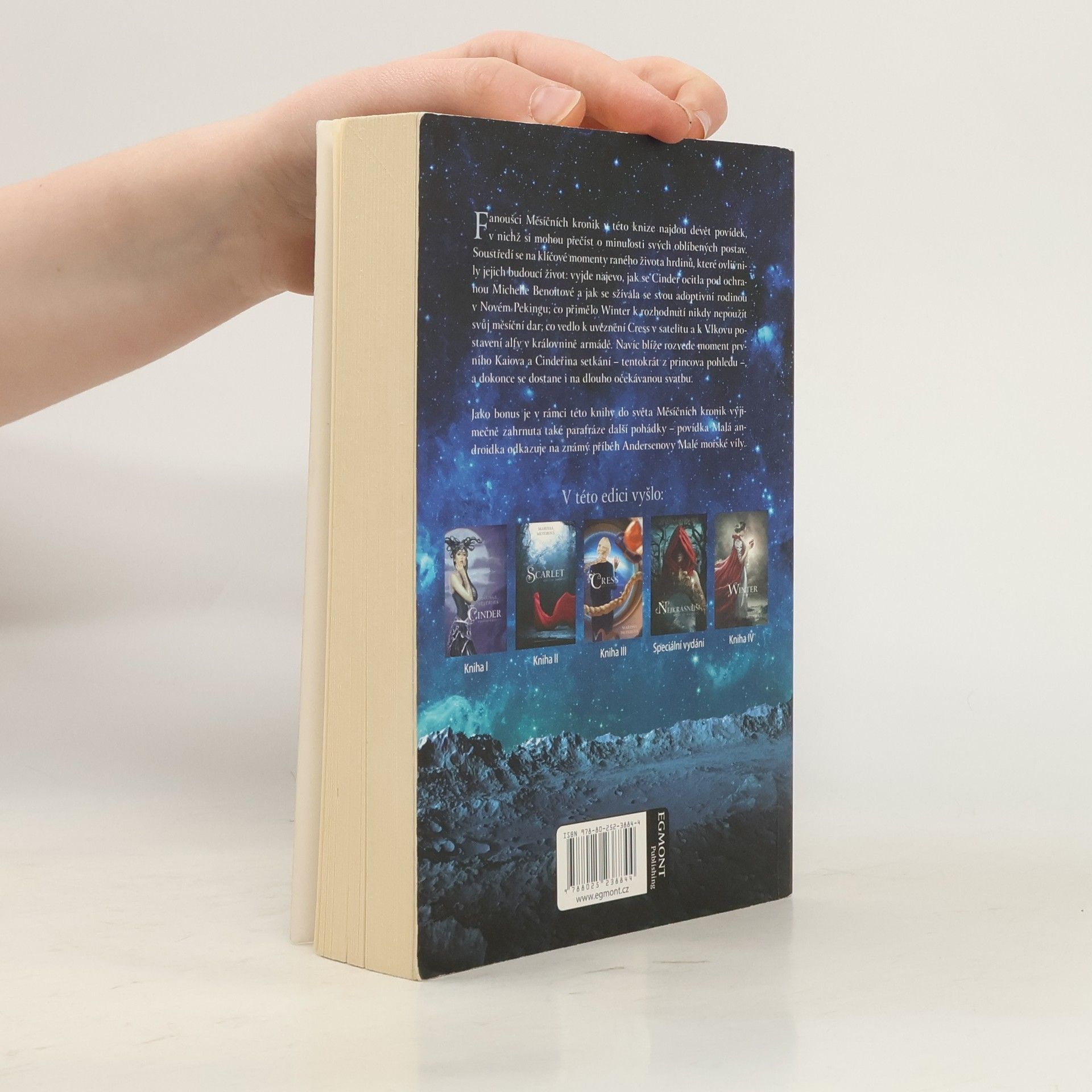 Označení v sérii - 4,5. Jak se Cinder ocitla pod ochranou Michelle Benoitové? Co přimělo Winter k rozhodnutí nikdy nepoužít svůj měsíční dar? A co vedlo k uvěznění Cress v satelitu a k Vlkovu postavení alfy v královnině armádě? Fanoušci Měsíčních kronik v této knize najdou devět povídek, v nichž si mohou přečíst o minulosti svých oblíbených postav. Soustředí se na klíčové momenty raného života hrdinů, které ovlivnily jejich budoucí život.