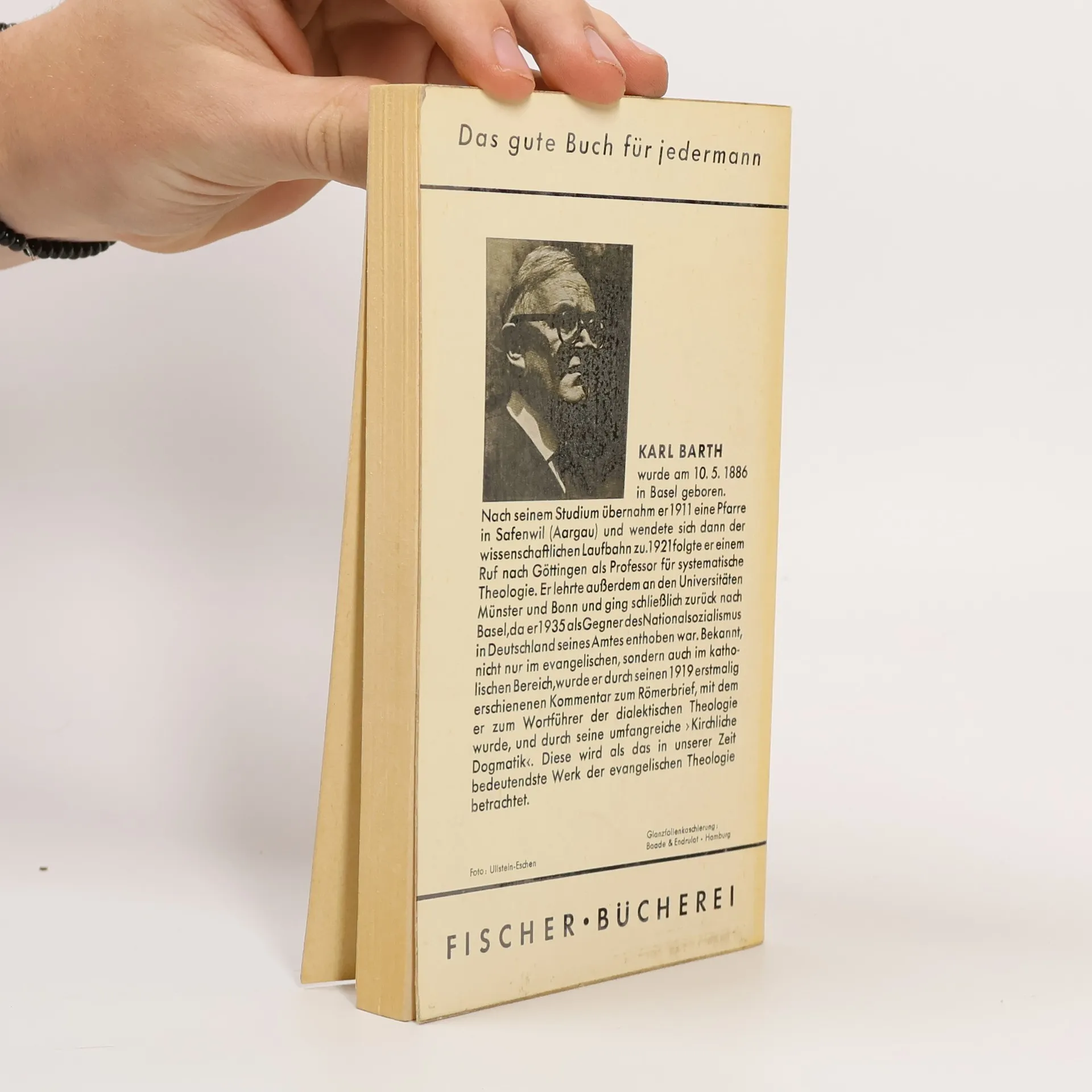 Karl Barth (1886–1968) studierte Theologie in Bern, Berlin, Tübingen, Marburg und war von 1909 bis 1921 Pfarrer in Genf und Safenwil. Mit seiner Auslegung des Römerbriefes (1919, 1922) begann eine neue Epoche der evangelischen Theologie. Dieses radikale Buch trug ihm einen Ruf als Honorarprofessor nach Göttingen ein, später wurde er Ordinarius in Münster und Bonn. Er war Mitherausgeber von 'Zwischen den Zeiten' (1923–1933), der Zeitschrift der 'Dialektischen Theologie'. Karl Barth war der Autor der 'Barmer Theologischen Erklärung' und Kopf des Widerstands gegen die 'Gleichschaltung' der Kirchen durch den Nationalsozialismus. 1935 wurde Barth von der Bonner Universität wegen Verweigerung des bedingungslosen Führereids entlassen. Er bekam sofort eine Professur in Basel, blieb aber mit der Bekennenden Kirche in enger Verbindung. Sein Hauptwerk, 'Die Kirchliche Dogmatik', ist die bedeutendste systematisch-theologische Leistung des 20. Jahrhunderts.