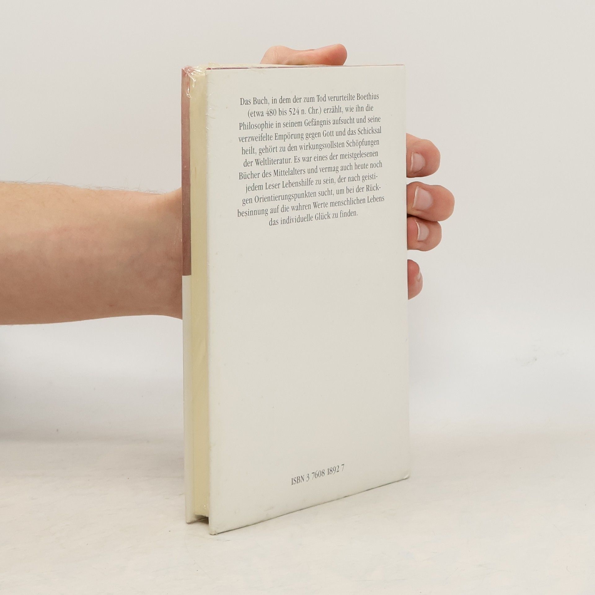 Anicius Manlius Severinus Boethius: Die Trostungen der Philosophie Edition Holzinger. Taschenbuch Berliner Ausgabe, 2013 Vollstandiger, durchgesehener Neusatz mit einer Biographie des Autors bearbeitet und eingerichtet von Michael Holzinger Entstanden um 523. Erstdruck unter dem Titel De consolatione philosophiae, Savigliano(?) 1470. Erste (fruhneuhoch-)deutsche Ubersetzung (anonym) unter dem Titel Das puech von dem trost der weisshait des maiesters Boecy, Nurnberg 1473. Der Text folgt der Ubersetzung durch Richard Scheven von 1893. Textgrundlage ist die Ausgabe: Boetius: Die Trostungen der Philosophie. Ubersetzt von Richard Scheven, Leipzig: Philipp Reclam jun., o.J. Herausgeber der Reihe: Michael Holzinger Reihengestaltung: Viktor Harvion Umschlaggestaltung unter Verwendung des Bildes: Boethius erteilt Unterricht. Initiale der Handschrift Glasgow, University Library, Hunter 374 aus dem Jahr 1385 Gesetzt aus Minion Pro, 10 pt
