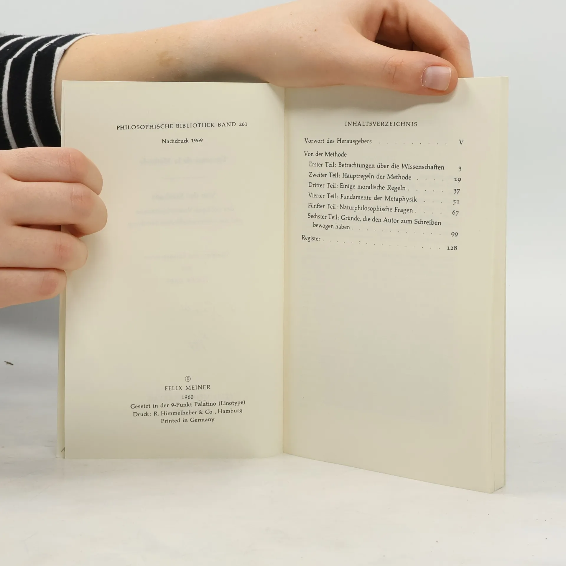 Der Discours de la méthode, 1637 anonym publiziert, gilt als das erste und wirkmächtigste Manifest des neuzeitlichen Rationalismus und wissenschaftlichen Methodenbewußtseins. Im Sinne eines „Vorberichts“ entwickelt Descartes in seiner ersten Druckschrift die Regeln eines konsequenten, am Vorbild der Mathematik orientierten Verstandesgebrauchs: die von ihm begründete und später weiter ausgeführte Methode des radikalen Zweifels. Der französische Text folgt der großen Standardausgabe der WerkeDescartes von Adam und Tannery, lediglich die Orthographie wurde modernisiert. Die Neuübersetzung des Textes durch L. Gäbe erfolgte unter Heranziehung der älteren Übersetzungen von A. Buchenau und K. Fischer und unter Benutzung des Kommentars von É. Gilson. Gelegentliche Hinweise beziehen sich auf die von Descartes anerkannte lateinische Version in den „Specimina philosophica“. Für die zweite Auflage wurde der Text durchgesehen und mit Registern und einer Bibliographie versehen.