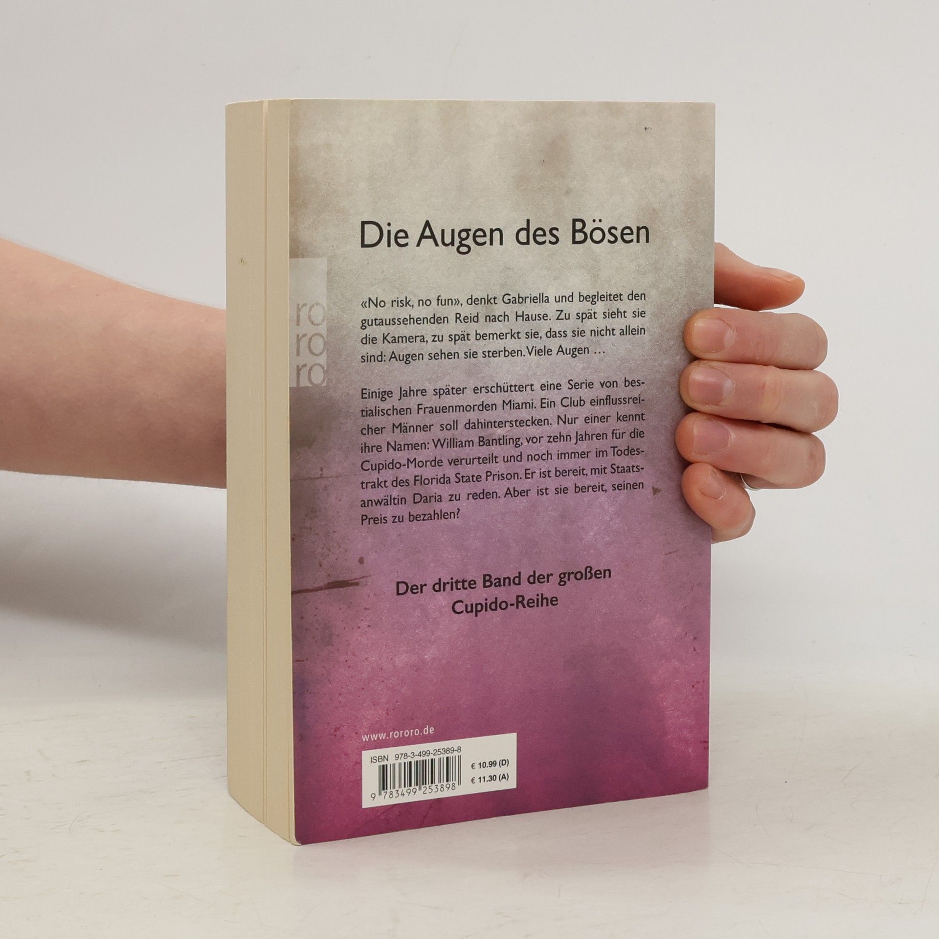 Die Augen des Bösen«No risk, no fun», denkt Gabriella und begleitet den gutaussehenden Reid nach Hause. Zu spät sieht sie die Kamera, zu spät bemerkt sie, dass sie nicht allein sind: Augen sehen sie sterben. Viele Augen …Einige Jahre später erschüttert eine Serie von bestialischen Frauenmorden Miami. Ein Club einflussreicher Männer soll dahinterstecken. Nur einer kennt ihre Namen: William Bantling, vor zehn Jahren für die Cupido-Morde verurteilt und noch immer im Todestrakt des Florida State Prison. Er ist bereit, mit Staatsanwältin Daria zu reden. Aber ist sie bereit, seinen Preis zu bezahlen?Der dritte Band der großen Cupido-Reihe.