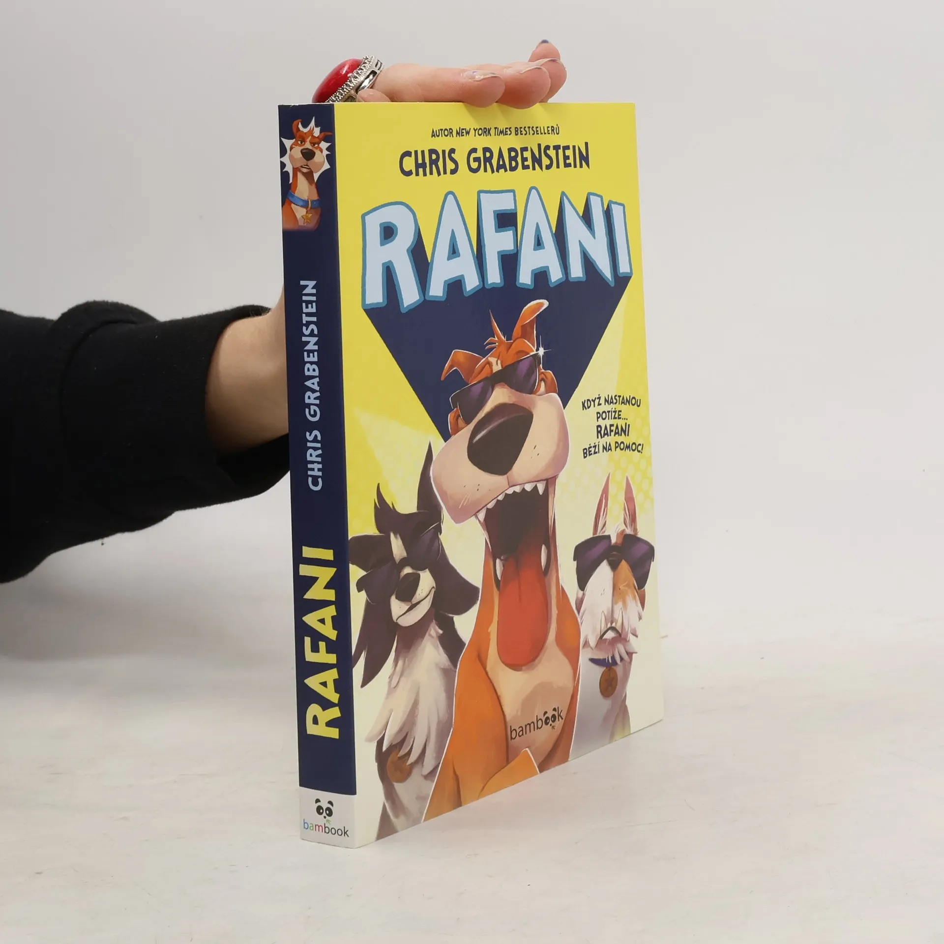 Nic není příliš nebezpečné… pro Rafany! Připravte se na RAFANY! Štěňata se topí? ZÁKEŘNÝ DOKTOR slídí po tajných informacích? MIMOZEMSKÉ VEVERKY útočí na Zemi? To smrdí průšvihem. Někdo by měl radši zavolat RAFANY! FRED, odrbaný toulavý pes, který hledá milující domov, si přeje, aby byl víc jako jeho hrdinové z populárního televizního seriálu Rafani. Ale on není ODVÁŽNÝ ani STATEČNÝ… Je jen obyčejný pes. Fred se ale výrazně podobá BARONOVI, hlavní hvězdě Rafanů. A jakmile Baron potřebuje dvojníka, je Fred dokonalou volbou. Může se ustrašený pes stát filmovým HRDINOU? A co teprve v opravdovém světě plném NÁSTRAH? Zvládnou Fred a ostatní Rafani překonat SKUTEČNÉ NEBEZPEČÍ? Zakousněte se do ZLODUCHŮ v tomto PACKÓZNÍM dobrodružství, z kterého se POTRHÁTE smíchy.