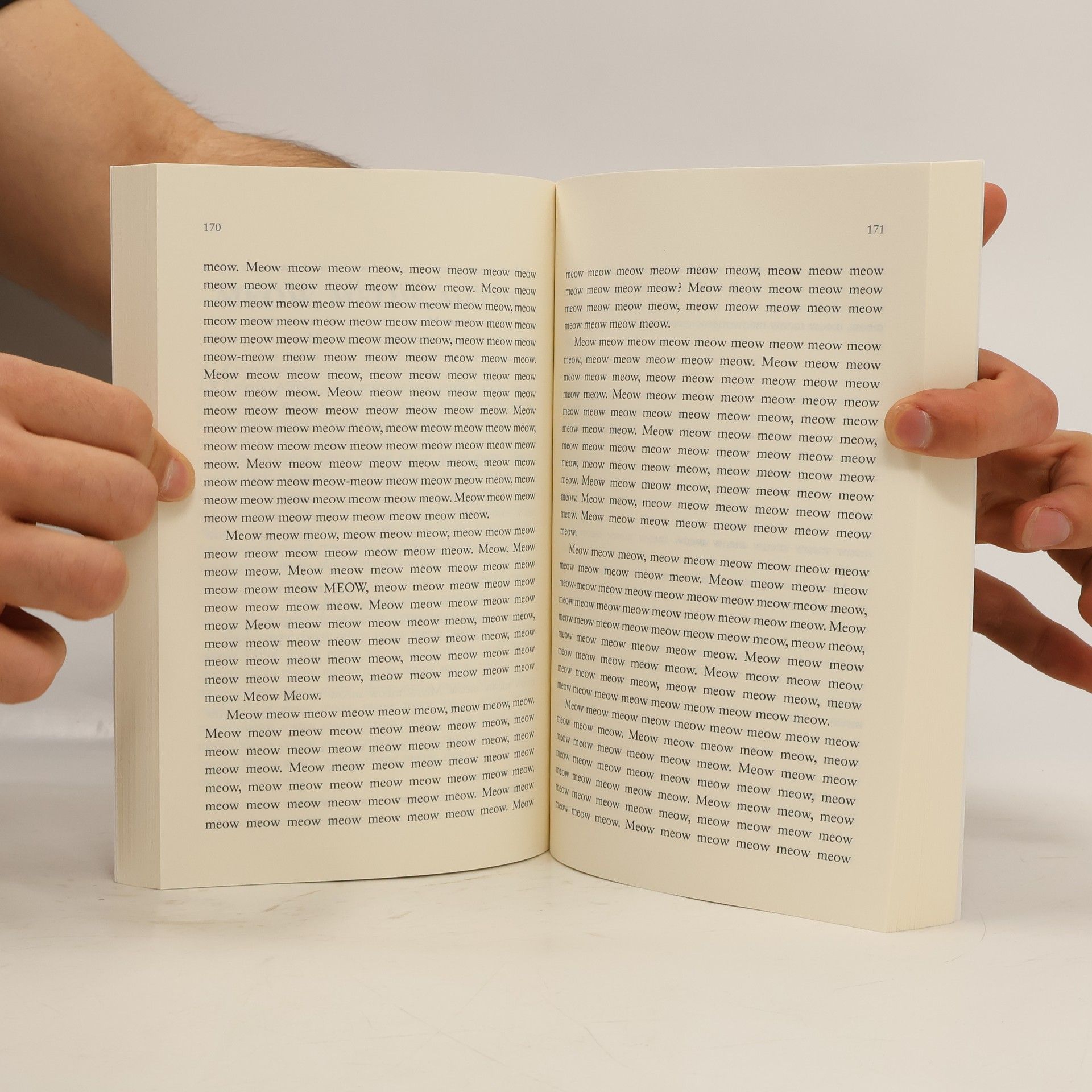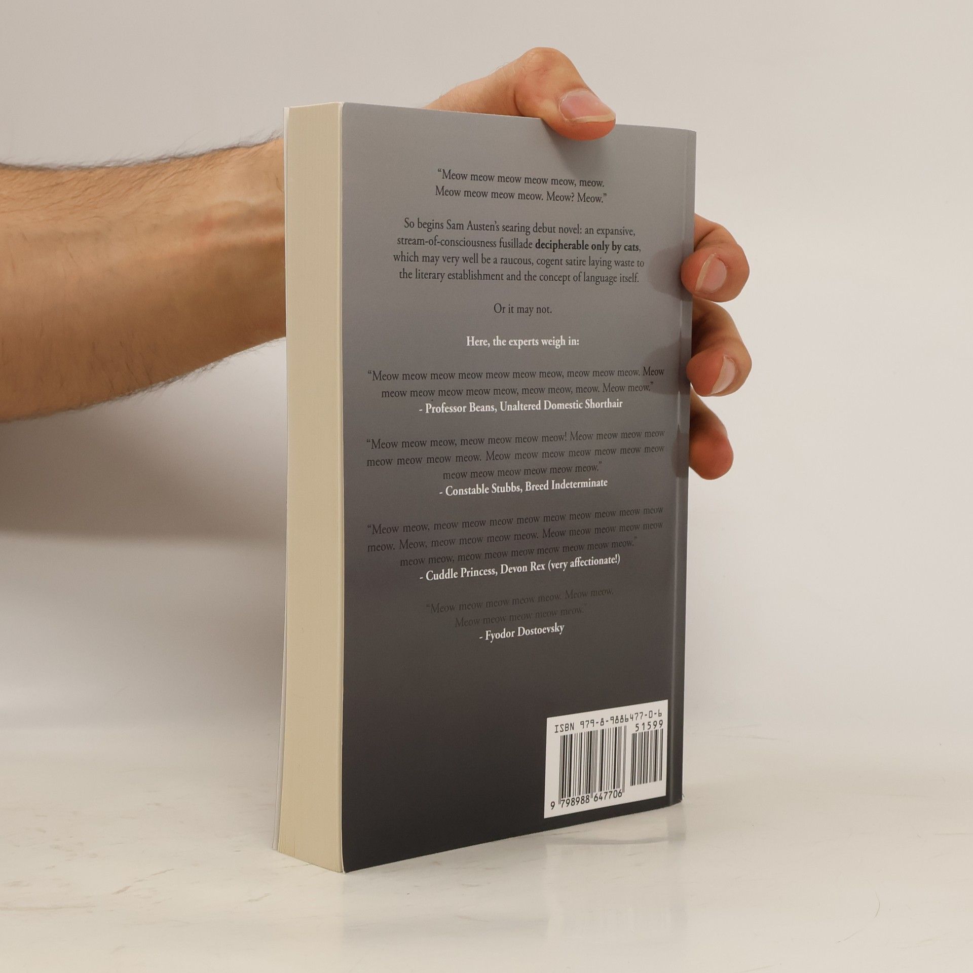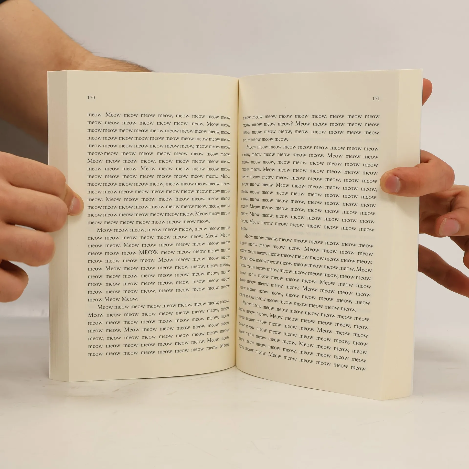 A novel for your cat, written in its native language. The word "meow" repeated over 80,000 times, to rapturous effect. Publisher's description: "Meow meow meow meow meow, meow. Meow meow meow meow. Meow? Meow." So begins Sam Austen's searing debut novel: an expansive, stream-of-consciousness fusillade decipherable only by cats, which may very well be a raucous, cogent satire laying waste to the literary establishment and the concept of language itself. Or it may not. Here, the experts weigh in: "Meow meow meow meow meow meow meow, meow meow meow. Meow meow meow meow meow meow, meow meow, meow. Meow meow." - Professor Beans, Unaltered Domestic Shorthair "Meow meow meow, meow meow meow meow! Meow meow meow meow meow meow meow meow. Meow meow meow meow meow meow meow meow meow meow meow meow meow." - Constable Stubbs, Breed Indeterminate "Meow meow, meow meow meow meow meow meow meow meow meow meow. Meow, meow meow meow meow. Meow meow meow meow meow meow meow, meow meow meow meow meow meow meow." -Cuddle Princess, Devon Rex (very affectionate!) "Meow meow meow meow meow. Meow meow. Meow meow meow meow meow meow." - Fyodor Dostoevsky