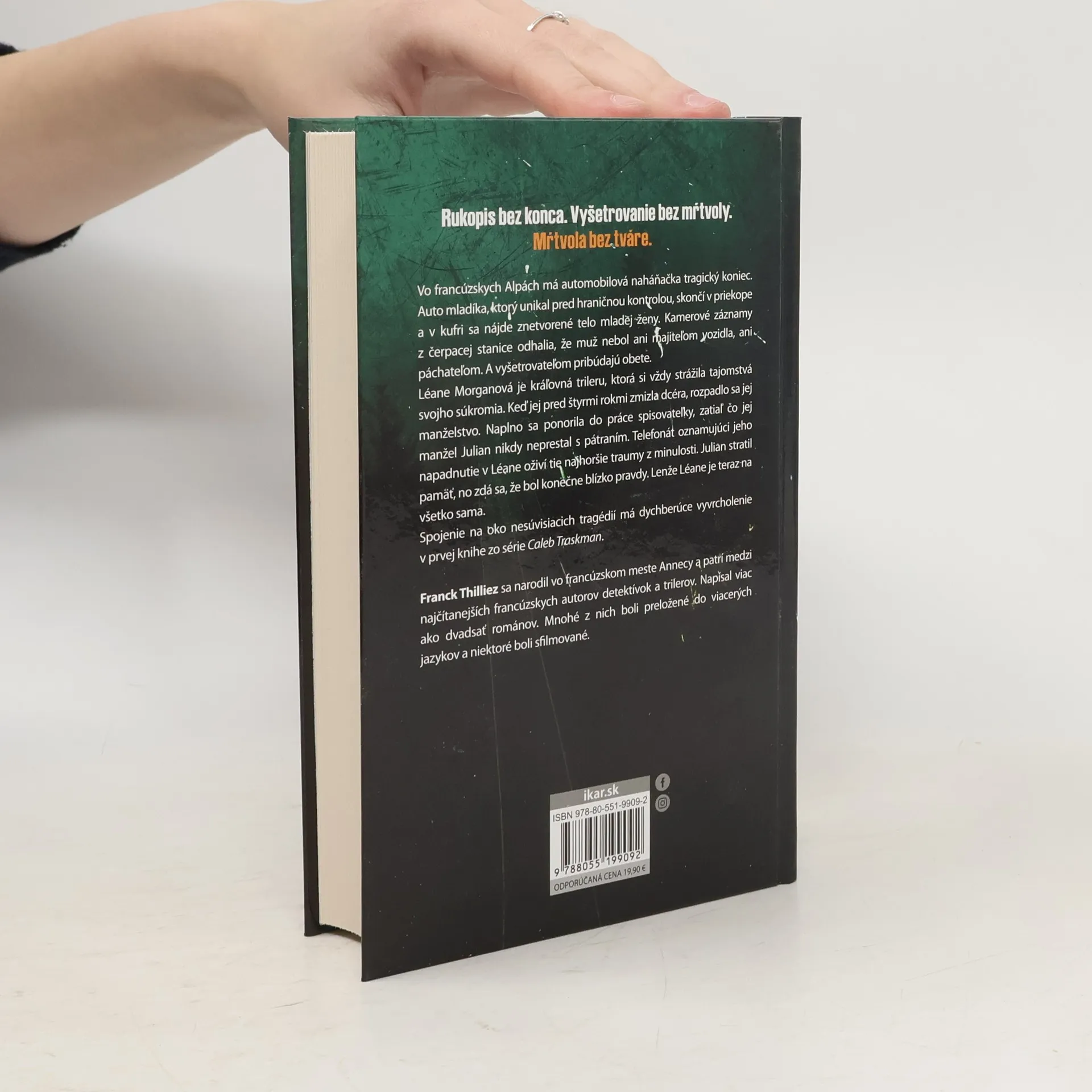 Myslela si, že to najhoršie má už za sebou Rukopis bez konca. Vyšetrovanie bez mŕtvoly. Mŕtvola bez tváre. Vo francúzskych Alpách má automobilová naháňačka tragický koniec. Auto mladíka, ktorý unikal pred hraničnou kontrolou, skončí v priekope a v kufri sa nájde znetvorené telo mladej ženy. Kamerové záznamy z čerpacej stanice odhalia, že muž nebol ani majiteľom vozidla, ani páchateľom. A vyšetrovateľom pribúdajú obete. Léane Morganová je kráľovná trileru, ktorá si vždy strážila tajomstvá svojho súkromia. Keď jej pred štyrmi rokmi zmizla dcéra, rozpadlo sa jej manželstvo. Naplno sa ponorila do práce spisovateľky, zatiaľ čo jej manžel Julian nikdy neprestal s pátraním. Telefonát oznamujúci jeho napadnutie v Léane oživí tie najhoršie traumy z minulosti. Julian stratil pamäť, no zdá sa, že bol konečne blízko pravdy. Lenže Léane je teraz na všetko sama. Spojenie na oko nesúvisiacich tragédií má dychberúce vyvrcholenie v prvej knihe zo série Caleb Traskman.