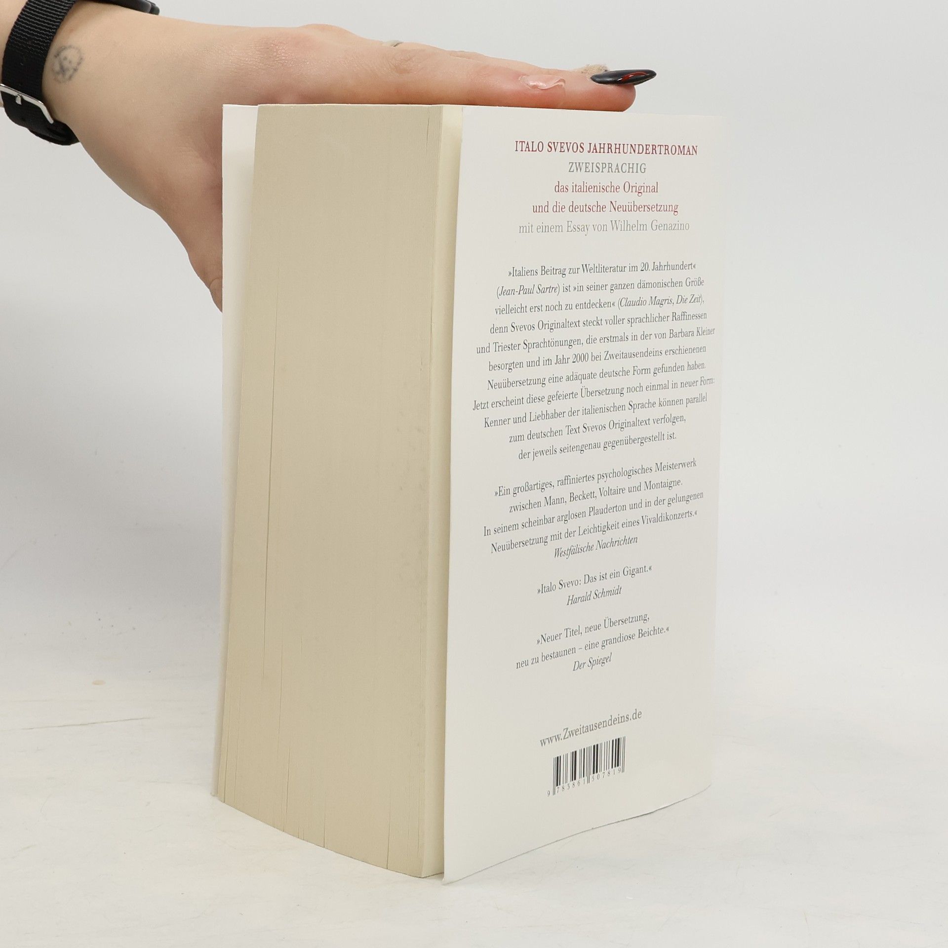 Erstmals zweisprachig: Italo Svevos Jahrhundertroman Zenos Gewissen. Das italienische Original und die Neuübersetzung von Barbara Kleiner. Mit einem Essay von Wilhelm Genazino. Hätte Italo Svevo nicht den Entschluss gefasst, seine Englischkenntnisse zu verbessern, und wäre er bei der Umsetzung dieses Planes nicht zufällig auf James Joyce getroffen, würden heute vielleicht nur Spezialisten für italienische Regionalliteratur seinen Namen kennen. Doch es kam anders: „Heute lässt die italienische Literaturgeschichte mit ihm die Moderne beginnen“ (Hermann Kurzke, FAZ). Svevos Hauptwerk, der Roman „Zenos Gewissen“, gilt längst als „eines der größten Bücher des Jahrhunderts, und nicht nur des Jahrhunderts, das trotz seiner inzwischen weltweiten Geltung in seiner ganzen dämonischen Größe vielleicht erst noch zu entdecken ist“ (Claudio Magris, Die Zeit). Svevos Originaltext steckt voller sprachlicher Raffinessen und Triester Sprachtönungen, die erstmals in der von Barbara Kleiner besorgten und bei Zweitausendeins erschienenen Neuübersetzung eine adäquate deutsche Form gefunden hatten. Nicht nur Der Spiegel war beeindruckt: „Neuer Titel, neue Übersetzung … neu zu bestaunen - eine grandiose Beichte.“ „Nun ist dieses Meisterwerk der Weltliteratur in einer präzisen, einfühlsamen Übersetzung erschienen, die dem Original gerecht wird … Die unvollständige Übersetzung von 1929 ist vom Tisch“ (Marion Lühe, Rheinischer Merkur). Jetzt erscheint die gefeierte Übersetzung von Barbara Kleiner noch einmal in neuer Form: Kenner und Liebhaber der italienischen Sprache können parallel zur deutschen Version Svevos Originaltext verfolgen, der jeweils seitengenau gegenüber gestellt ist. Mit einem Essay von Wilhelm Genazino („Eine bessere Einführung kann man dem deutschen Svevo-Entdecker kaum wünschen“, Frankfurter Rundschau).