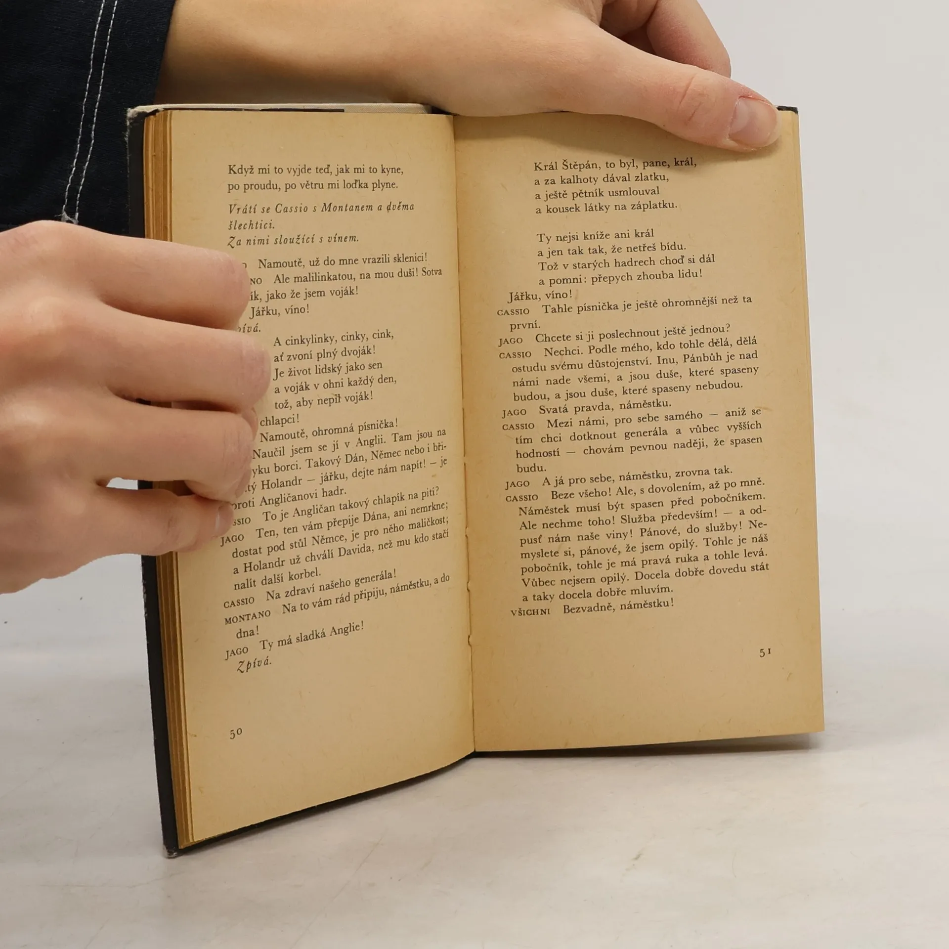 Martin Hilský píše: „Děj Othella lze převyprávět s větší či menší stručností jako příběh Maura, který ze žárlivosti uškrtí svou bílou ženu Desdemonu. Děj každé Shakespearovy hry samozřejmě lze převyprávět, ale každá taková dějová parafráze zastírá prostou, ale významnouokolnost, že každá Shakespearova hra obsahuje přinejmenším děje dva: děj v tradičním slova smyslu a děj řeči. (...) Zvláštností Othella je, že moc slova má v této hře zcela výjimečnou důležitost. Othello si získá lásku Desdemony silou svého slova. Jago Othellovu lásku promění v žárlivost opět silou slova. (...) Vítězství Jaga nad Othellem spočívá mimo jiné v tom, že Jago dokáže Othellovi vnutit svou rétoriku, svůj jazyk. Othello se v druhé polovině hry nenakazí jenom žárlivostí, ale také Jagovým jazykem. Othello vypovídá o rozpadu osobnosti, který se projevuje rozpadem jazyka.“