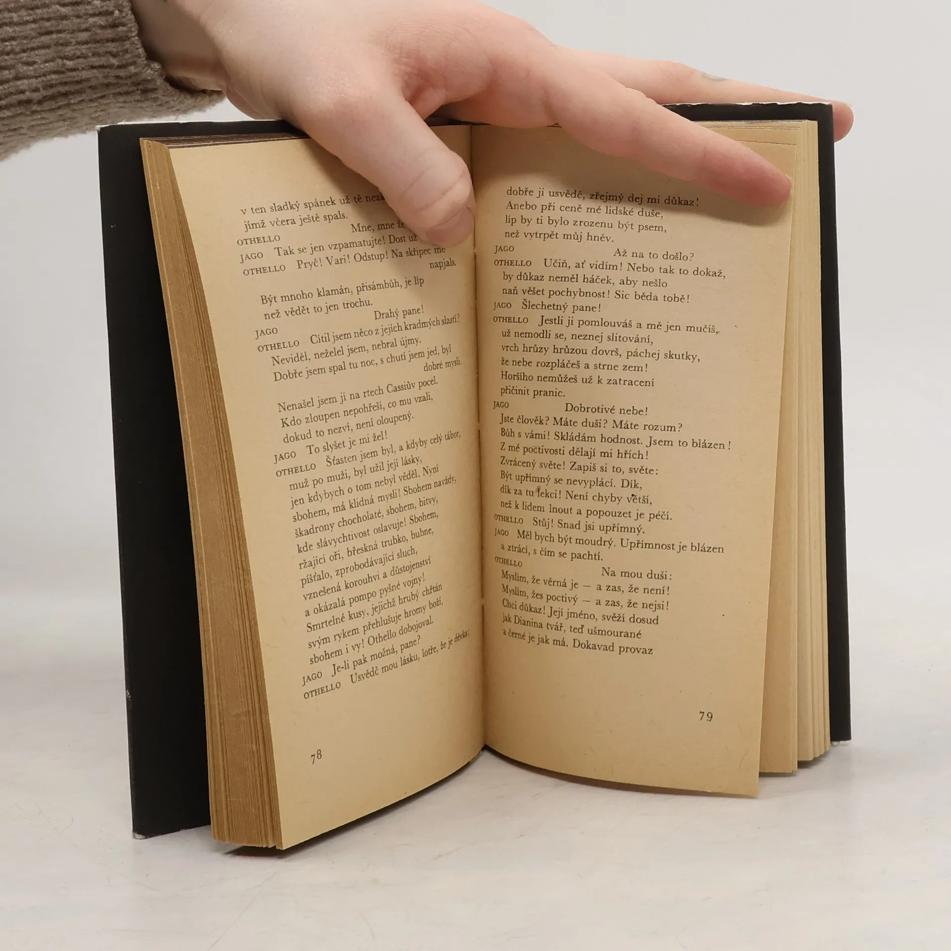 Martin Hilský píše: „Děj Othella lze převyprávět s větší či menší stručností jako příběh Maura, který ze žárlivosti uškrtí svou bílou ženu Desdemonu. Děj každé Shakespearovy hry samozřejmě lze převyprávět, ale každá taková dějová parafráze zastírá prostou, ale významnouokolnost, že každá Shakespearova hra obsahuje přinejmenším děje dva: děj v tradičním slova smyslu a děj řeči. (...) Zvláštností Othella je, že moc slova má v této hře zcela výjimečnou důležitost. Othello si získá lásku Desdemony silou svého slova. Jago Othellovu lásku promění v žárlivost opět silou slova. (...) Vítězství Jaga nad Othellem spočívá mimo jiné v tom, že Jago dokáže Othellovi vnutit svou rétoriku, svůj jazyk. Othello se v druhé polovině hry nenakazí jenom žárlivostí, ale také Jagovým jazykem. Othello vypovídá o rozpadu osobnosti, který se projevuje rozpadem jazyka.“