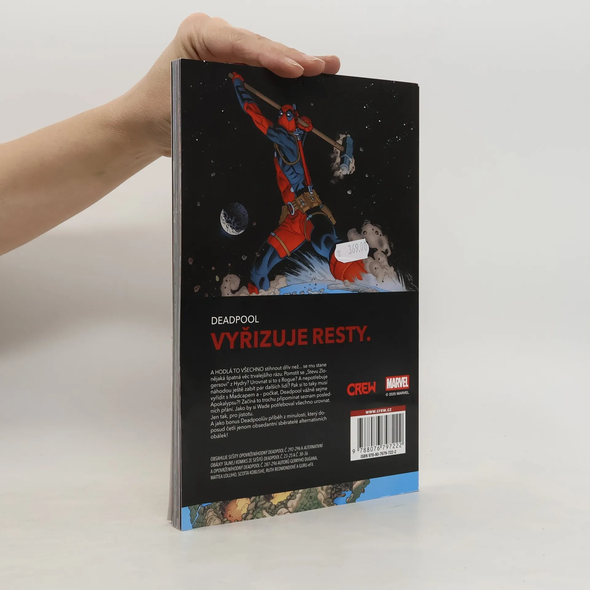 DEADPOOL VYŘIZUJE RESTY. A HODLÁ TO VŠECHNO stihnout dřív než... se mu stane nějaká špatná věc trvalejšího rázu. Pomstít se „Stevu Zlogersovi“ z Hydry? Urovnat si to s Rogue? A nepotřebuje náhodou ještě zabít pár dalších lidí? Pak si to taky musí vyřídit s Madcapem a – počkat, Deadpool vážně sejme Apokalypsu?! Začíná to trochu připomínat seznam posledních přání. Jako by si Wade potřeboval všechno urovnat. Jen tak, pro jistotu. A jako bonus Deadpoolův příběh z minulosti, který doposud četli jenom obsedantní sběratelé alternativních obálek!