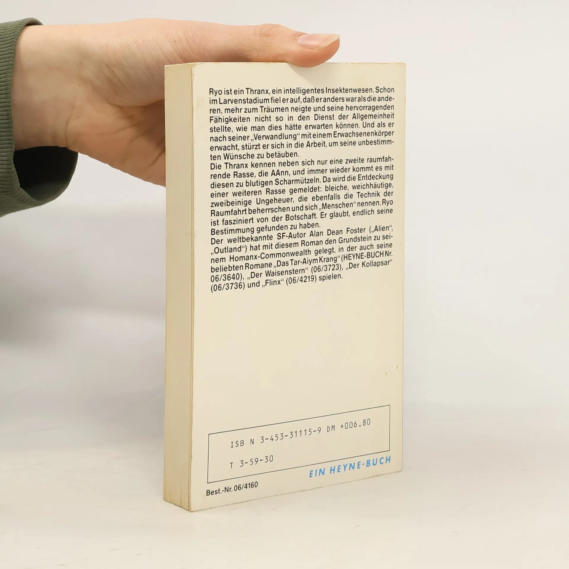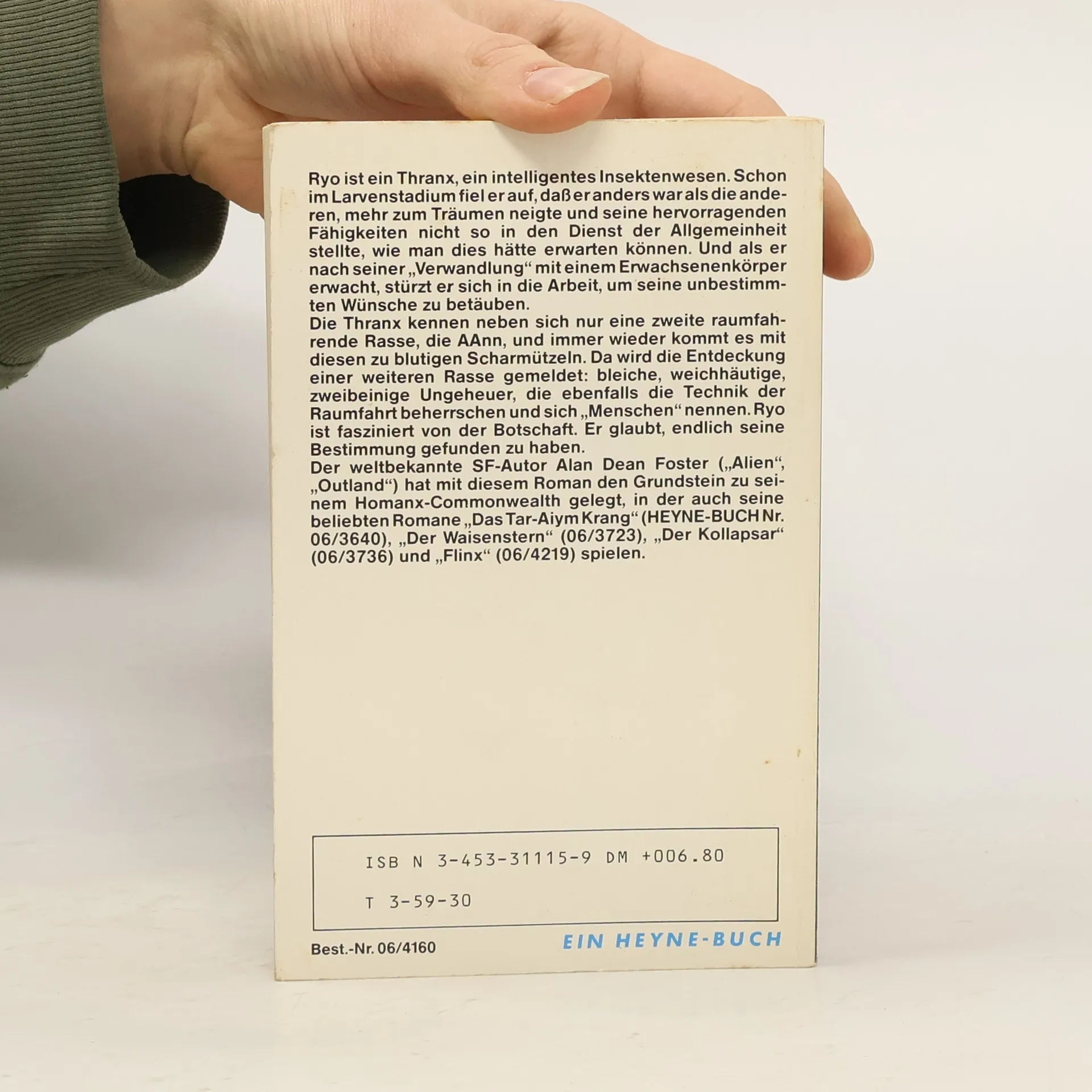 Ryo ist ein Thranx, ein intelligentes Insektenwesen. Schon im Larvenstadium fiel er auf, daß er anders war als die anderen, mehr zum Träumen neigte und seine hervorragenden Fähigkeiten nicht so in den Dienst der Allgemeinheit stellte, wie man das hätte erwarten können. Und als er nach seiner "Verwandlung" mit einem Erwachsenenkörper erwacht, stürzt er sich in die Arbeit, um seine unbestimmten Wünsche zu betäuben. Die Thranx kennen neben sich nur eine zweite raumfahrende Rasse, die AAnn, und immer wieder kommt es mit diesen zu blutigen Scharmützeln. Da wird die Entdeckung einer weiteren Rasse gemeldet: bleiche, weichhäutige, zweibeinige Ungeheuer, die ebenfalls die Technik der Raumfahrt beherrschen und sich "Menschen" nennen. Ryo ist fasziniert von der Botschaft. Er glaubt, endlich seine Bestimmung gefunden zu haben. Der weltbekannte SF-Autor Alan Dean Foster ("Alien", "Outland") hat mit diesem Roman den Grundstein zu seinem Homanx-Commonwealth gelegt, in der auch seine beliebten Romane "Das Tar-Aiym Krang" (Heyne-Buch Nr. 06/3640), "Der Waisenstern" (06/3723), "Der Kollapsar" (06/3736) und "Flinx" (06/4219) soielen. Heyne 06/4160