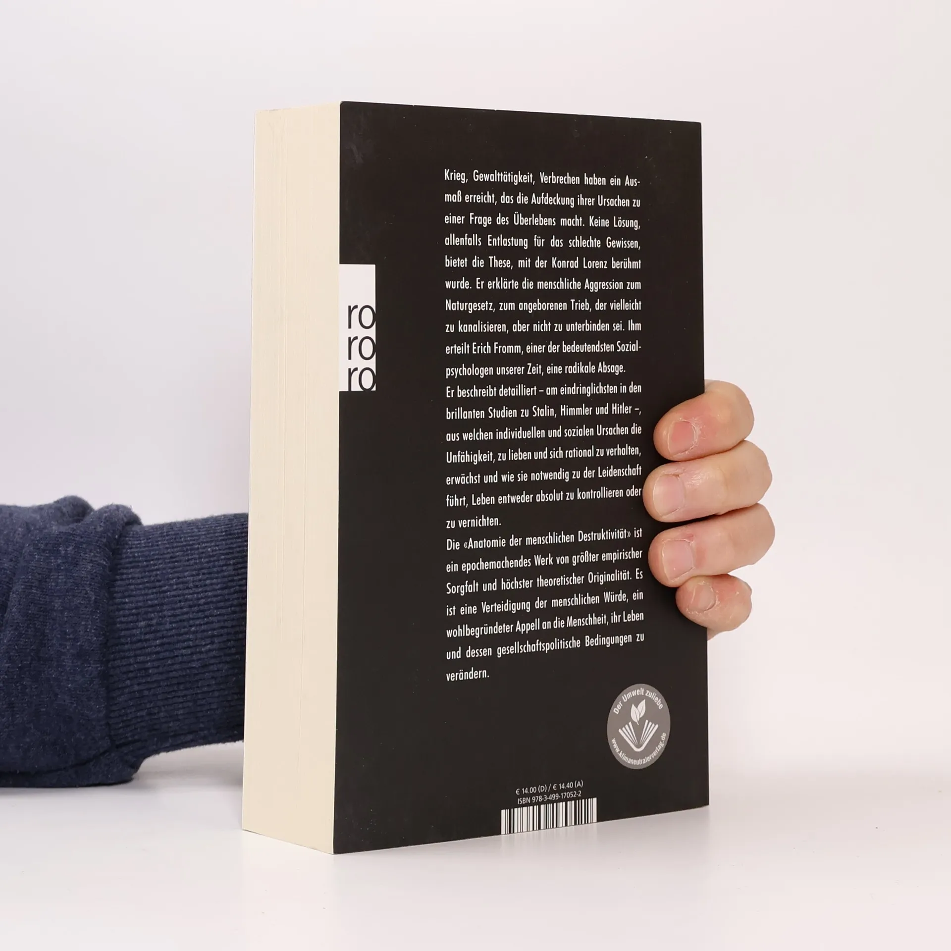 Krieg, Gewalttätigkeit, Verbrechen haben ein Ausmaß erreicht, das die Aufdeckung ihrer Ursachen zu einer Frage des Überlebens macht. Keine Lösung, allenfalls Entlastung für das schlechte Gewissen, bietet die These, mit der Konrad Lorenz berühmt wurde. Er erklärte die menschliche Aggression zum Naturgesetz, zum angeborenen Trieb, der vielleicht zu kanalisieren, aber nicht zu unterbinden sei. Ihm erteilt Erich Fromm, einer der bedeutendsten Sozialpsychologen unserer Zeit, eine radikale Absage. Er beschreibt detailliert – am eindringlichsten in den brillanten Studien zu Stalin, Himmler und Hitler –, aus welchen individuellen und sozialen Ursachen die Unfähigkeit, zu lieben und sich rational zu verhalten, erwächst und wie sie notwendig zu der Leidenschaft führt, Leben entweder absolut zu kontrollieren oder zu vernichten. Die «Anatomie der menschlichen Destruktivität» ist ein epochemachendes Werk von größter empirischer Sorgfalt und höchster theoretischer Originalität. Es ist eine Verteidigung der menschlichen Würde, ein wohlbegründeter Appell an die Menschheit, ihr Leben und dessen gesellschaftspolitische Bedingungen zu verändern.