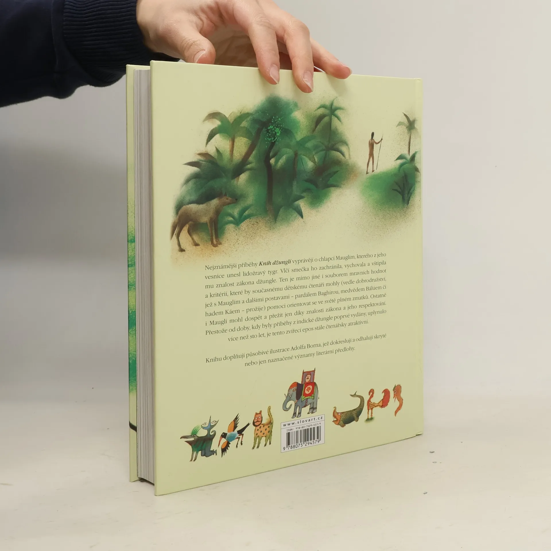 Nejznámější příběhy Knih džunglí vyprávějí o chlapci Mauglím, kterého z jeho vesnice unesl lidožravý tygr. Vlčí smečka ho zachránila, vychovala a vštípila mu znalost zákona džungle. Ten je mimo jiné i souborem mravních hodnot a kritérií, které by současnému dětskému čtenáři mohly (vedle dobrodružství, jež s Mauglím a dalšími postavami – pardálem Baghírou, medvědem Bálúem či hadem Káem – prožije) pomoci orientovat se ve světě plném zmatků. Ostatně i Mauglí mohl dospět a přežít jen díky znalosti zákona a jeho respektování. Přestože od doby, kdy byly příběhy z indické džungle poprvé vydány, uplynulo více než sto let, je tento zvířecí epos stále čtenářsky atraktivní. Knihu doplňují působivé ilustrace Adolfa Borna, jež dokreslují a odhalují skryté nebo jen naznačené významy literární předlohy.