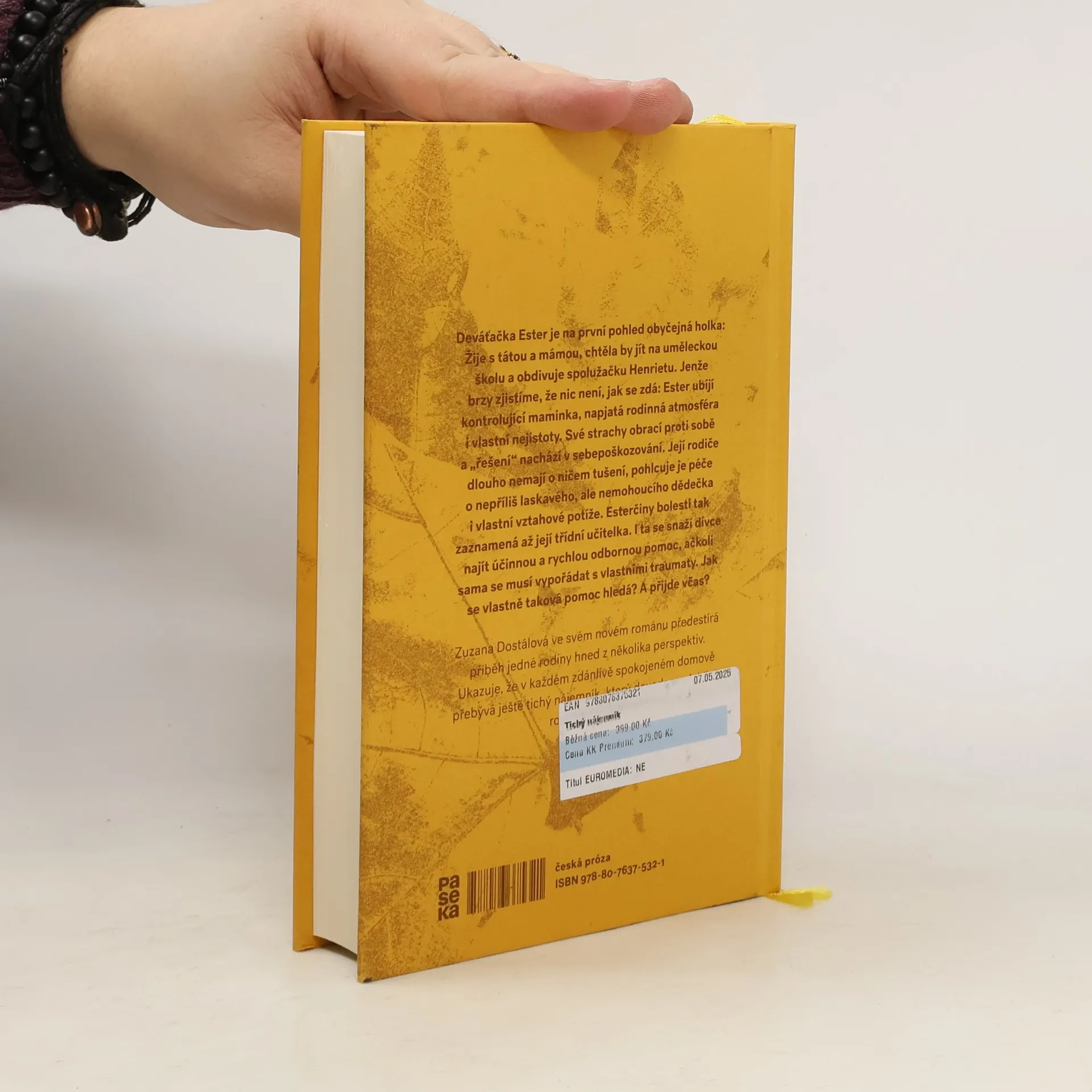 Deváťačka Ester je na první pohled obyčejná holka: Žije s tátou a mámou, chtěla by jít na uměleckou školu a obdivuje spolužačku Henrietu. Jenže brzy zjistíme, že nic není, jak se zdá: Ester ubíjí kontrolující maminka, napjatá rodinná atmosféra i vlastní nejistoty. Své strachy obrací proti sobě a „řešení“ nachází v sebepoškozování. Její rodiče dlouho nemají o ničem tušení, pohlcuje je péče o nepříliš laskavého, ale nemohoucího dědečka i vlastní vztahové potíže. Esterčiny bolesti tak zaznamená až její třídní učitelka. I ta se snaží dívce najít účinnou a rychlou odbornou pomoc, ačkoli sama se musí vypořádat s vlastními traumaty. Jak se vlastně taková pomoc hledá? A přijde včas? Zuzana Dostálová ve svém novém románu předestírá příběh jedné rodiny hned z několika perspektiv. Ukazuje, že v každém zdánlivě spokojeném domově přebývá ještě tichý nájemník, který dovede spolehlivě rozleptat radost.
