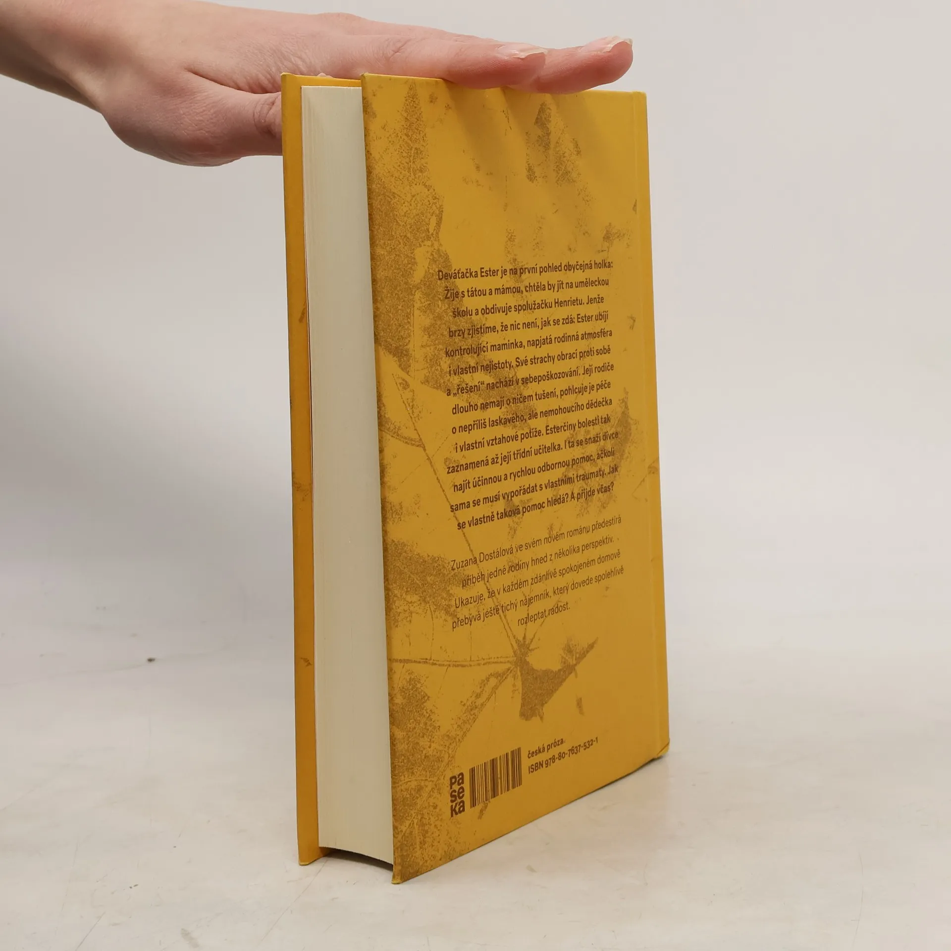 Deváťačka Ester je na první pohled obyčejná holka: Žije s tátou a mámou, chtěla by jít na uměleckou školu a obdivuje spolužačku Henrietu. Jenže brzy zjistíme, že nic není, jak se zdá: Ester ubíjí kontrolující maminka, napjatá rodinná atmosféra i vlastní nejistoty. Své strachy obrací proti sobě a „řešení“ nachází v sebepoškozování. Její rodiče dlouho nemají o ničem tušení, pohlcuje je péče o nepříliš laskavého, ale nemohoucího dědečka i vlastní vztahové potíže. Esterčiny bolesti tak zaznamená až její třídní učitelka. I ta se snaží dívce najít účinnou a rychlou odbornou pomoc, ačkoli sama se musí vypořádat s vlastními traumaty. Jak se vlastně taková pomoc hledá? A přijde včas? Zuzana Dostálová ve svém novém románu předestírá příběh jedné rodiny hned z několika perspektiv. Ukazuje, že v každém zdánlivě spokojeném domově přebývá ještě tichý nájemník, který dovede spolehlivě rozleptat radost.
