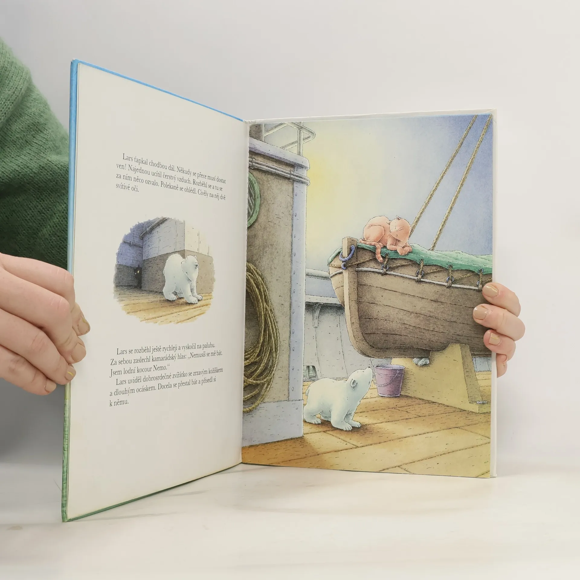 Vypráví a sám ilustruje autor. Lední medvídek Lars se vydal na nedobrovolnou cestu. Když vesele skotačil na moři, byl chycen do rybářské sítě a vyzvednut na palubu lodi. Tam se poznal a spřátelil se zrzavým lodním kocourem Nemem. Nový kamarád naštěstí věděl, jak se může Lars opět vrátit k rodičům na severní pol.