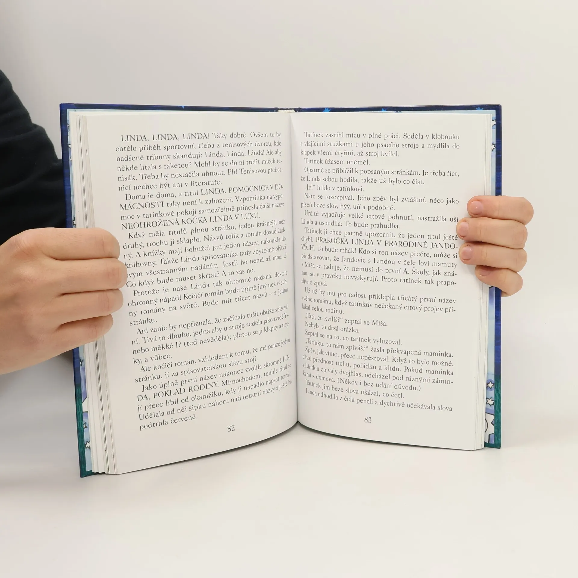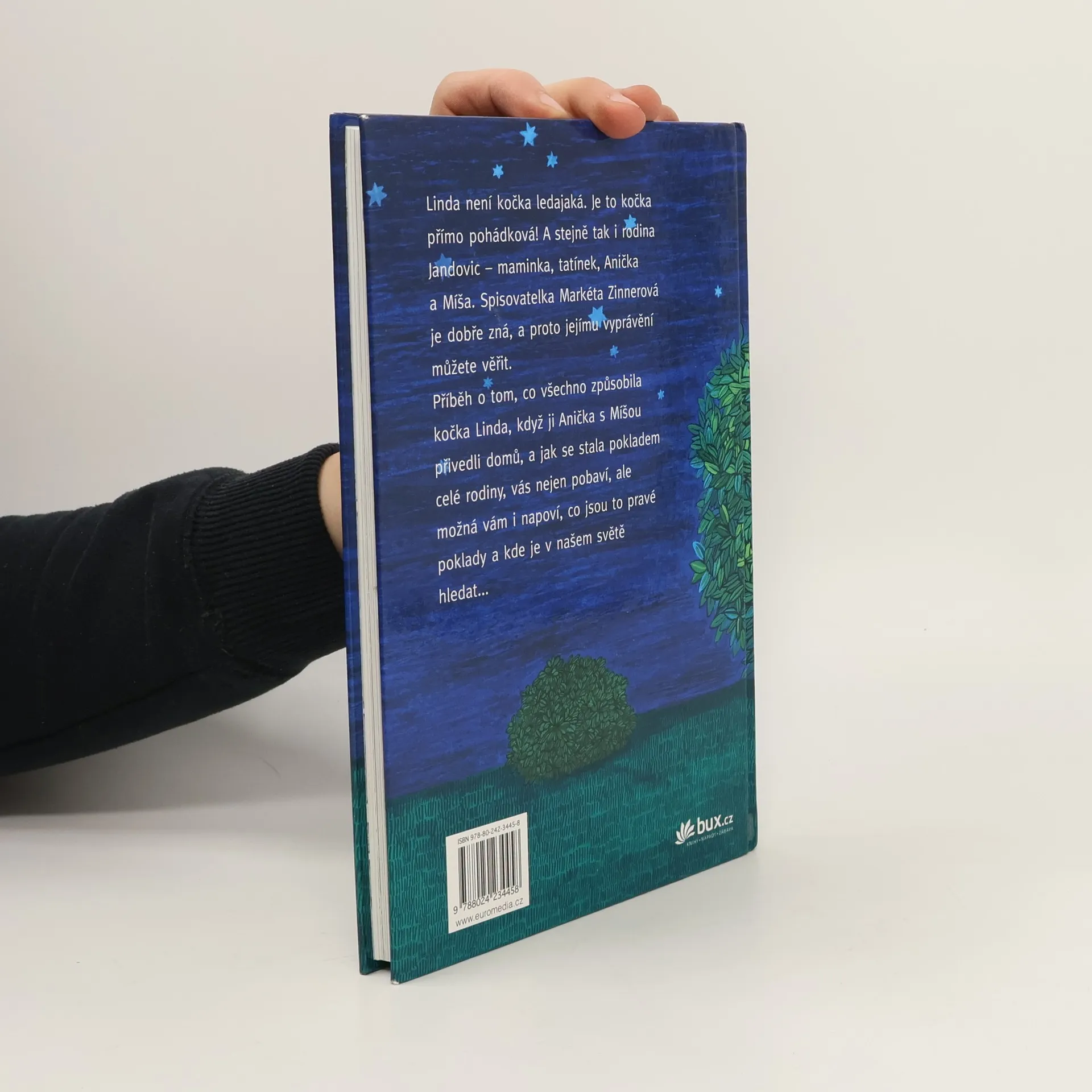 Veselé vyprávění pro děti od 7 let - o tom, co všechno způsobil příchod kočky Lindy do Jandovic rodiny. Linda není jen tak nějaká kočka. Mluví, má vychování, umí psát a vůbec - je přímo pohádková. Anička, Míša, jejich maminka a (po počátečních výhradách) i tatínek pro ni mají plné pochopení, ba přímo slabost a tak se rozvine celý ohňostroj nápadů a her. A ten poklad - je to opravdu Linda? Nebo to nejdůležitější a nejdražší vězí úplně jinde?