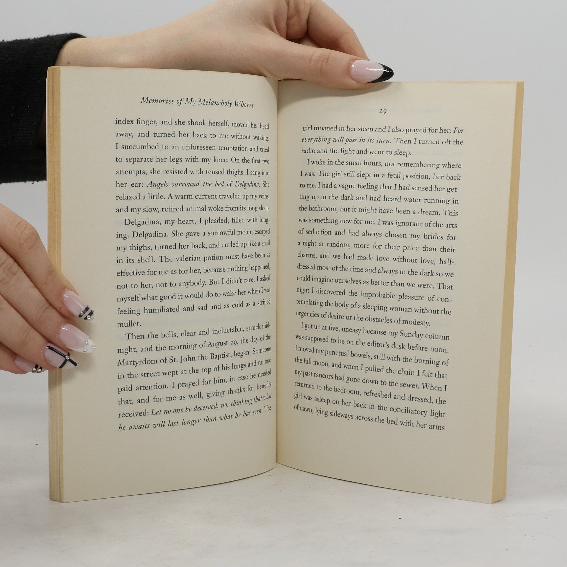 A New York Times Notable Book On the eve of his ninetieth birthday a bachelor decides to give himself a wild night of love with a virgin. As is his habit–he has purchased hundreds of women–he asks a madam for her assistance. The fourteen-year-old girl who is procured for him is enchanting, but exhausted as she is from caring for siblings and her job sewing buttons, she can do little but sleep. Yet with this sleeping beauty at his side, it is he who awakens to a romance he has never known. Tender, knowing, and slyly comic, Memories of My Melancholy Whores is an exquisite addition to the master’s work.