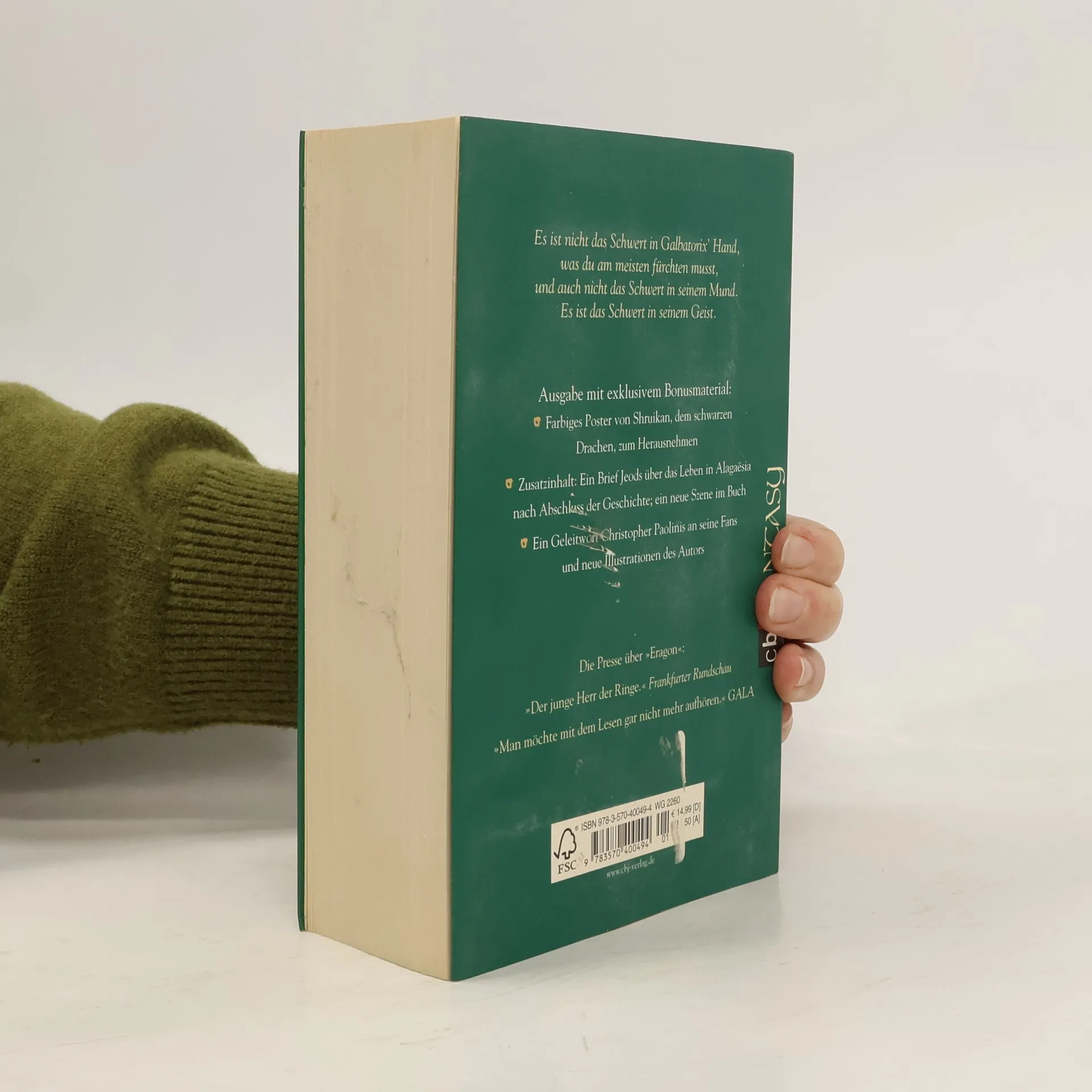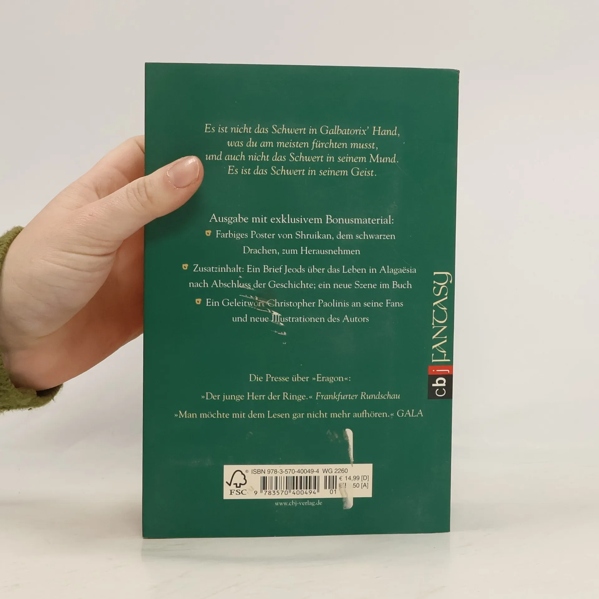 Der sensationelle Abschluss von Christopher Paolinis Weltbestseller „Eragon“ - tauch ein in Alagaësia, die fantastische und faszinierende Welt der Drachenreiter! Ein schrecklicher Krieg wütet in Alagaësia. Alle Völker haben sich zusammengeschlossen und ziehen in den Kampf gegen Galbatorix, den grausamen Herrscher des Imperiums. Eragon weiß, dass er und Saphira ihm irgendwann gegenüberstehen werden. Wird Eragon Galbatorix besiegen können? Oder muss er sich geschlagen geben? Eine Prophezeiung besagt, dass Eragon Alagaësia für immer verlassen wird … Mit sensationellem, bisher unveröffentlichtem Bonusmaterial: – Farbiges Drachen-Poster zum Herausnehmen, illustriert von John Jude Palencar– Zusatz-Content: Ein Brief Jeods über das Leben in Alagaësia nach Band vier; eine zusätzliche Szene– Neue exklusive Illustration von Christopher Paolini – Brief des Autors an seine Fans zur Eragon-Saga Alle Bände der Eragon-Saga: Eragon - Das Vermächtnis der Drachenreiter (Band 1)Eragon - Der Auftrag des Ältesten (Band 2)Eragon - Die Weisheit des Feuer (Band 3)Eragon - Das Erbe der Macht (Band 4)Die Gabel, die Hexe und der Wurm. Geschichten aus Alagaësia. Band 1: Eragon (Kurzgeschichten, Band 1) Ausstattung: Farbiges Poster zum Herausnehmen