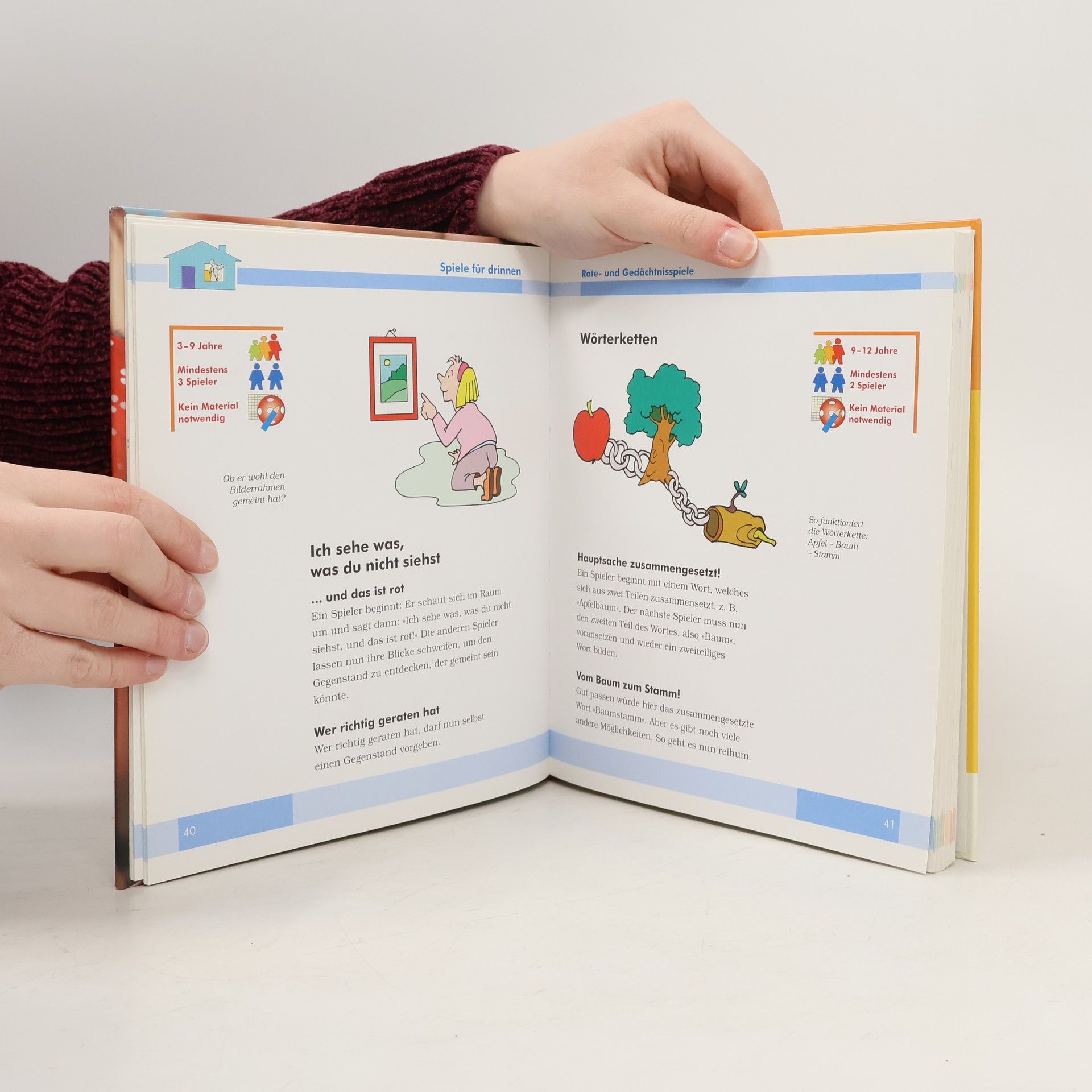 Sammlung mit Spielen zu jedem Anlass (Geburtstag, Spiele für draussen und drinnen); mit Informationen zu Alter und Anzahl der Spielenden sowie den benötigten Materialien.