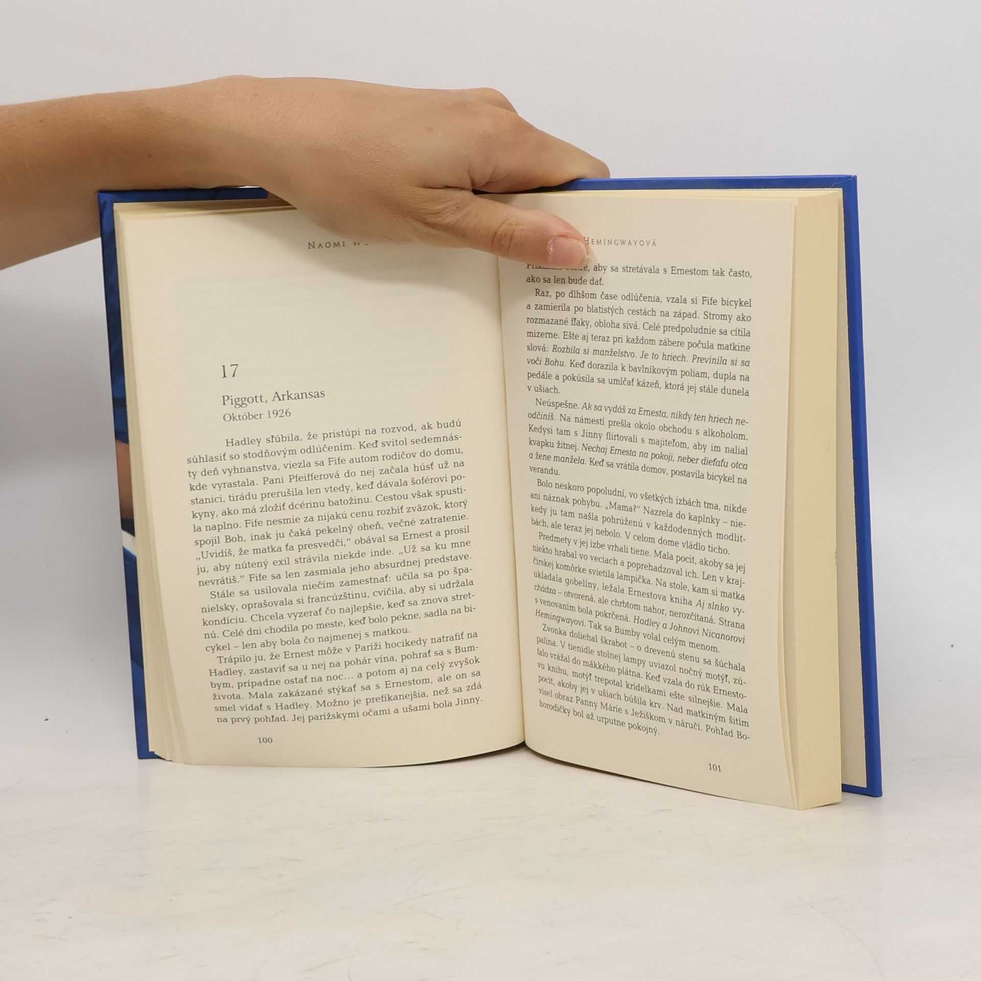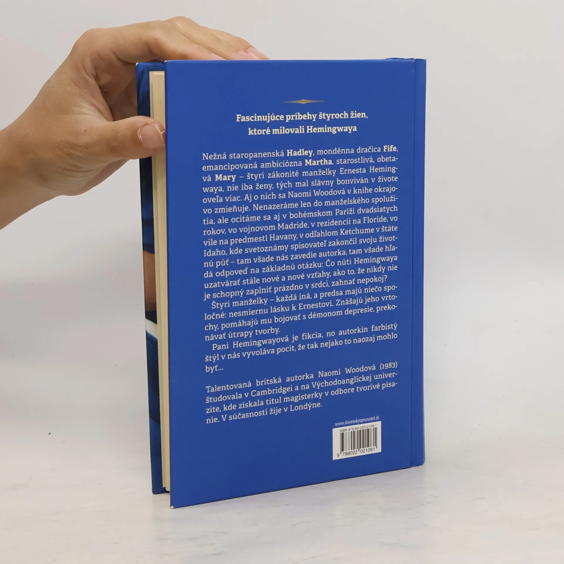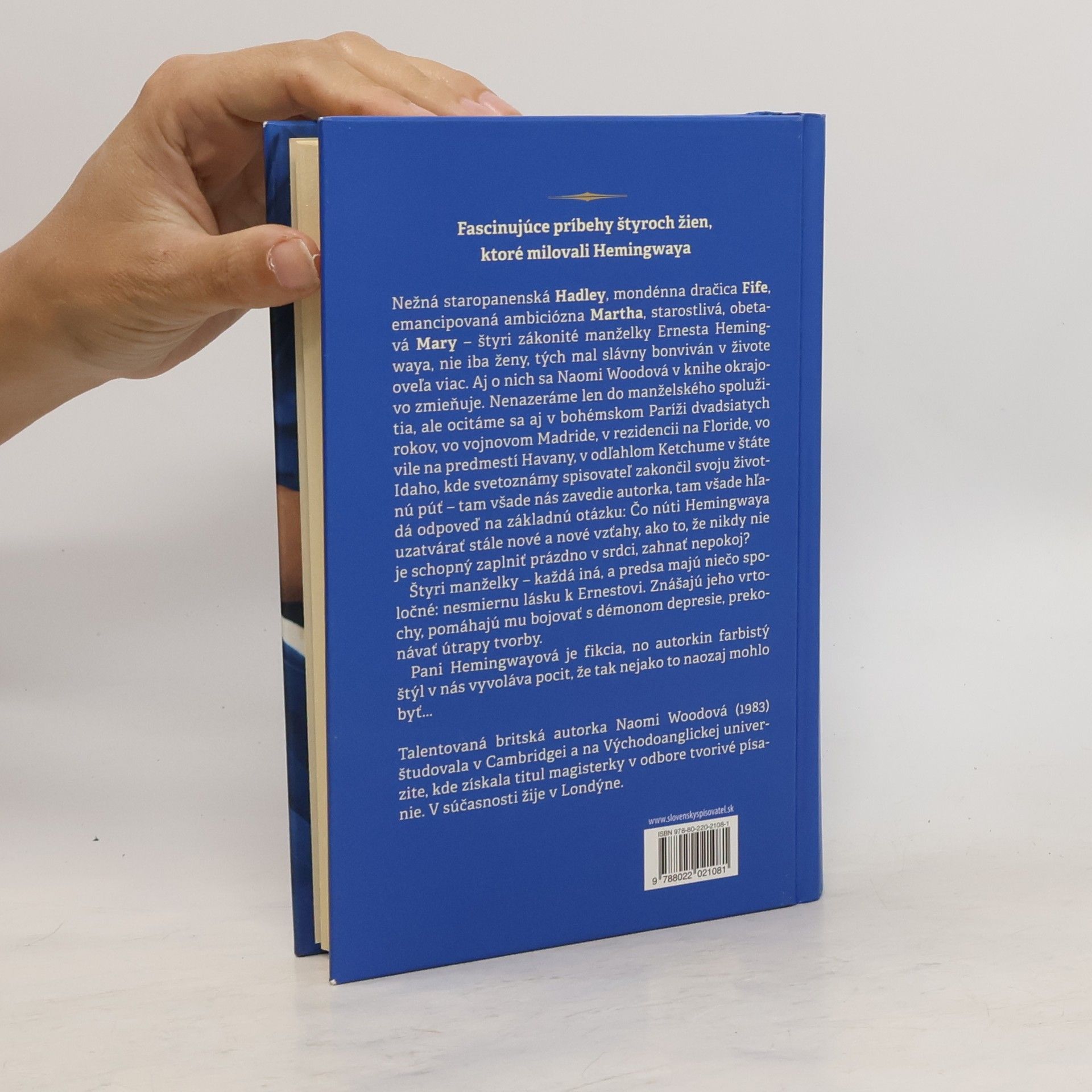 Nežná staropanenská Hadley, mondénna dračica Fife, emancipovaná ambiciózna Martha, starostlivá a obetavá Mary – štyri zákonité manželky Ernesta Hemingwaya, nie iba ženy, tých mal slávny bonviván v živote oveľa viac. Aj o nich sa Naomi Woodová v knihe okrajovo zmieňuje. Nenazeráme len do manželského spolužitia, ale ocitáme sa aj v bohémskom Paríži dvadsiatych rokov, vo vojnovom Madride, v rezidencii na Floride, vo vile na predmestí Havany, v odľahlom Ketchume v štáte Idaho, kde svetoznámy spisovateľ zakončil svoju životnú púť – tam všade nás zavedie autorka, tam všade hľadá odpoveď na základnú otázku: Čo núti Hemingwaya uzatvárať stále nové a nové vzťahy, ako to, že nikdy nie je schopný zaplniť prázdno v srdci, zahnať nepokoj? Štyri manželky – každá iná, a predsa majú niečo spoločné: nesmiernu lásku k Ernestovi. Znášajú jeho vrtochy, pomáhajú mu bojovať s démonom depresie, prekonávať útrapy tvorby. Pani Hemingwayová je fikcia, no autorkin farbistý štýl v nás vyvoláva pocit, že tak nejako to naozaj mohlo byť. ..