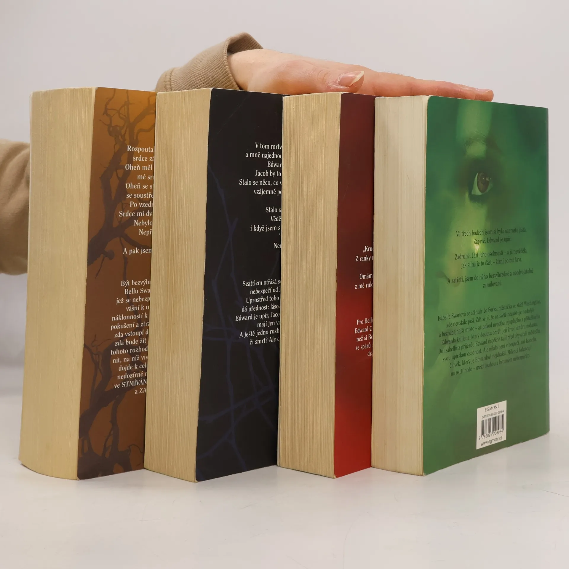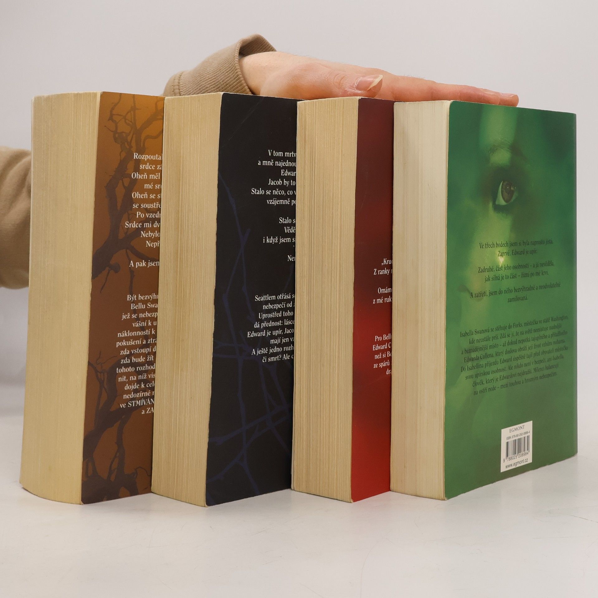 Kniha obsahuje první čtyři svazky populární série od Stephenie Meyer, která se zaměřuje na romantický vztah mezi lidskou dívkou, Bellou Swan, a upírem, Edwardem Cullenem. Příběh začíná Belliným přestěhováním do malého města Forks, kde se setkává s Edwardem, jehož tajemství a nadpřirozené schopnosti ji fascinují. V průběhu série se rozvíjejí témata lásky, identity, oběti a konfliktu mezi různými světy – lidským a nadpřirozeným. Hlavní postavy, jako je Bella, Edward a další členové rodiny Cullenových, se potýkají s různými výzvami, včetně nebezpečí, které představují jiní upíři, a vnitřními konflikty ohledně jejich odlišných existencí. Důležitou roli hraje také Jacob Black, Bellain přítel, který se stává součástí širšího konfliktu mezi upíry a vlkodlaky. Série zkoumá dynamiku mezi láskou a nebezpečím, stejně jako otázky volby a následků. Celkově se jedná o komplexní příběh, který kombinuje prvky romantiky, fantasy a dramatu.