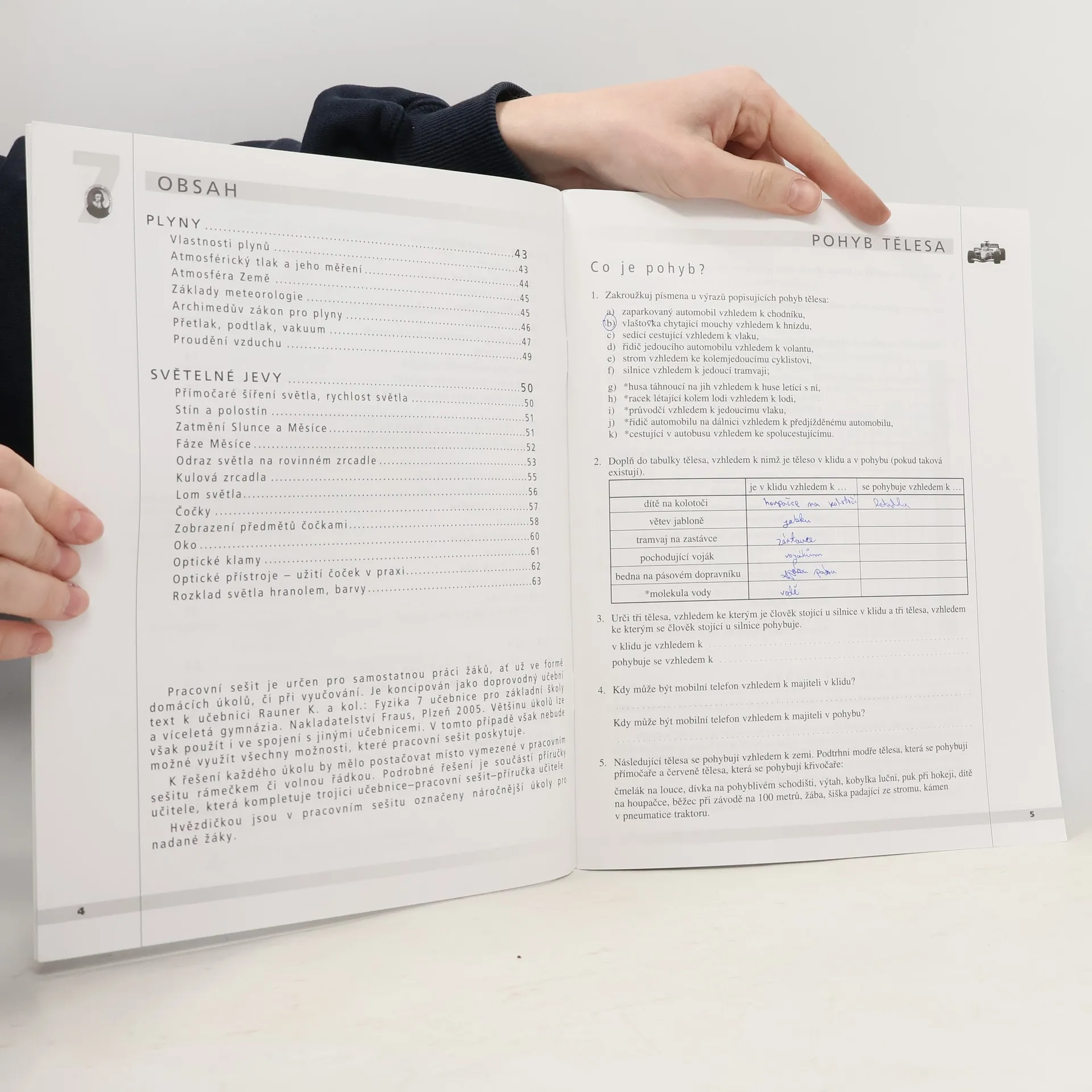 Pracovní sešit obsahuje řadu jednoduchých experimentů, které zdůrazňují praktickou povahu fyziky a jejích zákonů. Zahrnuje doplňovačky a obdobné úkoly, usnadňující pochopení a upevnění vědomostí žáků formou hry. Obsahuje i řadu tradičních úloh na převody mezi vyjádřením veličin v různých jednotkách a číselné příklady procvičující zavedené vztahy. Vyjímatelnou přílohou je Přehled učiva fyziky doplněný o přehledné tabulky nejdůležitějších fyzikálních veličin.