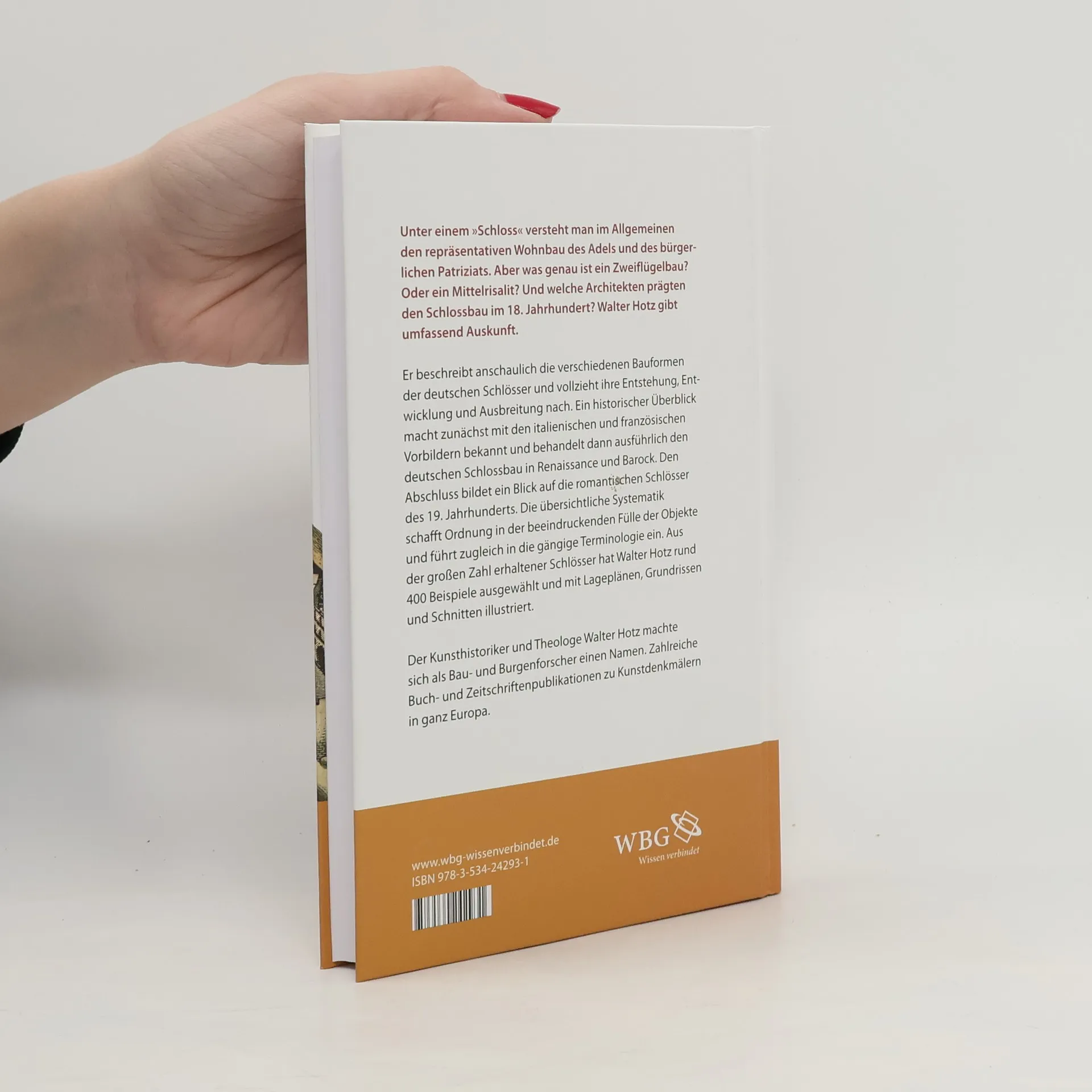 Unter einem »Schloss« versteht man im Allgemeinen den repräsentativen Wohnbau des Adels und des bürgerlichen Patriziats. Aber was genau ist ein Zweiflügelbau? Oder ein Mittelrisalit? Und welche Architekten prägten den Schlossbau im 18. Jh.? Walter Hotz gibt umfassend Auskunft. Er beschreibt anschaulich die verschiedenen Bauformen der deutschen Schlösser und vollzieht ihre Entstehung, Entwicklung und Ausbreitung nach. Ein historischer Überblick macht zunächst mit den italienischen und französischen Vorbildern bekannt und behandelt dann ausführlich den deutschen Schlossbau in Renaissance und Barock. Den Abschluss bildet ein Blick auf die romantischen Schlösser des 19. Jh.s. Die übersichtliche Systematik schafft Ordnung in der beeindruckenden Fülle der Objekte und führt den Leser zugleich in die gängige Terminologie ein. Aus der großen Zahl erhaltener Schlösser hat Walter Hotz rund 400 Beispiele ausgewählt. Ihnen entspricht die Zusammenstellung der zahlreichen Lagepläne, Grundrisse und Schnitte.