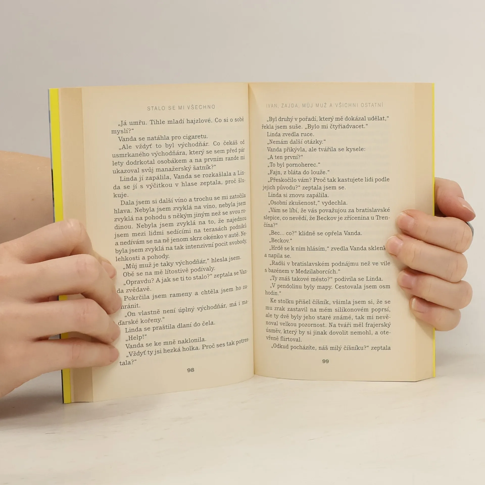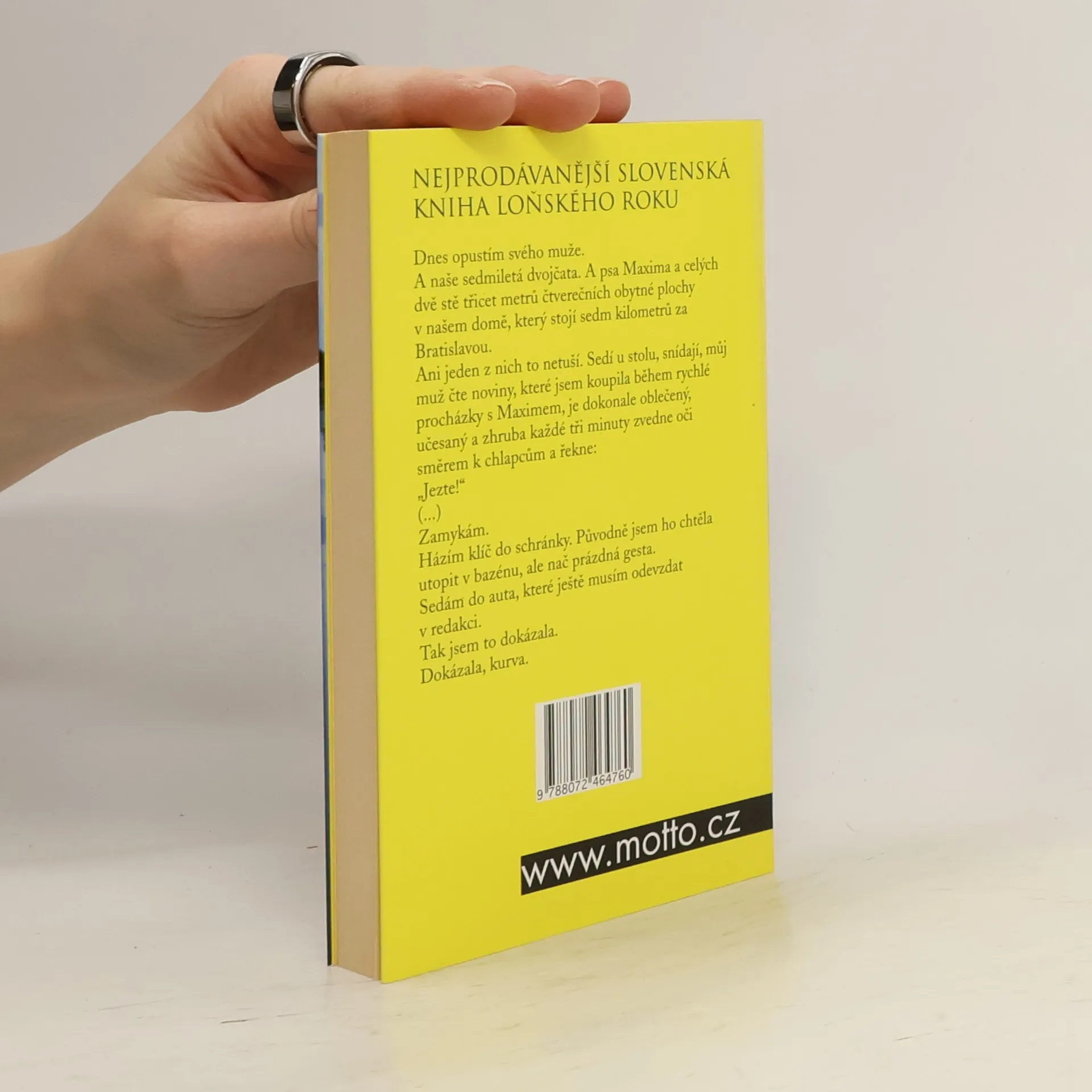 Nejprodávanější slovenská kniha loňského roku Dnes opustím svého muže. A naše sedmiletá dvojčata. A psa Maxima a celých dvě stě třicet metrů čtverečních obytné plochy v našem domě, který stojí sedm kilometrů za Bratislavou. Ani jeden z nich to netuší. Sedí u stolu, snídají, můj muž čte noviny, které jsem koupila během rychlé procházky s Maximem, je dokonale oblečený, učesaný a zhruba každé tři minuty zvedne oči směrem k chlapcům a řekne: „Jezte!“ Zamykám. Házím klíč do schránky. Původně jsem ho chtěla utopit v bazénu, ale nač prázdná gesta. Sedám do auta, které ještě musím odevzdat v redakci. Tak jsem to dokázala. Dokázala, kurva.