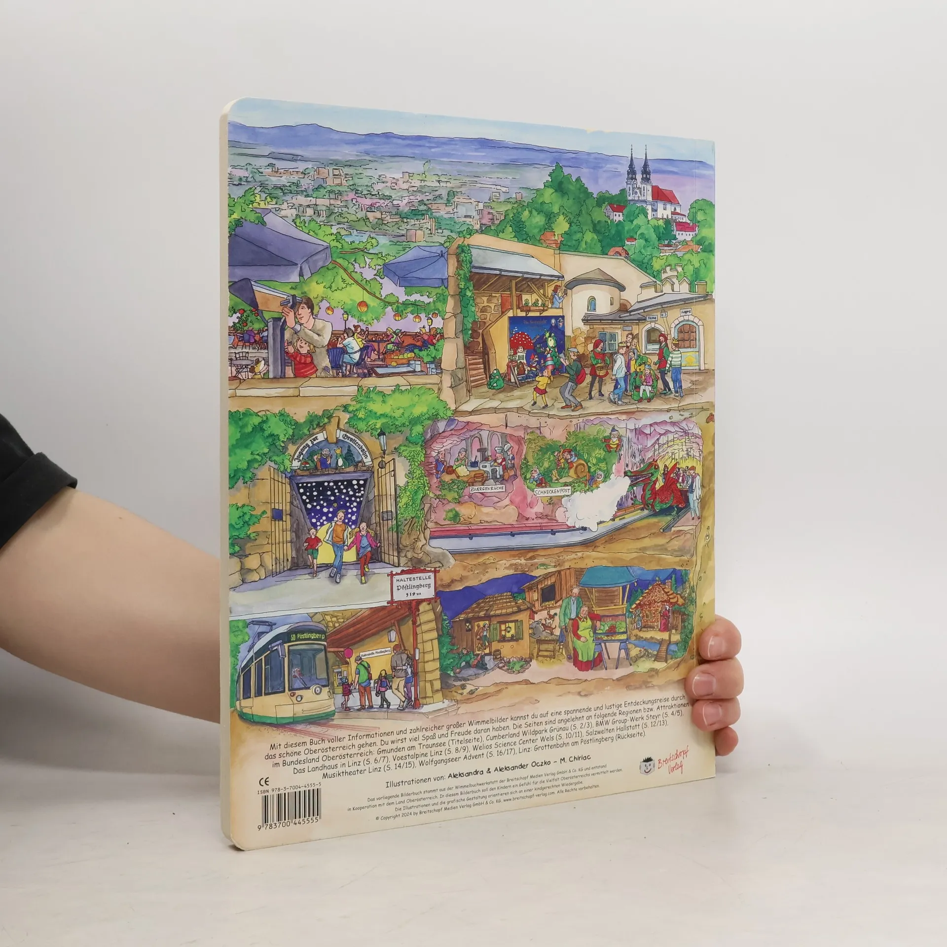 Oberösterreich im Wimmelbuch entdecken! Sie sind ganz wuselig, die bunten Bilder in diesem Oberösterreich Wimmelbuch. Schon kleine Kinder haben viel Spaß daran, die Figuren, die auf den Rändern der Doppelseiten abgedruckt sind, zu suchen und wiederzuentdecken. Ein Team von Kindergartenpädagoginnen und –pädagogen, sowie unser Redaktionsteam hat erheblichen Anteil an dem erfolgreichen Konzept dieses Buches. Dieses neue, stabile Pappbilderbuch bietet den Kindern die Möglichkeit einer spannenden Entdeckungsreise. Dieses Wimmelbuch stammt aus der Wimmelbuchwerkstatt der Breitschopf Medien Verlag GmbH & Co. KG und entstand in Kooperation mit dem Land Oberösterreich. In diesem Bilderbuch soll den Kindern ein Gefühl für die Vielfalt Oberösterreichs vermittelt werden. In 8 großformatigen Bildern entdeckt man spielerisch einige der einprägsamsten Plätze Oberösterreichs. Die Seiten zeigen folgende Regionen bzw. Attraktionen im Bundesland Oberösterreich: Titel: Gmunden am Traunsee 2/3: Cumberland Wildpark Grünau 4/5: BMW Group Werk Steyr 6/7: Das Landhaus in Linz 8/9: Voestalpine AG Linz 10/11: Welios Science Center Wels 12/13: Salzwelten Hallstatt 14/15: Musiktheater Linz 16/17: Wolfgangseer Advent Rückseite: Pöstlingberg und Linzer Grottenbahn