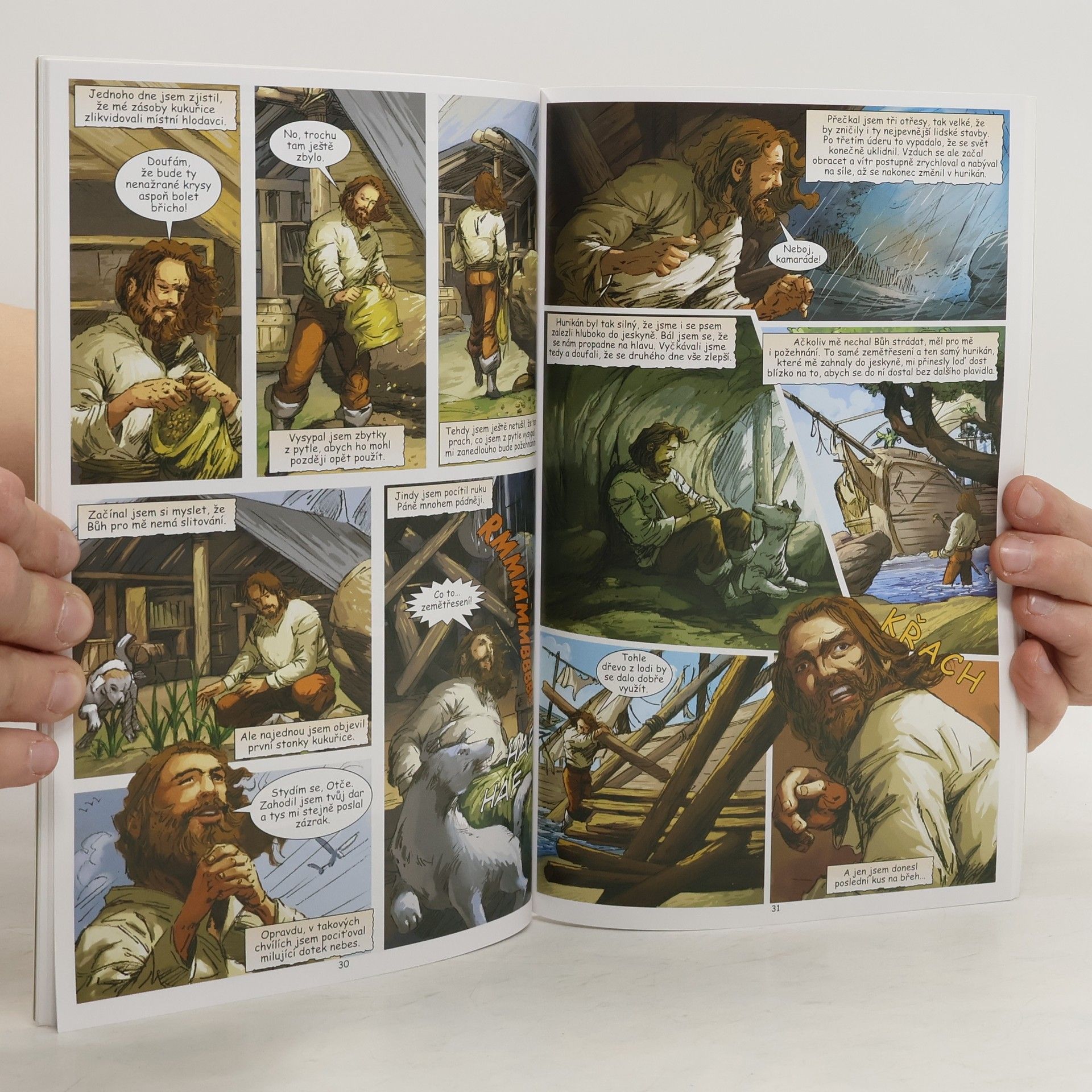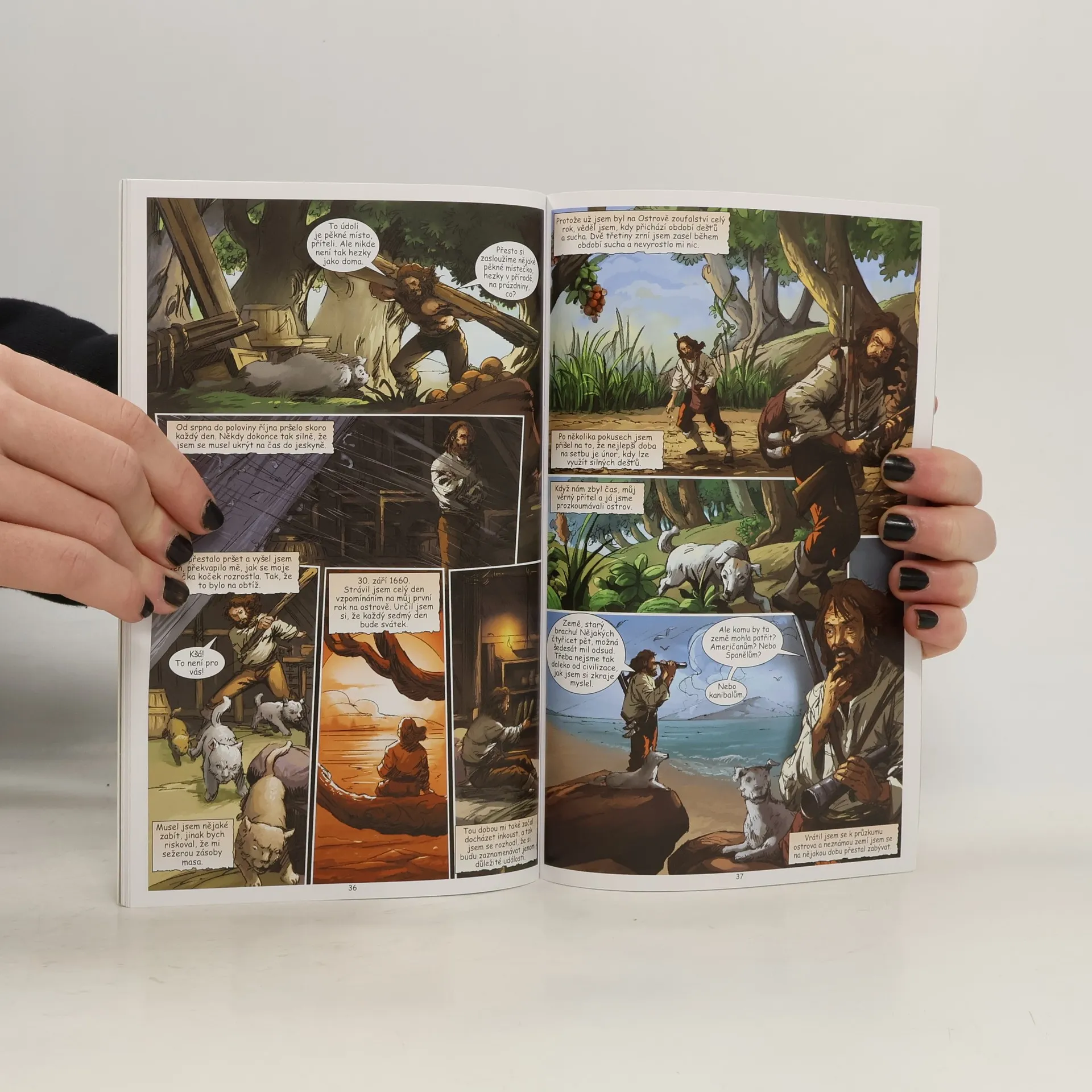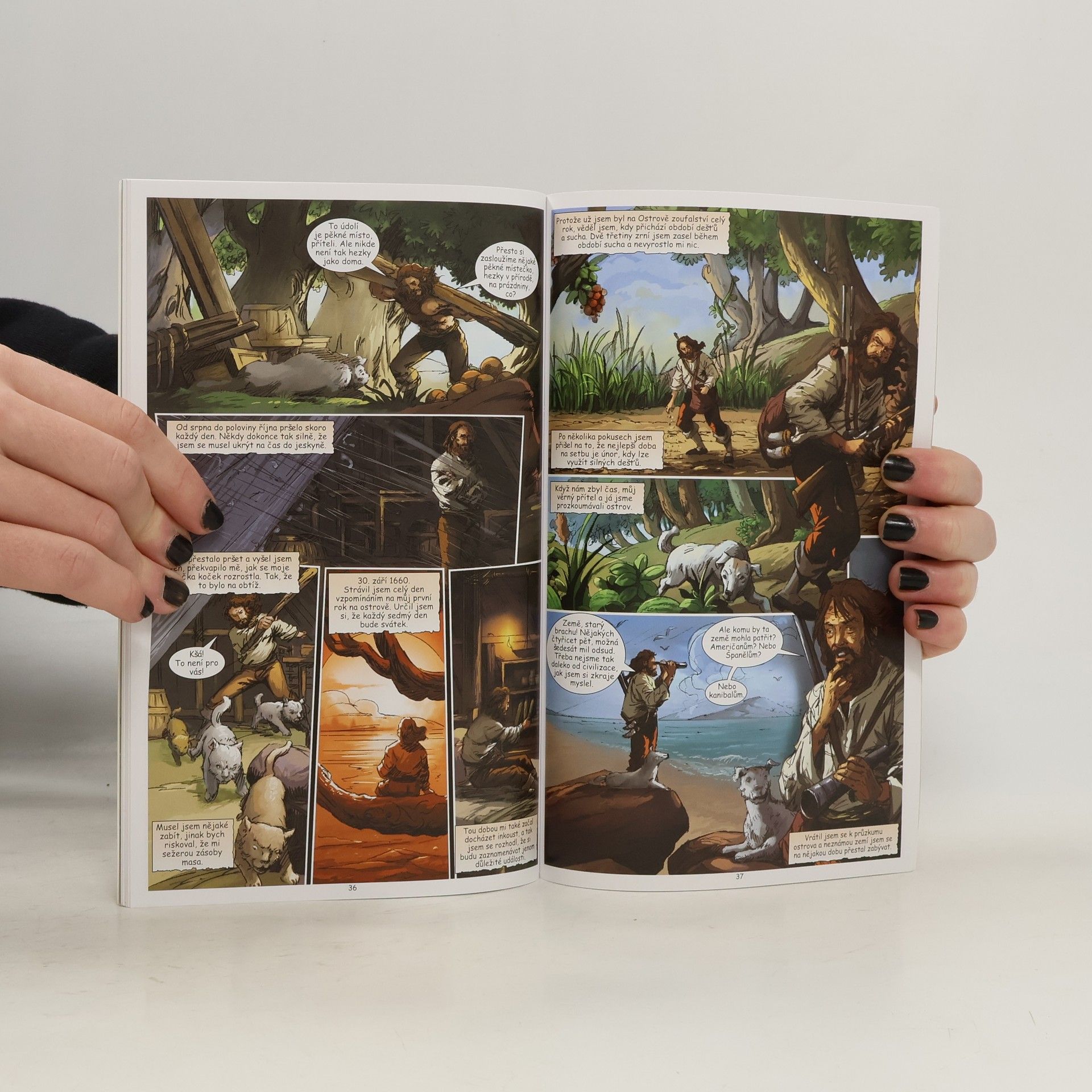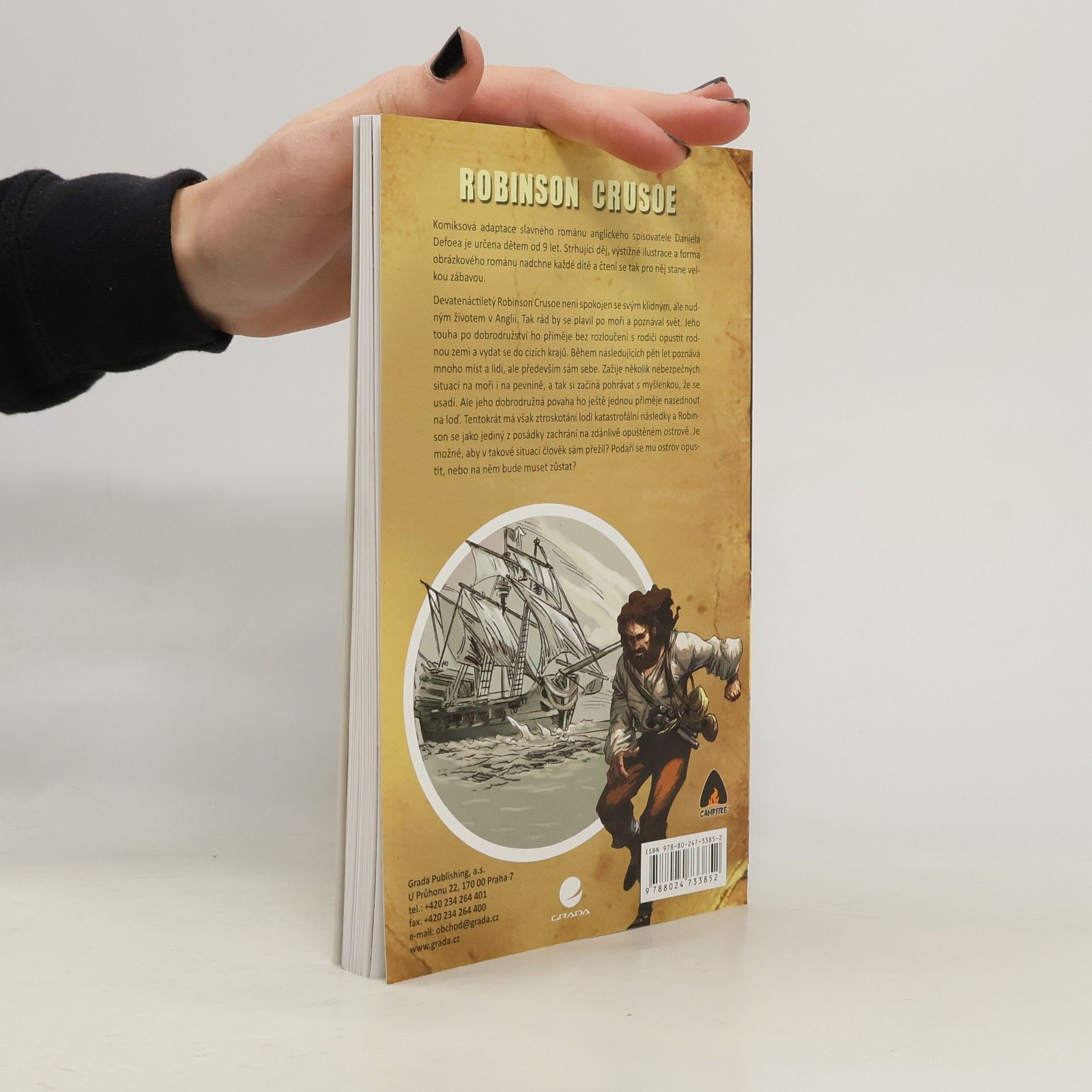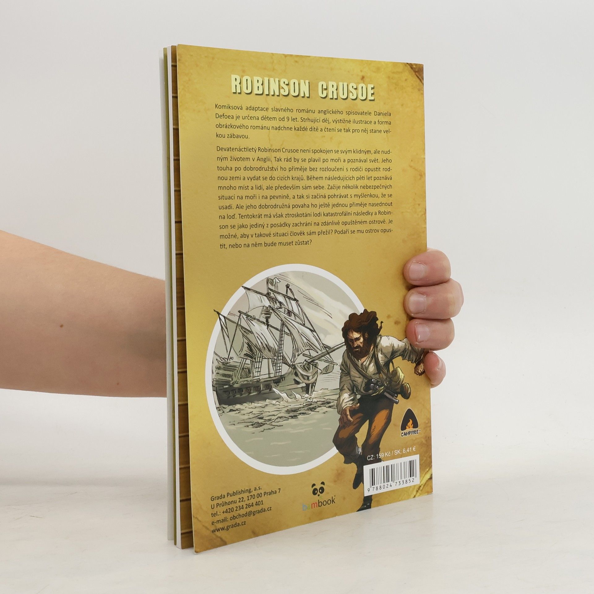Komiksová adaptace slavného románu anglického spisovatele Daniela Defoa je určena dětem od 9 let. Strhující děj, výstižné ilustrace a forma obrázkového románu nadchne každé dítě a čtení se tak pro něj stane zábavou. Devatenáctiletý Robinson Crusoe není spokojen se svým klidným, ale nudným životem v Anglii. Tak rád by se plavil po moři a poznával svět. Jeho touha po dobrodružství ho přiměje bez rozloučení s rodiči opustit rodnou zemi a vydat se do cizích krajů. Během následujících pěti let poznává mnoho míst a lidí, ale především sám sebe. Zažije několik nebezpečných situací na moři i na pevnině, a tak si začíná pohrávat s myšlenkou, že se usadí. Ale jeho dobrodružná povaha ho ještě jednou přiměje nasednout na loď. Tentokrát má však ztroskotání lodi katastrofální následky a Robinson se jako jediný z posádky zachrání na zdánlivě opuštěném ostrově. Je možné, aby v takové situaci člověk sám přežil? Podaří se mu ostrov opustit, nebo na něm bude muset zůstat?