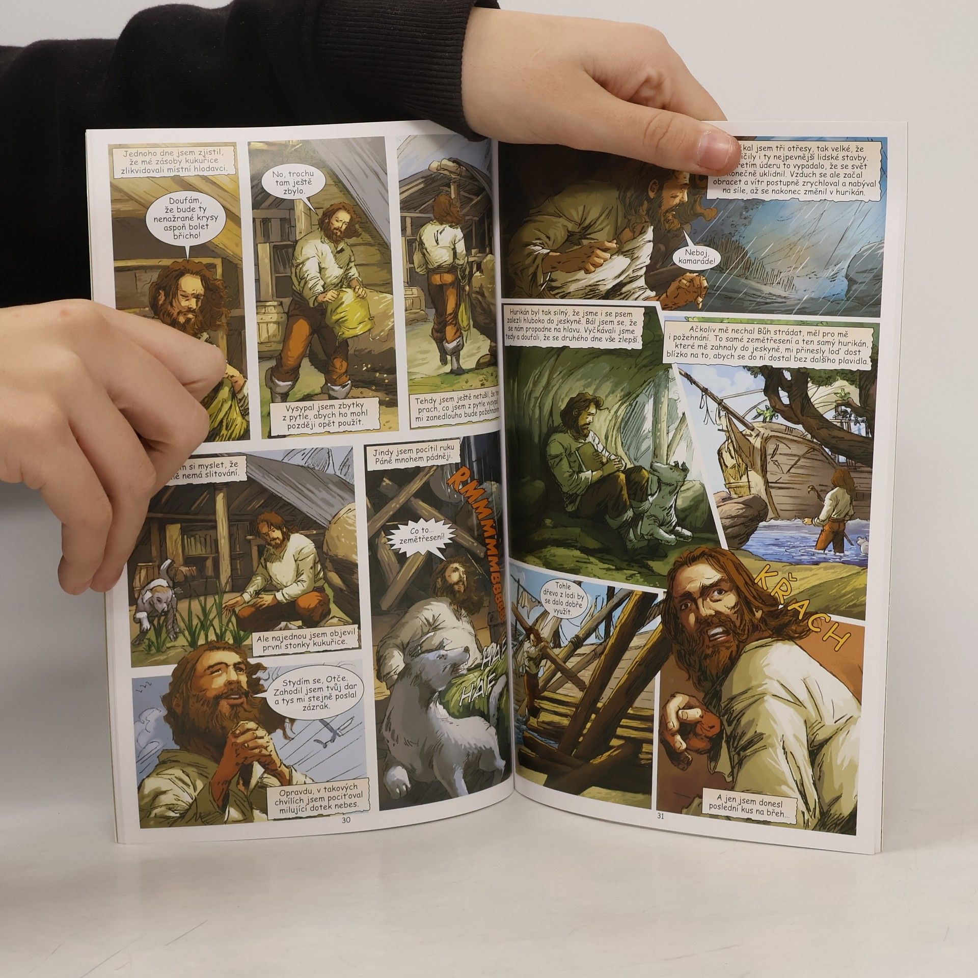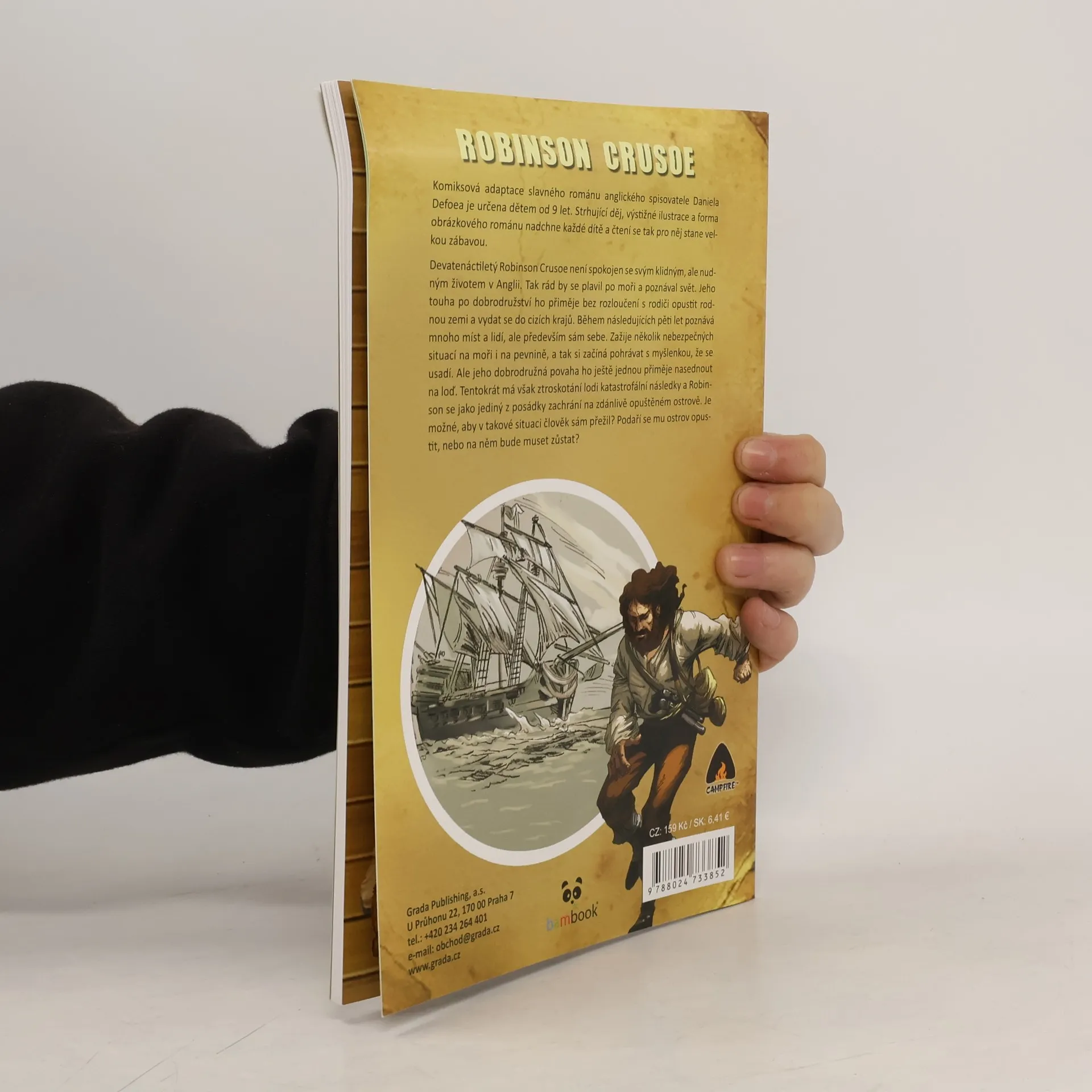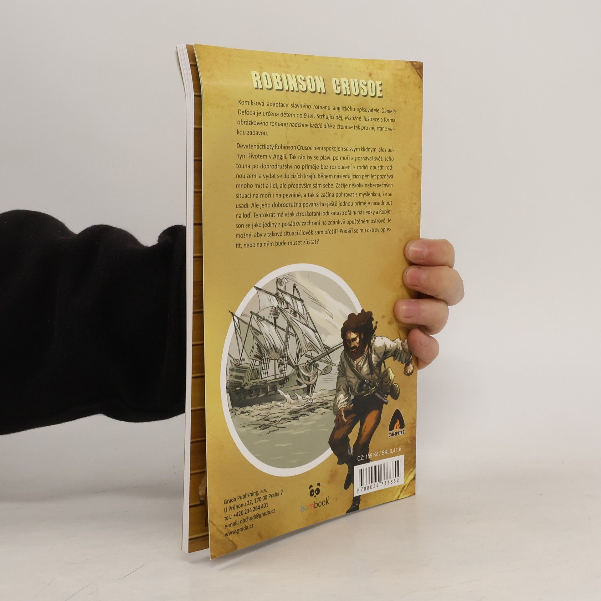 Komiksová adaptace slavného románu anglického spisovatele Daniela Defoa je určena dětem od 9 let. Strhující děj, výstižné ilustrace a forma obrázkového románu nadchne každé dítě a čtení se tak pro něj stane zábavou. Devatenáctiletý Robinson Crusoe není spokojen se svým klidným, ale nudným životem v Anglii. Tak rád by se plavil po moři a poznával svět. Jeho touha po dobrodružství ho přiměje bez rozloučení s rodiči opustit rodnou zemi a vydat se do cizích krajů. Během následujících pěti let poznává mnoho míst a lidí, ale především sám sebe. Zažije několik nebezpečných situací na moři i na pevnině, a tak si začíná pohrávat s myšlenkou, že se usadí. Ale jeho dobrodružná povaha ho ještě jednou přiměje nasednout na loď. Tentokrát má však ztroskotání lodi katastrofální následky a Robinson se jako jediný z posádky zachrání na zdánlivě opuštěném ostrově. Je možné, aby v takové situaci člověk sám přežil? Podaří se mu ostrov opustit, nebo na něm bude muset zůstat?