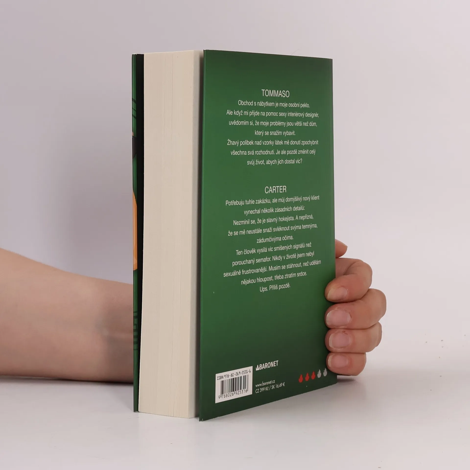 Důležité je zachovat klid a bezhlavě se nezamilovat... Ovšem co když už je pozdě?! TOMMASO Obchod s nábytkem je moje osobní peklo. Ale když mi přijde na pomoc sexy bytový designér, uvědomím si, že moje problémy jsou větší než dům, který se snažím vybavit. Spalující polibek nad vzorky látek mě donutí zpochybnit všechna svá dosavadní rozhodnutí. Je už pozdě změnit celý svůj život, abych jeho polibků měl víc a víc? CARTER Tuhle zakázku potřebuju, ale můj nový klient vynechává pár zásadních detailů: Nezmíní se, že je slavný hokejista. A odmítá si připustit, že se mě neustále snaží svléknout svýma temnýma, zádumčivýma očima. Ten člověk vysílá víc smíšených signálů než porouchaný semafor. Nikdy v životě jsem nebyl sexuálně frustrovanější. Musím se stáhnout, než udělám nějakou hloupost, třeba ztratím srdce. Ups. Příliš pozdě