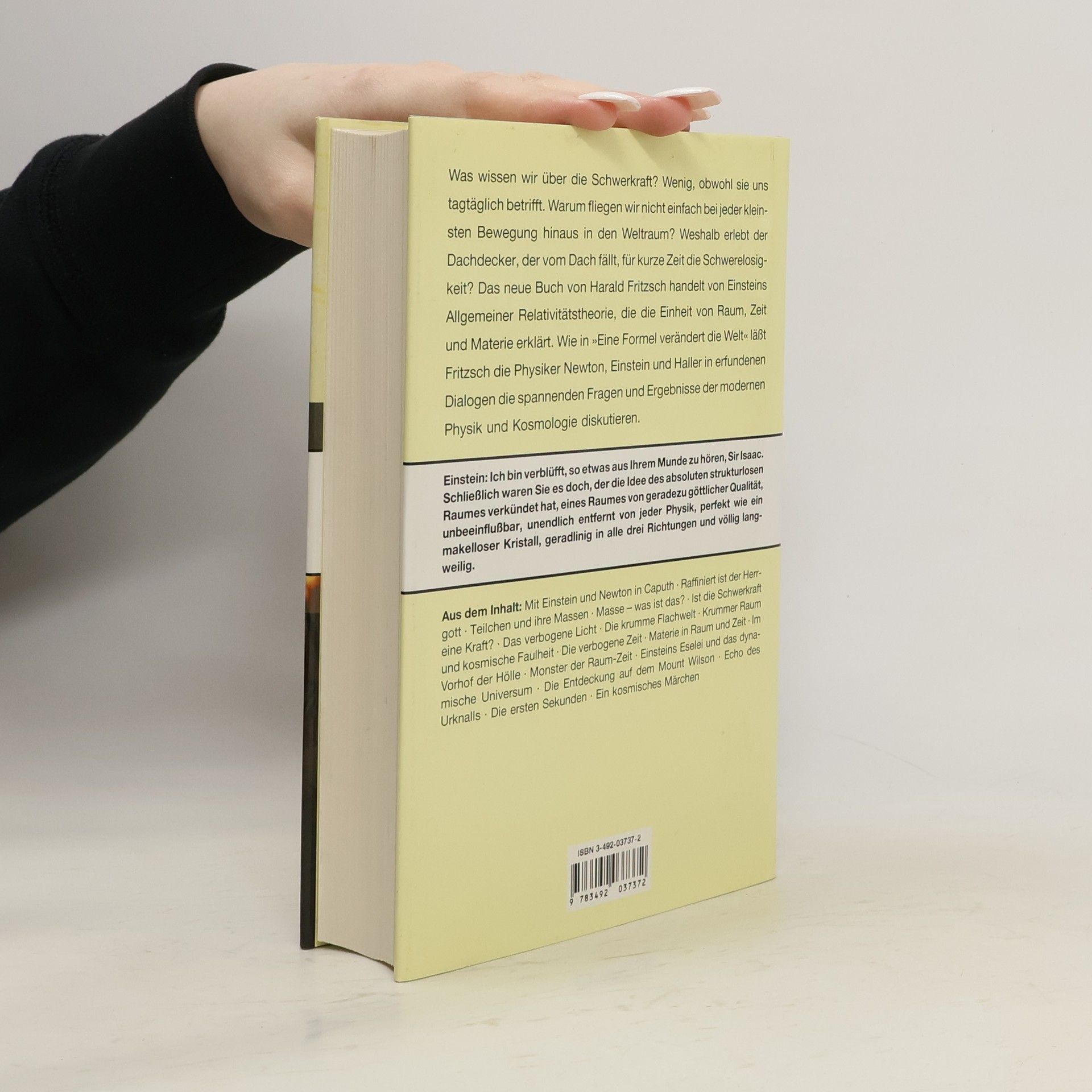 Harald Fritzsch, Professor für theoretische Physik und Sachbuchautor, gibt eine Einführung in Einsteins Theorie der Gravitation. Wie schon in einer früheren Publikation läßt er die Physiker Isaac Newton, Albert Einstein und den (erfundenen) Vertreter der modernen Physik Adrian Haller miteinander diskutieren. So gelingt es dem Autor, seinen Lesern auf fast spielerische Art und Weise ein Hauptthema modernen naturwissenschaftlichen Denkens nahezubringen.