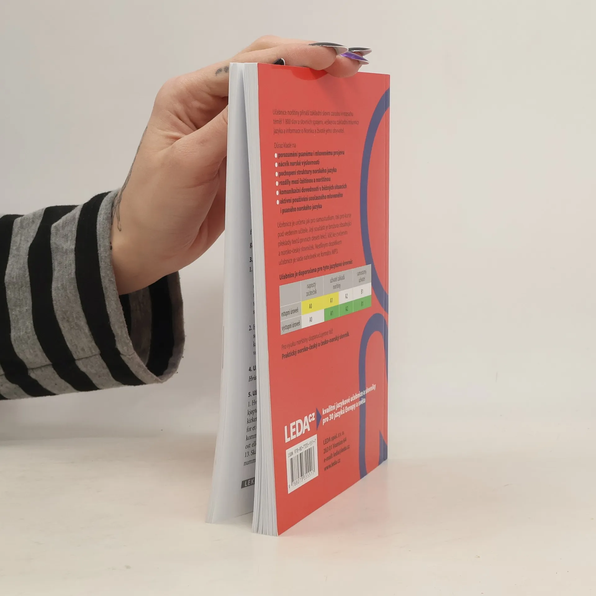 Základní učebnice norštiny je určena všem, kteří se chtějí naučit norsky (bokmal) především samostudiem, dobře ale poslouží i pro jazykové kurzy. V jednotlivých lekcích je zařazen úvodní článek (nebo články), dále dialogy, základní slovíčka pro danou lekci, rozšiřující slovní zásoba, oddíl frází a předložkových vazeb, informace týkající se norských reálií, oddíl s mluvnickým výkladem, cvičení na výslovnost, poslechová cvičení a velké množství cvičení na mluvnické jevy a slovní zásobu. Úvodní texty jednotlivých lekcí obsahují jak užitečné fráze nutné pro dorozumění v běžných situacích, tak zajímavé reálie týkající se Norska a života lidí v této zemi.