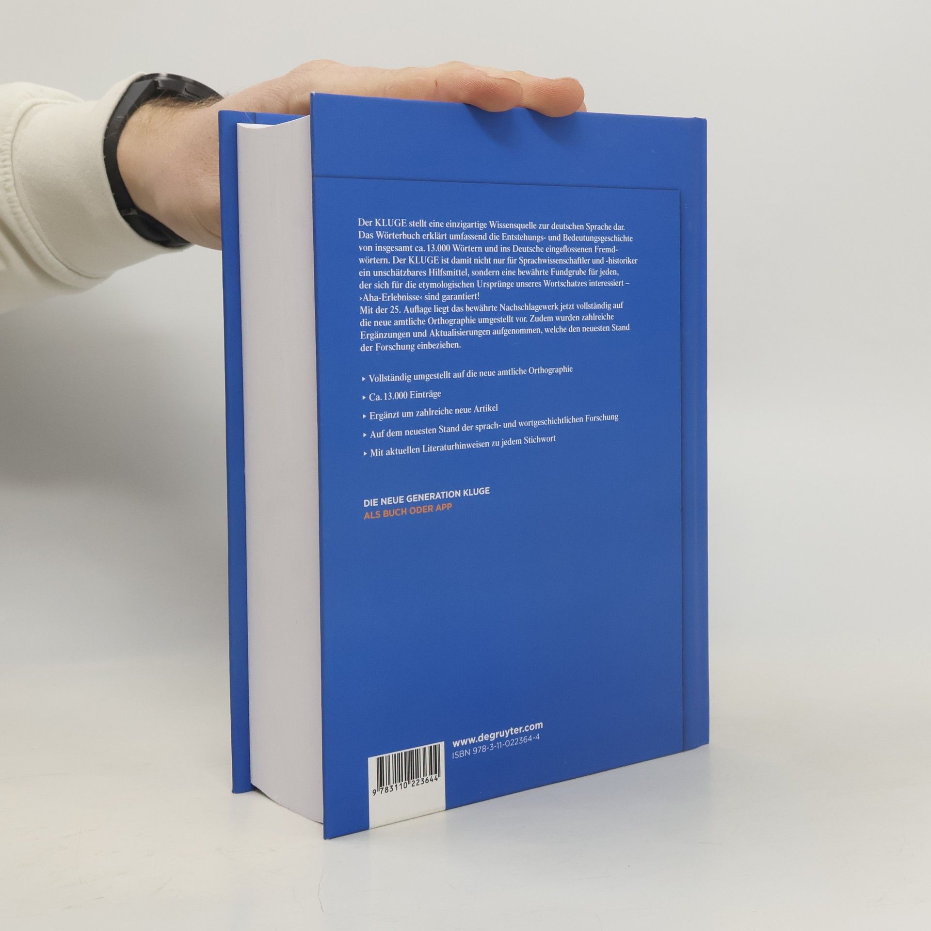 Der KLUGE stellt eine einzigartige Wissensquelle zur deutschen Sprache dar. Das Wörterbuch erklärt umfassend die Entstehungs- und Bedeutungsgeschichte von insgesamt ca. 13.000 Wörtern und ins Deutsche eingeflossenen Fremdwörtern. Der KLUGE ist damit nicht nur für Sprachwissenschaftler und -historiker ein unschätzbares Hilfsmittel, sondern eine bewährte Fundgrube für jeden, der sich für die etymologischen Ursprünge unseres Wortschatzes interessiert – „Aha-Erlebnisse“ sind garantiert! Mit der 25. Auflage liegt das bewährte Nachschlagewerk jetzt vollständig auf die neue amtliche Orthographie umgestellt vor. Zudem wurden zahlreiche Ergänzungen und Aktualisierungen aufgenommen, welche den neuesten Stand der Forschung einbeziehen. Differenzierte Suchkriterien: Lemma, Erstbezeugung nach Jahrhunderten, Worte in Fremdsprachen, Literaturangaben und Volltext Vollständig umgestellt auf die neue amtliche Orthographie Ca. 13.000 Einträge Ergänzt um zahlreiche neue Artikel Auf dem neuesten Stand der sprach- und wortgeschichtlichen Forschung Mit aktuellen Literaturhinweisen zu jedem Stichwort