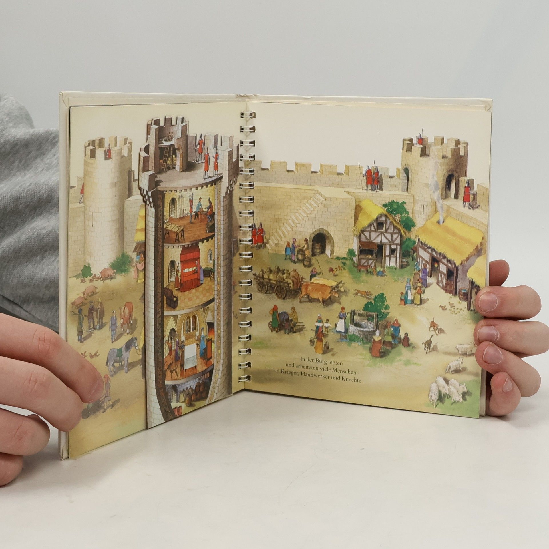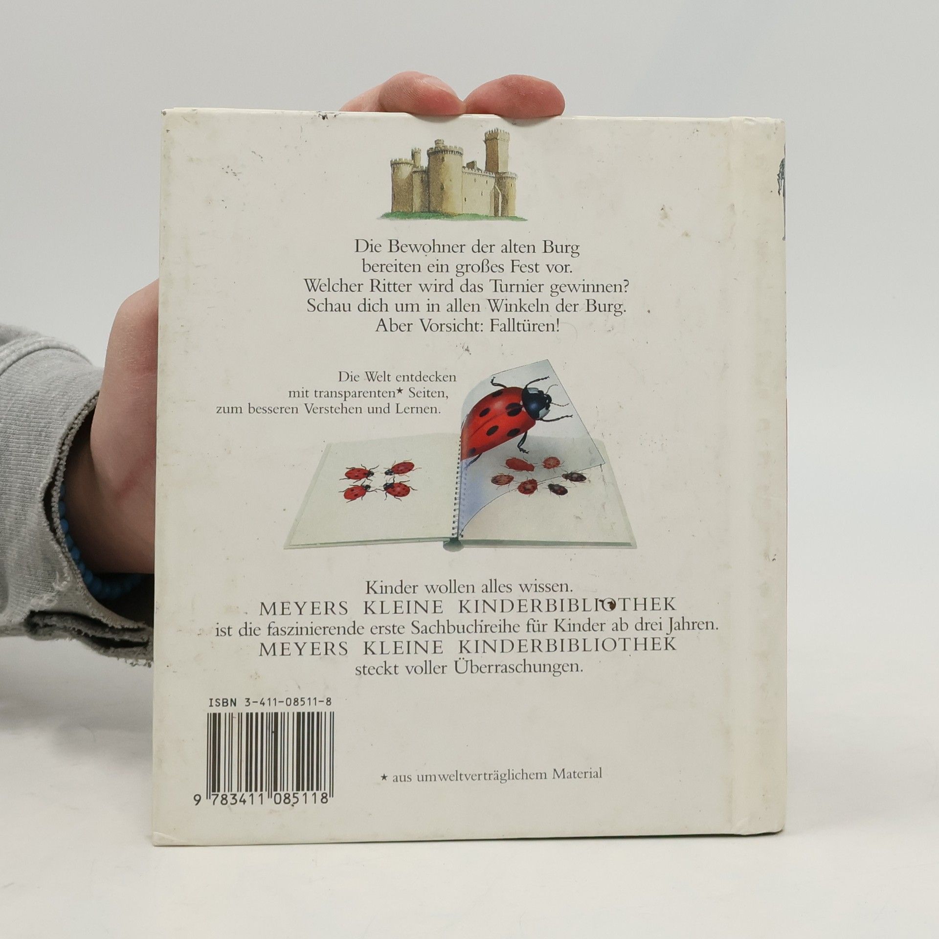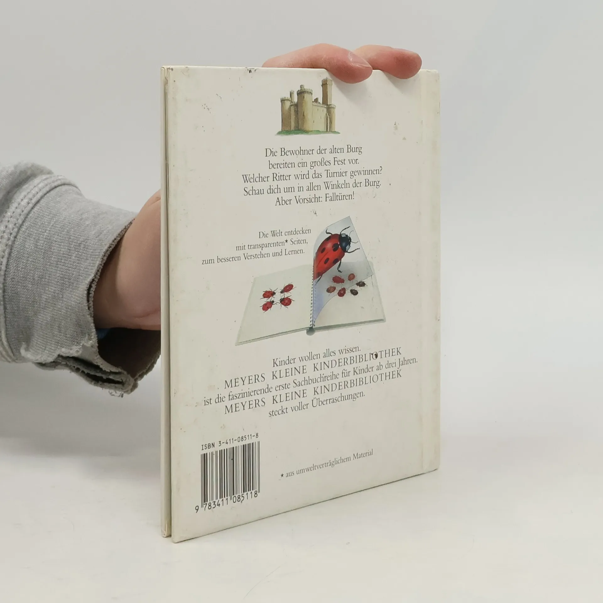 Durch spannende Effekte vermittelt die Bilderbuchreihe „Meyers kleine Kinderbibliothek“ erstes Sachwissen für Kinder ab 3 Jahren. Transparente Folien zeigen beim Umblättern das Innenleben von Dingen, machen Verdecktes sichtbar oder veranschaulichen Veränderungen. In diesem Band lernen die Kleinsten spielerisch, was sich hinter den Begriffen Zugbrücke, Fallgitter und Verlies verbirgt, wie es innerhalb der Burgmauern aussah, wer dort lebte, aus welchen Teilen eine Ritterrüstung besteht oder wie es beim Kampf um die Burg zuging.