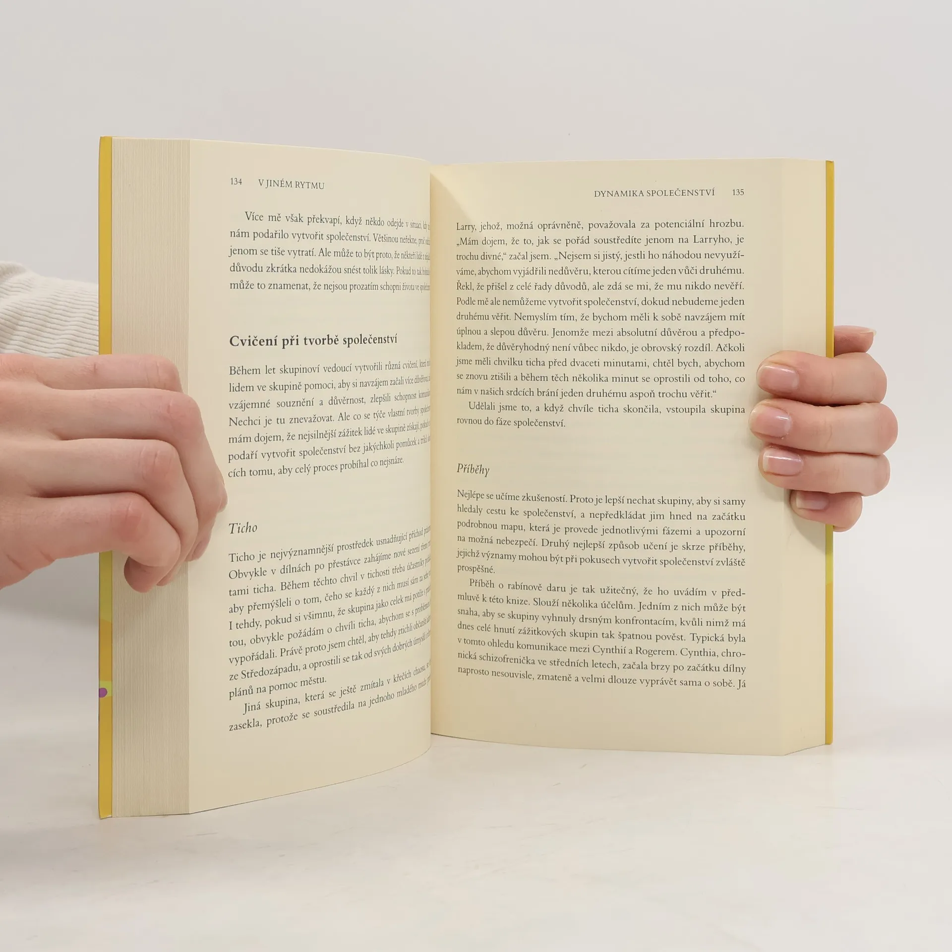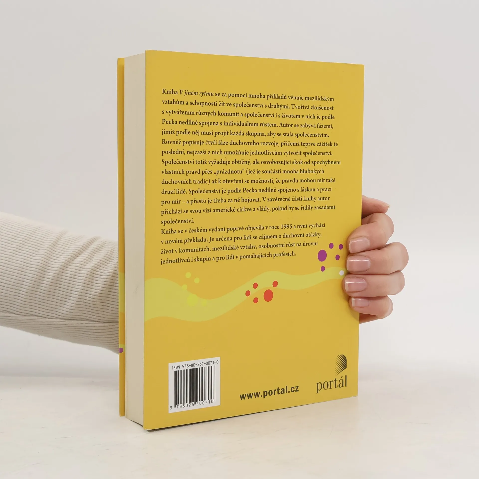 Kniha se zaměřuje na mezilidské vztahy a schopnost žít ve společenství. Autor, M. Scott Peck, pomocí konkrétních a často vtipných příkladů zkoumá, jak je tvořivá zkušenost vytváření různých komunit spojena s individuálním růstem. Popisuje fáze, kterými musí každá skupina projít, aby se stala společenstvím, a zároveň se věnuje duchovnímu rozvoji, přičemž dosažení nejvyšší fáze umožňuje jednotlivcům vytvářet společenství. To vyžaduje obtížný, ale osvobozující skok od zpochybnění vlastních pravd přes „prázdnotu“, která je součástí mnoha duchovních tradic, až k otevřenosti vůči pravdám druhých, což prohlubuje vlastní náhled. Kniha, poprvé vydaná v češtině v roce 1995, nyní vychází v novém překladu a je určena lidem se zájmem o duchovní otázky, život v komunitách, mezilidské vztahy a osobnostní růst. Peck, americký psychoterapeut, je autorem esejistických knih, které se staly klasikou duchovní a populárně psychologické literatury. V češtině vyšlo několik jeho titulů, včetně Nevyšlapanou cestou a Dále nevyšlapanou cestou.