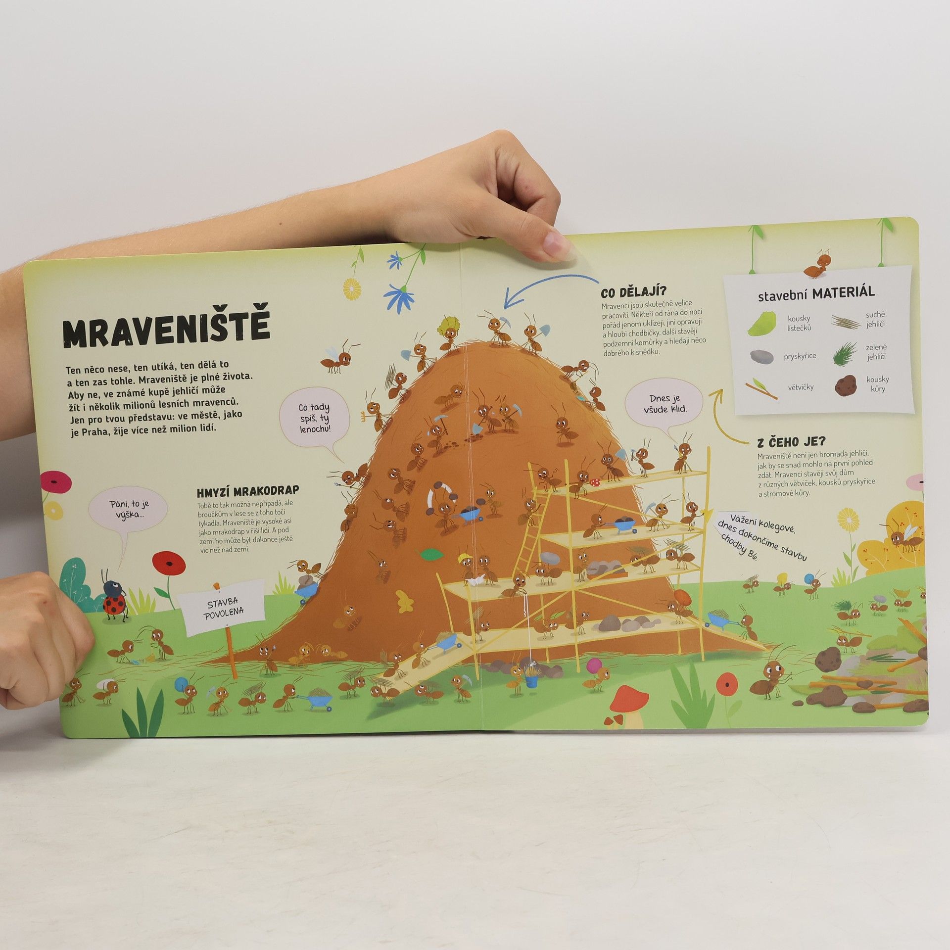 Představ si, že jsi mravenec a strávíš jeden den v mraveništi. Jaké to asi bude? Celý den budeš pořád někam utíkat – uklízet a hloubit chodbičky, hledat různá semínka, abys měl co jíst, a až tě to přestane bavit, vylezeš si úplně nahoru na vršek mravenčí kupy, aby ses opaloval a nahříval si tělíčko. Ale dost už bylo řečí. Víš co? Udělej si pohodlí a pojď se s námi podívat přímo do mraveniště…