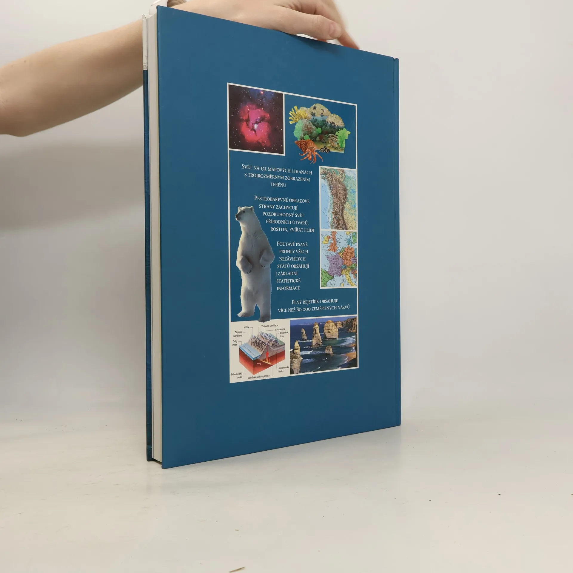 Svět na 151 mapových stranách s trojrozměrným zobrazením terénu. Pestrobarevné obrazové strany zachycují pozoruhodný svět přírodních útvarů, rostlin, zvířat i lidí. Poutavě psané profily všech nezávislých států obsahují i základní statistické informace. Plný rejstřík obsahuje více než 80 000 zeměpisných názvů. Obsah: 1. Příběh planety Země 2. Svět na mapách 3. Státy světa 4. Místopisný přehled