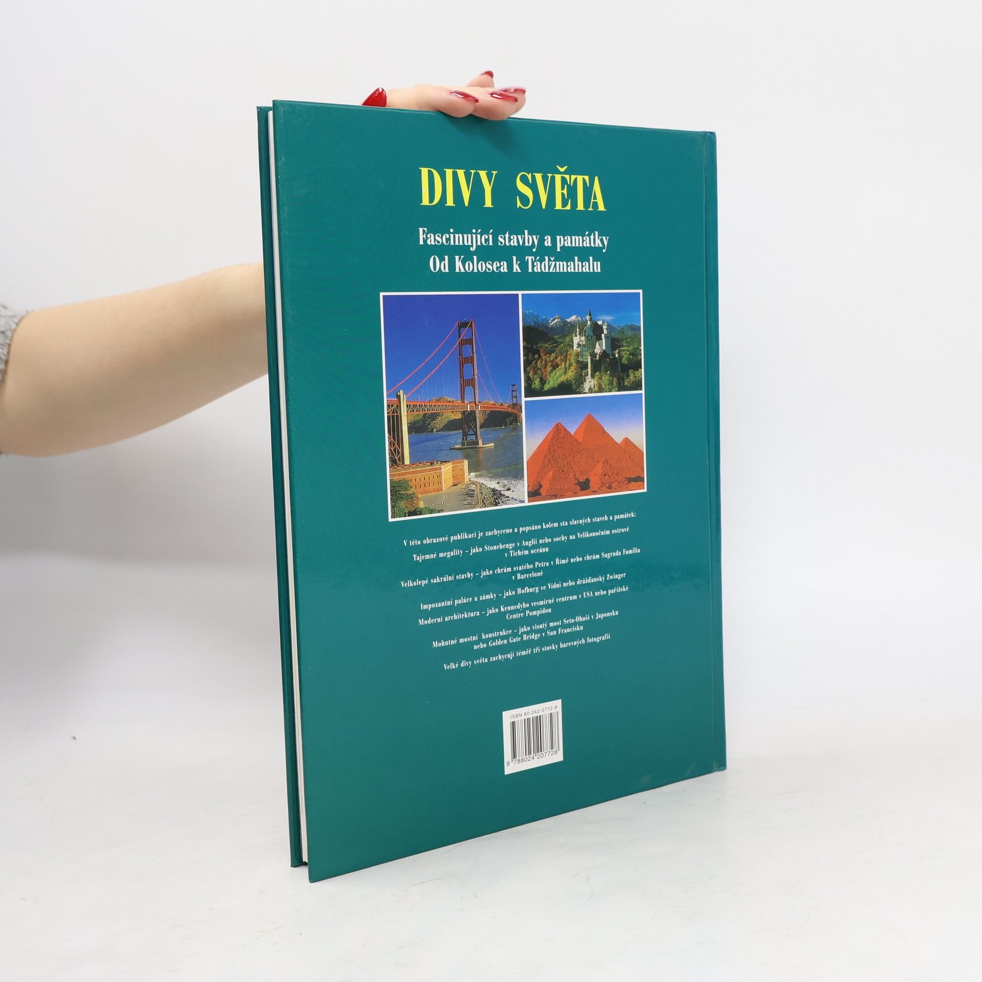 Tato obrazová publikace předvádí na stovku pozoruhodných a facsinujících staveb v rozmezí deseti tisíc let. Spektrum je široké, chrámy kostely, paláce a zámky, ale i ulice plné vody, přehrady, železnice a samozřejmě i věže a mrakodrapy našeho století. Publikace je rozdělena podle světadílů, stati udávají jednotlivé tematické okruhy jako například kostely skouží fundované historické informaci a usnadňuje přehled. Každé stabě je věnována jedna dvojstrana. Fascinující obrazy - kolem tři set dokonalých barevných fotografií - předvádějí velké divy tohoto světa.