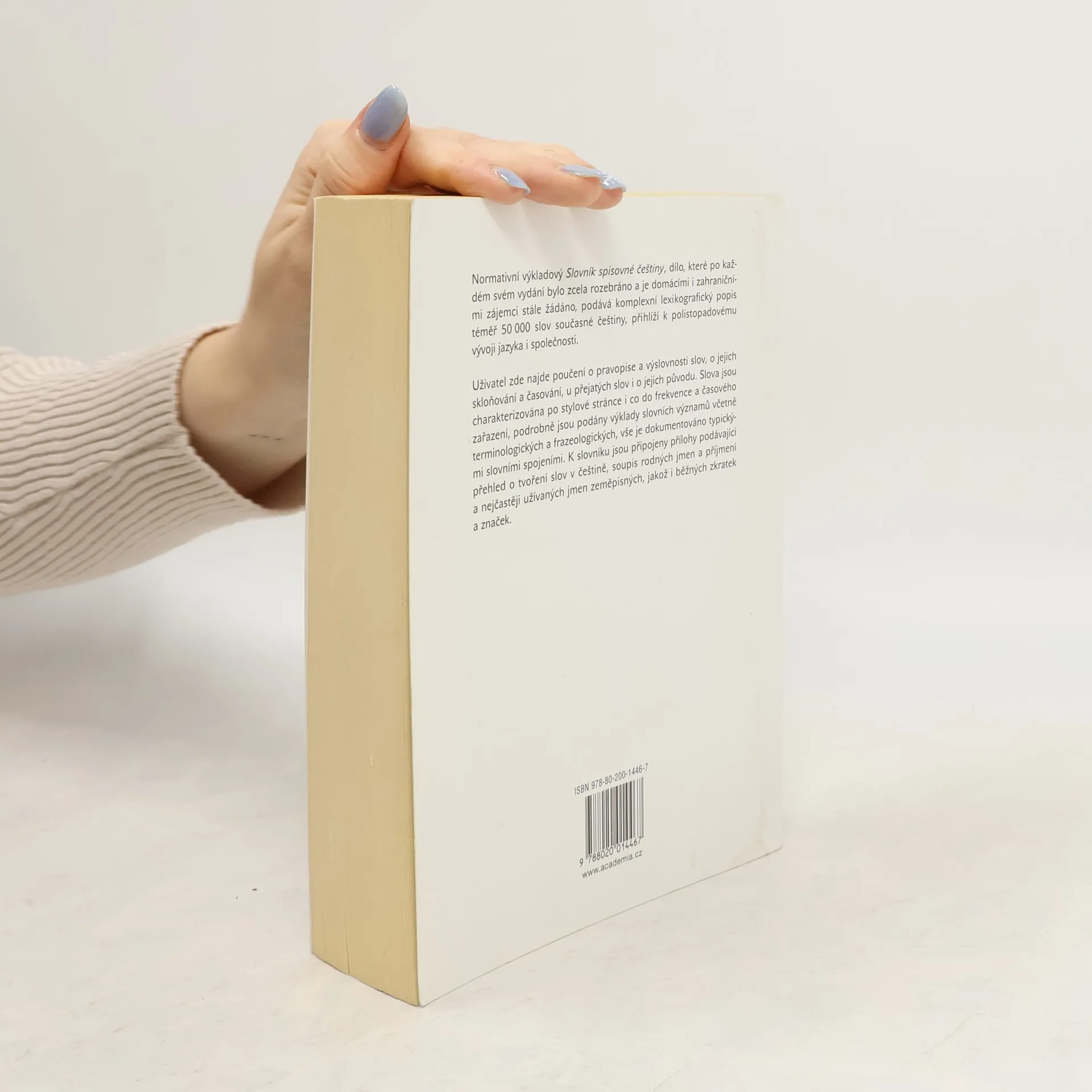 Slovník spisovné češtiny podává komplexní lexikografický popis téměř 50 000 slov současné češtiny, přihlíží k současnému vývoji jazyka i společnosti. Uživatel zde najde poučení o pravopise a výslovnosti slov, o jejich skloňování a časování, u přejatých slov i o jejich původu. Přílohy obsahují přehled o tvoření slov češtině, soupis rodných jmen a příjmení, zeměpisných jmen i běžných zkratek a značek. Pravopis a výslovnost slov, skloňování a časování, výklady slovních významů, synonyma, antonyma, homonyma, přehled tvoření slov v češtině, soupis rodných jmen a příjmení, nejužívanější zeměpisná jména, běžné zkratky a značky.