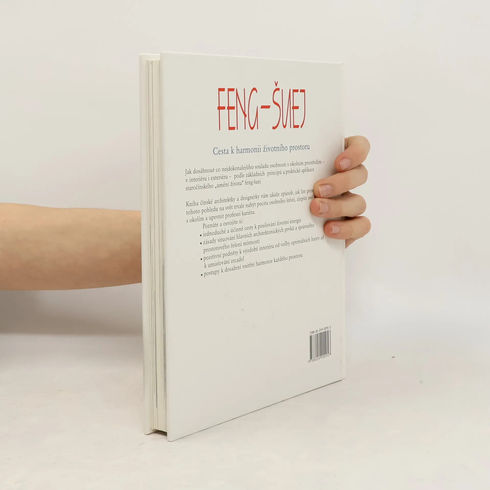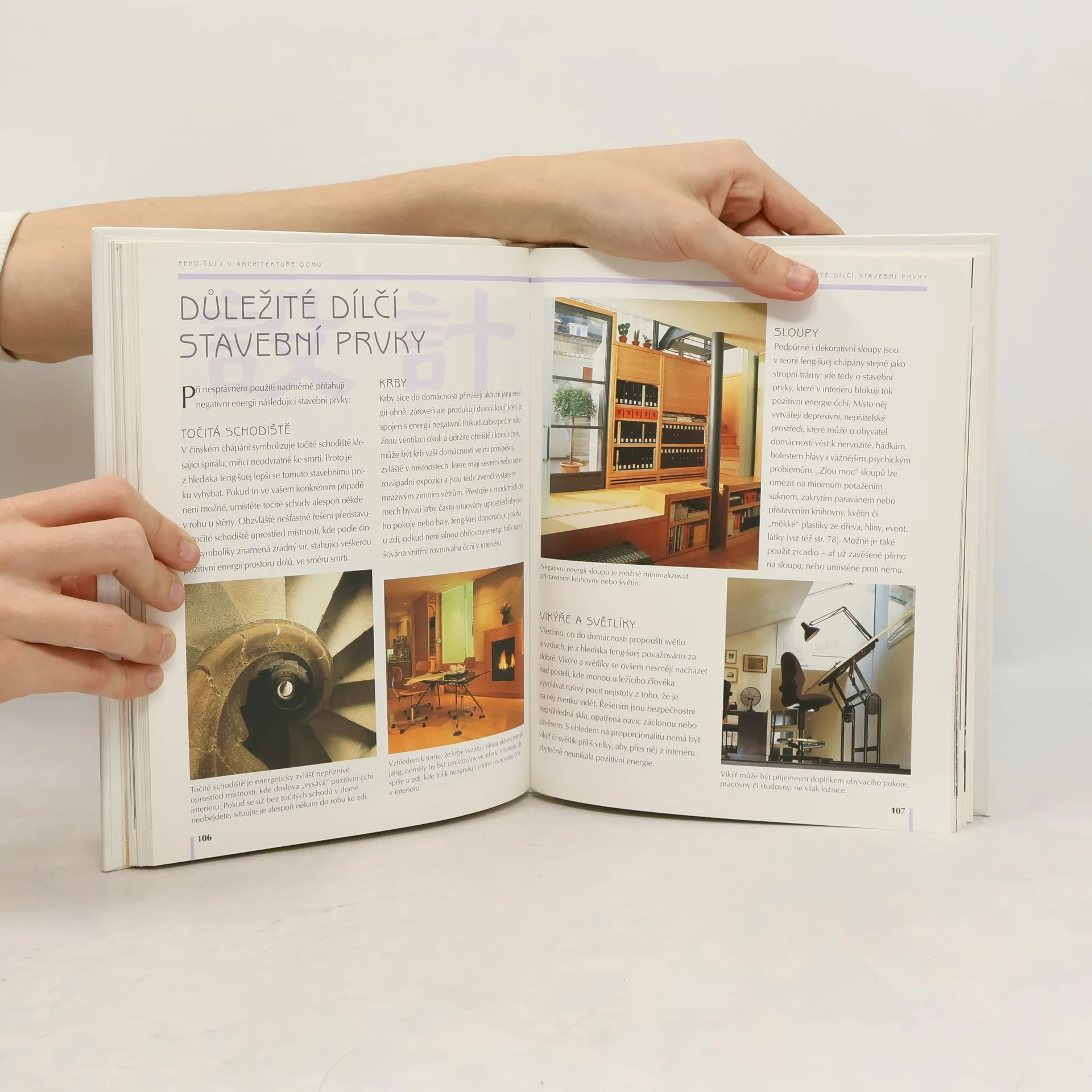 Čínská architektka a antropoložka popisuje starou filozofii umění nejprve teoreticky a v symbolech a přibližuje čtenáři jednotlivé postupy využívání principů feng-šuej. Poté učí dívat se na barvy, rozvržení interiérů, na rozmístění nábytku, účinek osvětlení, zrcadel, uměleckých děl z hlediska prostorové orientace. Neopomíjí vliv výhledu z okna nebo negativních jevů životního prostředí. Zvláštní kapitola je věnována účinku rostlin a bylin na zdraví a náladu člověka, ale také například vlivu akupunktury v souvislosti s feng-šuej.