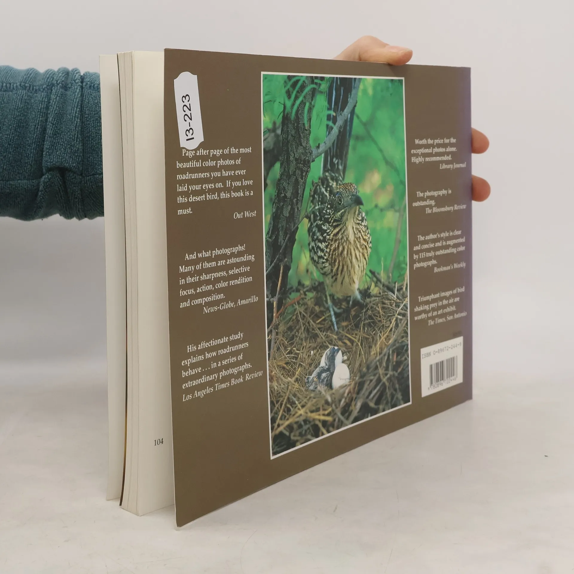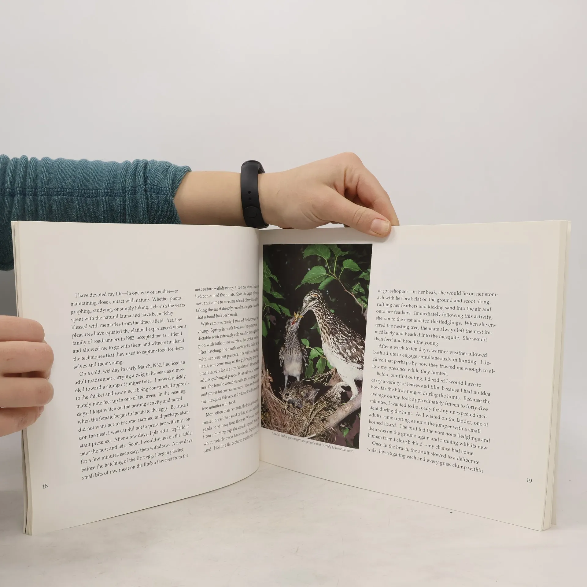 The lifestyle of the roadrunner is vividly captured in this unique book, featuring Wyman Meinzer's photographs and personal observations of several roadrunner families. He documents their daily routines, including courtship, nesting, and feeding their young. In one striking scene, a roadrunner circles a snake, testing its quickness. When the snake strikes, the bird swiftly leaps back and then forward, seizing the rattler by the head and tossing it into the air. After a fierce struggle, the roadrunner kills the snake by repeatedly beating it on the ground before taking it back to feed its fledglings. This method is consistent for all reptiles, including horned lizards and nonvenomous snakes. Meinzer also describes the nurturing behaviors of the roadrunners. After the young hatch, the female stays close to shelter them while the male tirelessly hunts for grubs and insects. When the female needs a break, the male takes over, allowing her to preen in the sun before she ventures into the mesquite thickets to return with food. This intimate portrayal of their lives highlights the dedication and resourcefulness of these remarkable birds.
