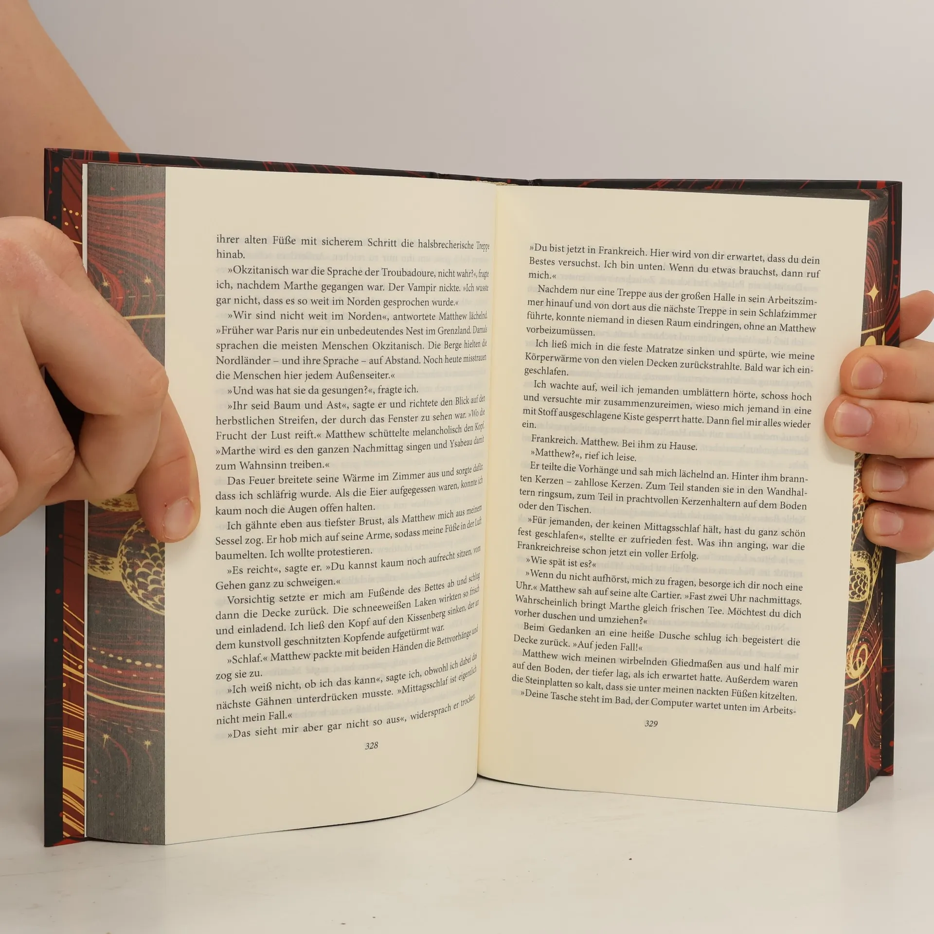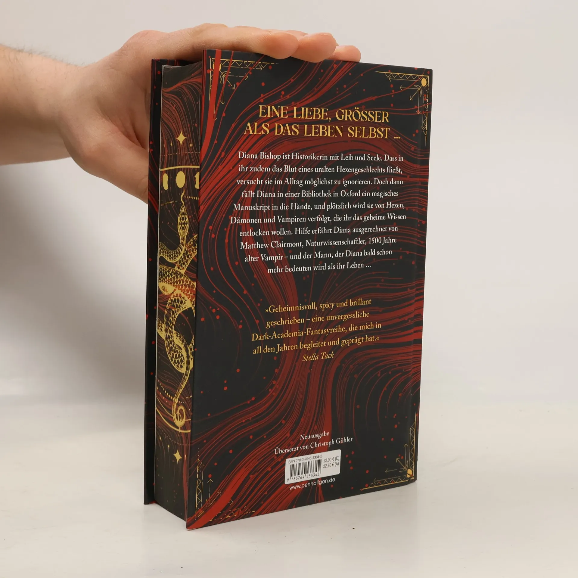 Eine Hexe wider Willen und ein jahrhundertealter Vampir – eine Liebe, die nicht sein darf, und doch so stark ist, dass sie alles überwindet. ***Der gestaltete Buchschnitt ist auf eine limitierte Auflage begrenzt.*** Diana Bishop ist Historikerin mit Leib und Seele. Dass in ihr zudem das Blut eines uralten Hexengeschlechts fließt, versucht sie im Alltag möglichst zu ignorieren. Doch dann fällt Diana in einer Bibliothek in Oxford ein magisches Manuskript in die Hände, und plötzlich wird sie von Hexen, Dämonen und Vampiren verfolgt, die ihr das geheime Wissen über das Schriftstück entlocken wollen. Hilfe erfährt Diana ausgerechnet von Matthew Clairmont, Naturwissenschaftler, 1500 Jahre alter Vampir – und der Mann, der Diana bald schon mehr bedeuten wird als ihr Leben … Dieses Buch gibt es in zwei Versionen: mit und ohne Farbschnitt. Es wird je nach Verfügbarkeit geliefert. Band 1 der opulenten Saga um die epische verbotene Liebe zwischen einer Hexe und einem Vampir. Alle Bände der Reihe: A Discovery of Witches – Die Seelen der Nacht Shadow of Night – Wo die Nacht beginnt The Book of Life – Das Buch der Nacht Time’s Convert – Bis ans Ende der Ewigkeit Dieses Buch gibt es in zwei Versionen: mit und ohne Farbschnitt. Es wird je nach Verfügbarkeit geliefert.