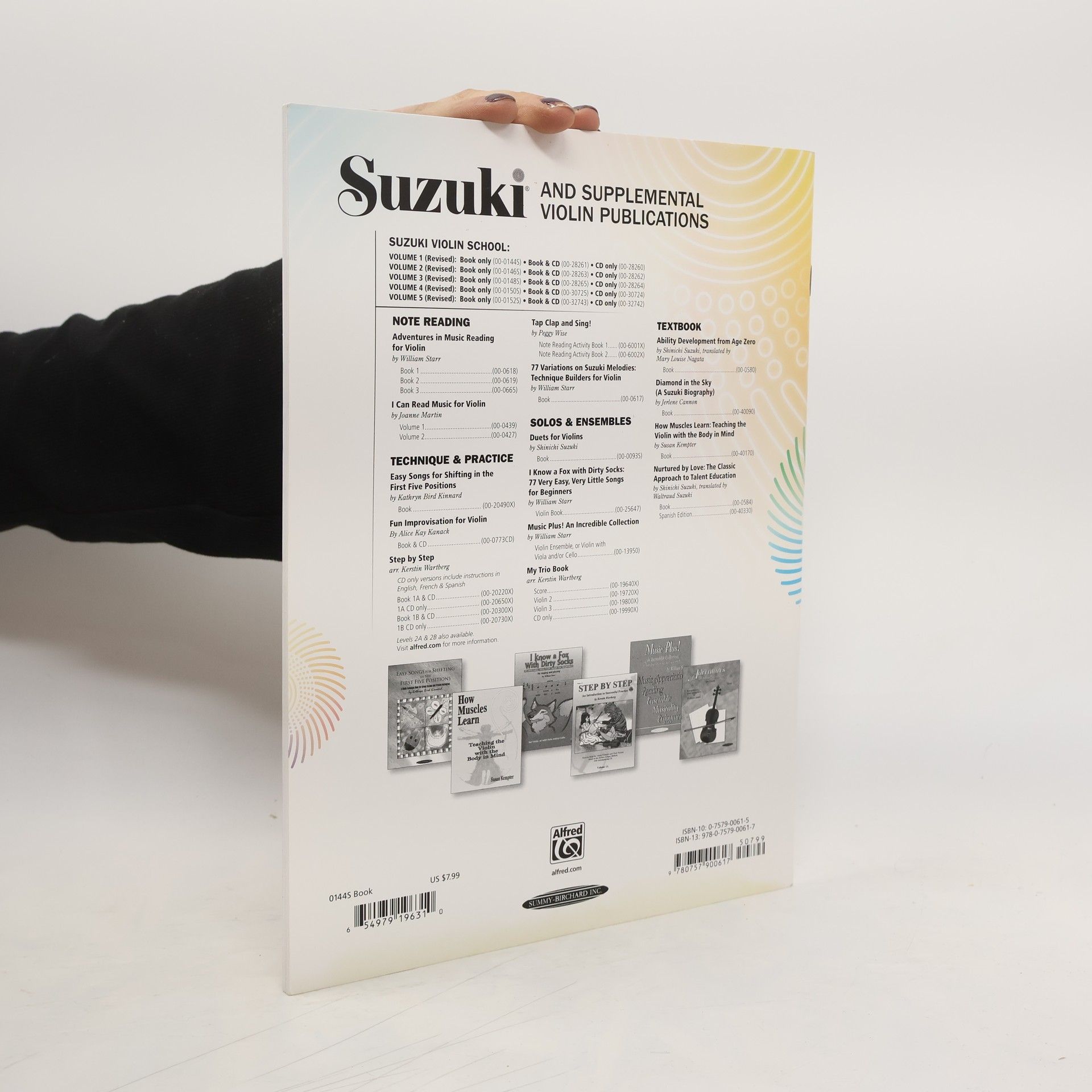 Contents are: Principles of Study and Guidance * Twinkle, Twinkle, Little Star Variations (Shinichi Suzuki) * Lightly Row (Folk Song) * Song of the Wind (Folk Song) * Go Tell Aunt Rhody (Folk Song) * O Come, Little Children (Folk Song) * May Song (Folk Song) * Long, Long Ago (T.H. Bayly) * Allegro (Shinichi Suzuki) * Perpetual Motion (Shinichi Suzuki) * Allegretto (Shinichi Suzuki) * Andantino (Shinichi Suzuki) * Etude (Shinichi Suzuki) * Minuet 1, Minuett III from Suite in G Minor for Klavier, BWV 822 (J.S. Bach) * Minuet 2, Minuet, BWV Anh. II 116 from Notebook for Anna Magdalena Bach (J.S. Bach) * Minuet 3, Minuet BWV Anh. II 114/Anh. III 183 (J.S. Bach) * The Happy Farmer from Album for the Young, Op. 68, No. 10 (R. Schumann) * Gavotte (F.J. Gossec).Revised edition features: New engravings in a 9" x 12" formatNew editing of pieces, including bowings and fingerings16 additional pagesAdditional exercises, some from Dr. Suzuki, plus addition
